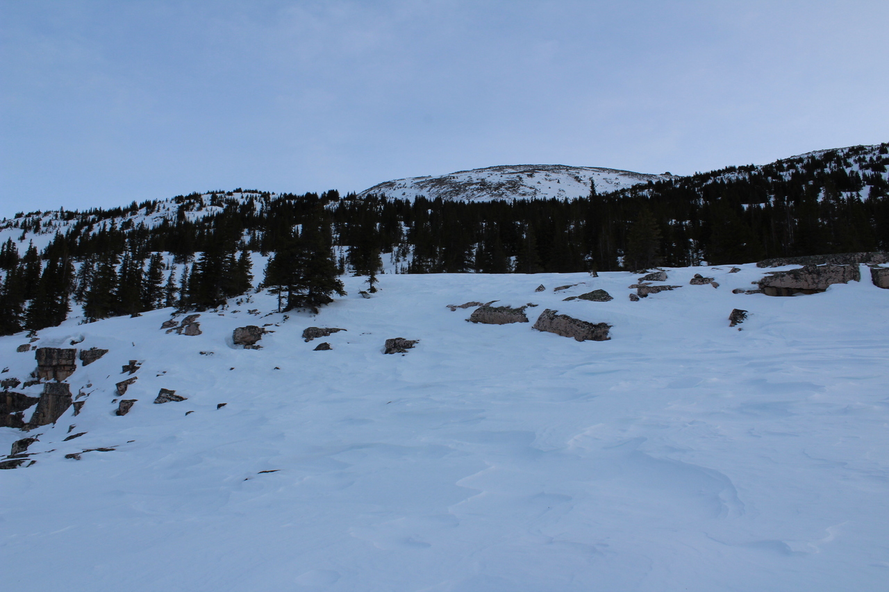 Looking ahead, past the cliffs. The summit of Crystal Ridge is beyond the rocky mound in the center.