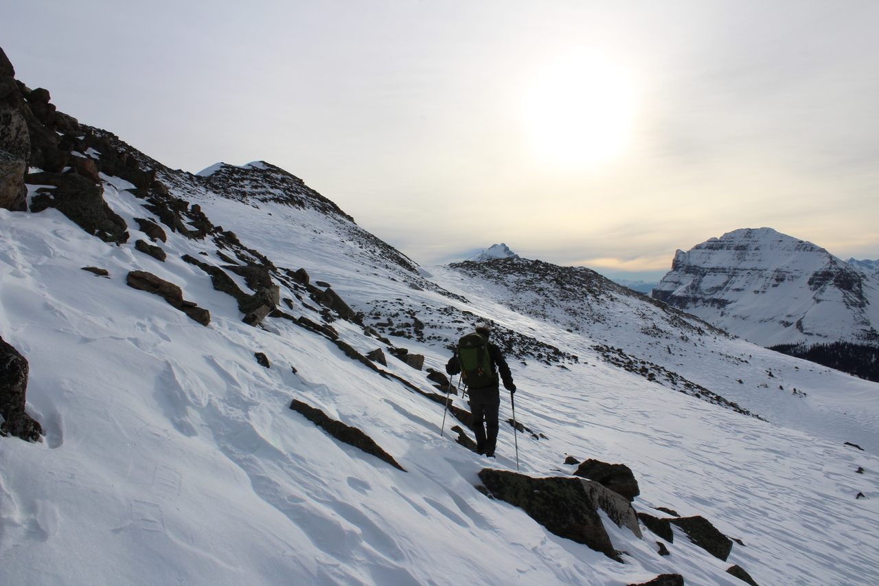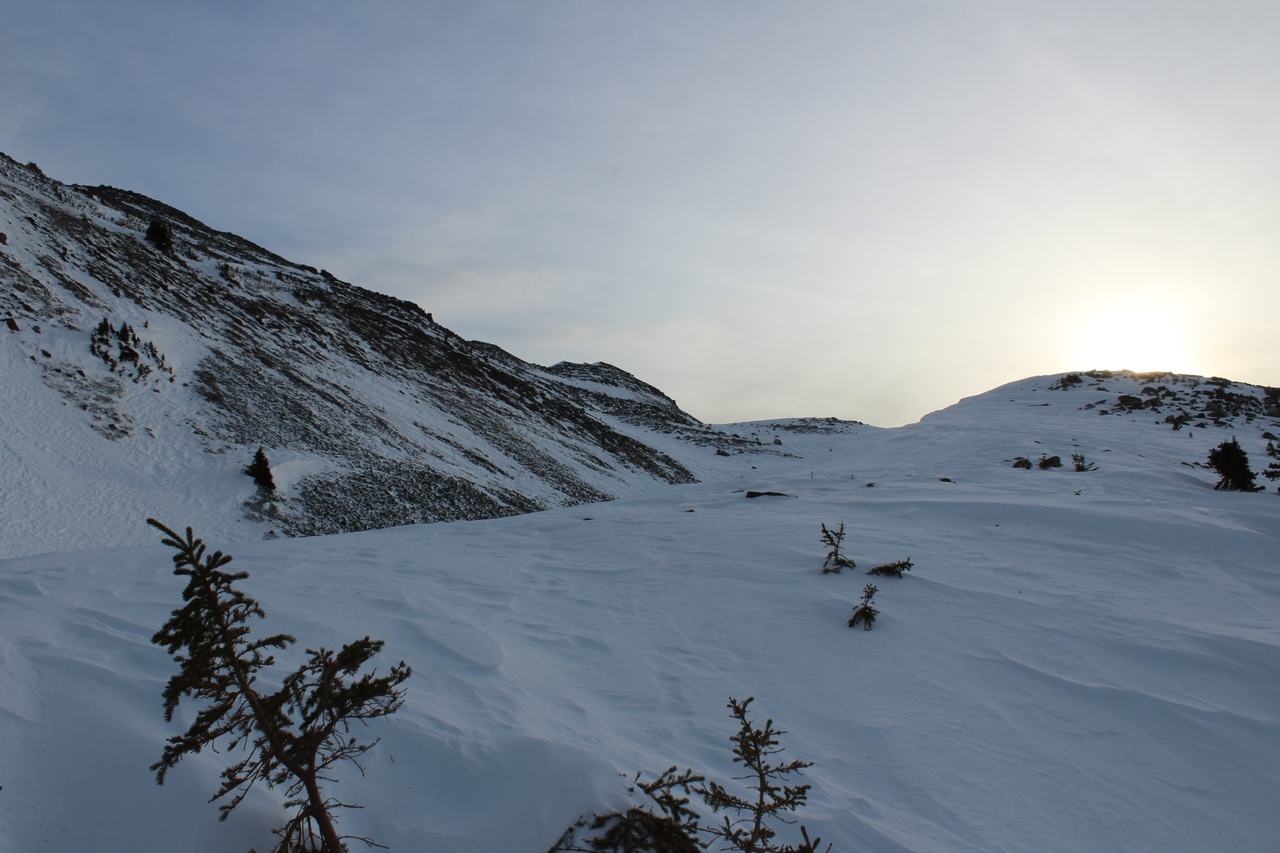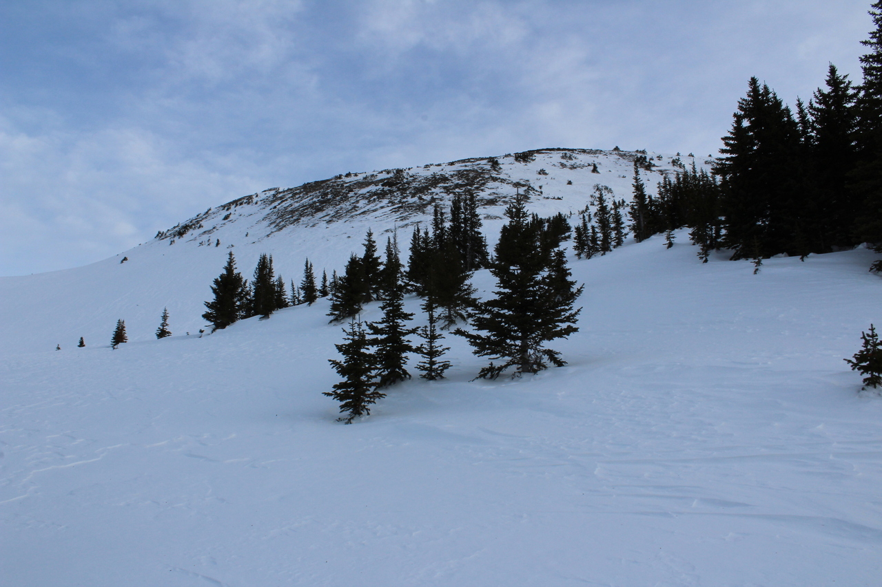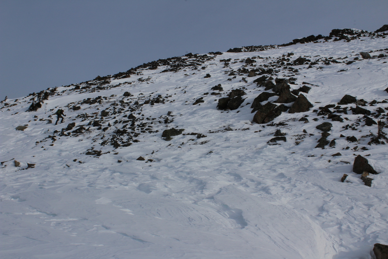 Looking back at our traverse over the open slope...It was steeper than it looked from below, and could be risky if avalanches were of concern. With the snow as wind-hammered as it was however, the slope felt very stable, and I wasn't too worried.