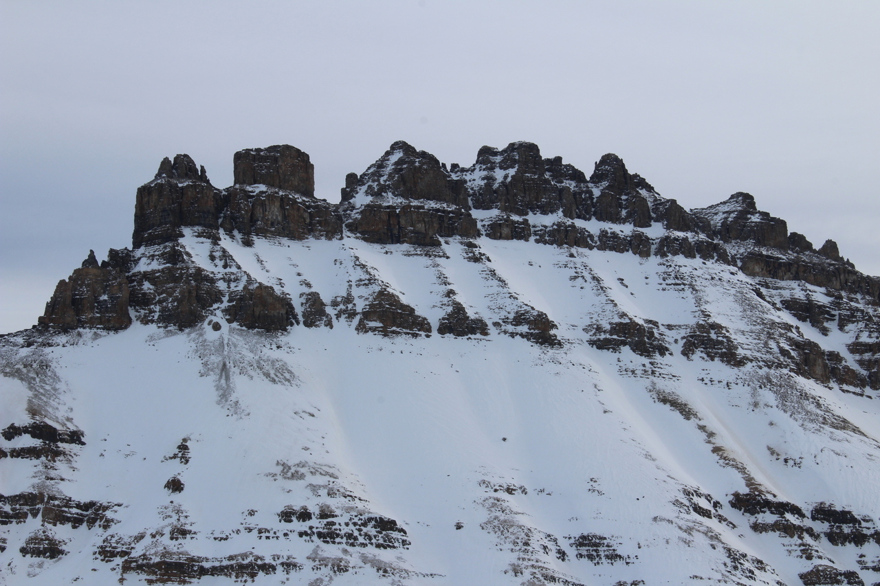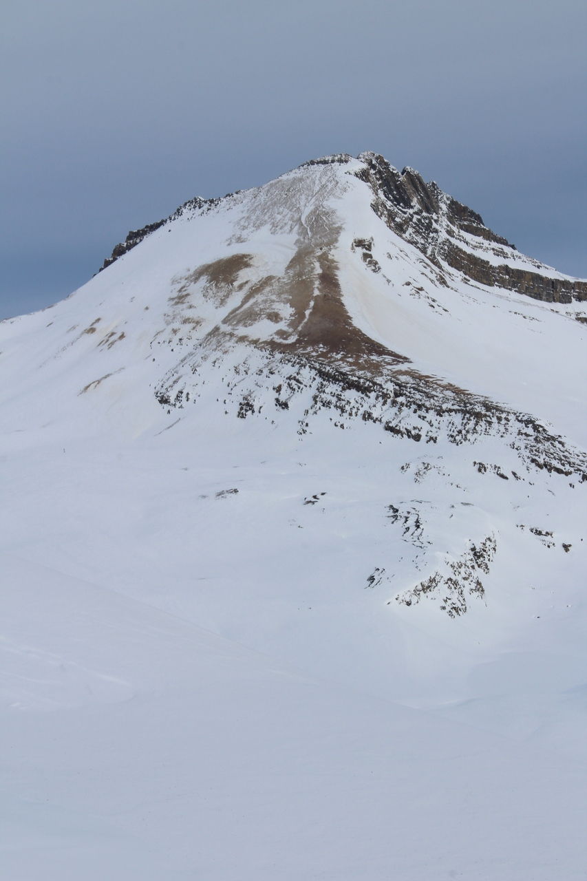 Side-hilling towards the southeast summit (center-left). Although a slide was unlikely, we erred on the side of caution, and stuck to terrain with protruding rocks whenever possible.