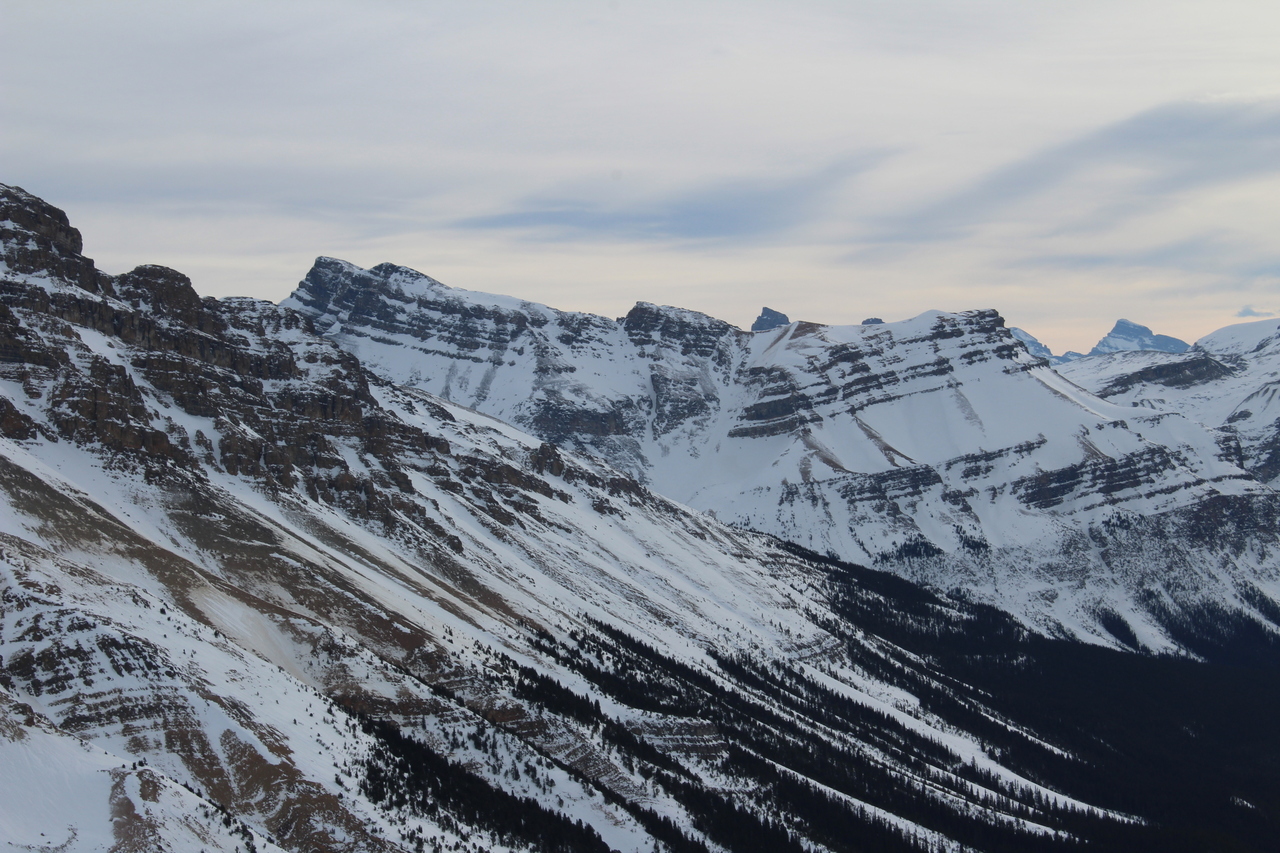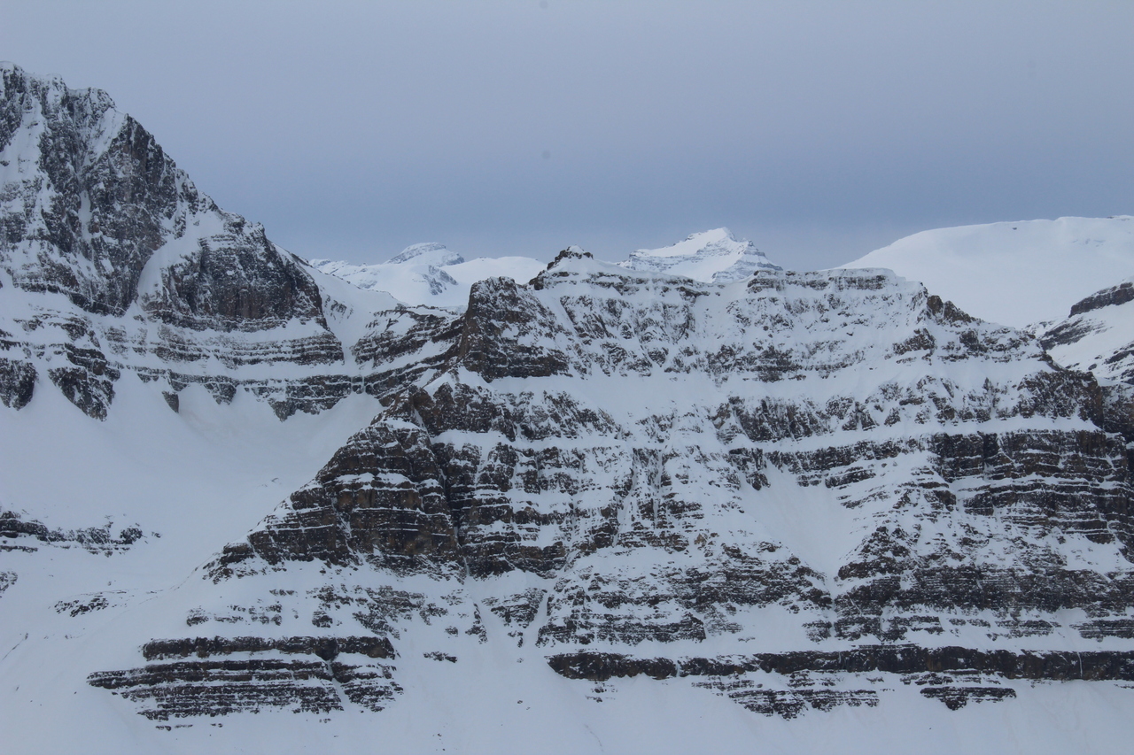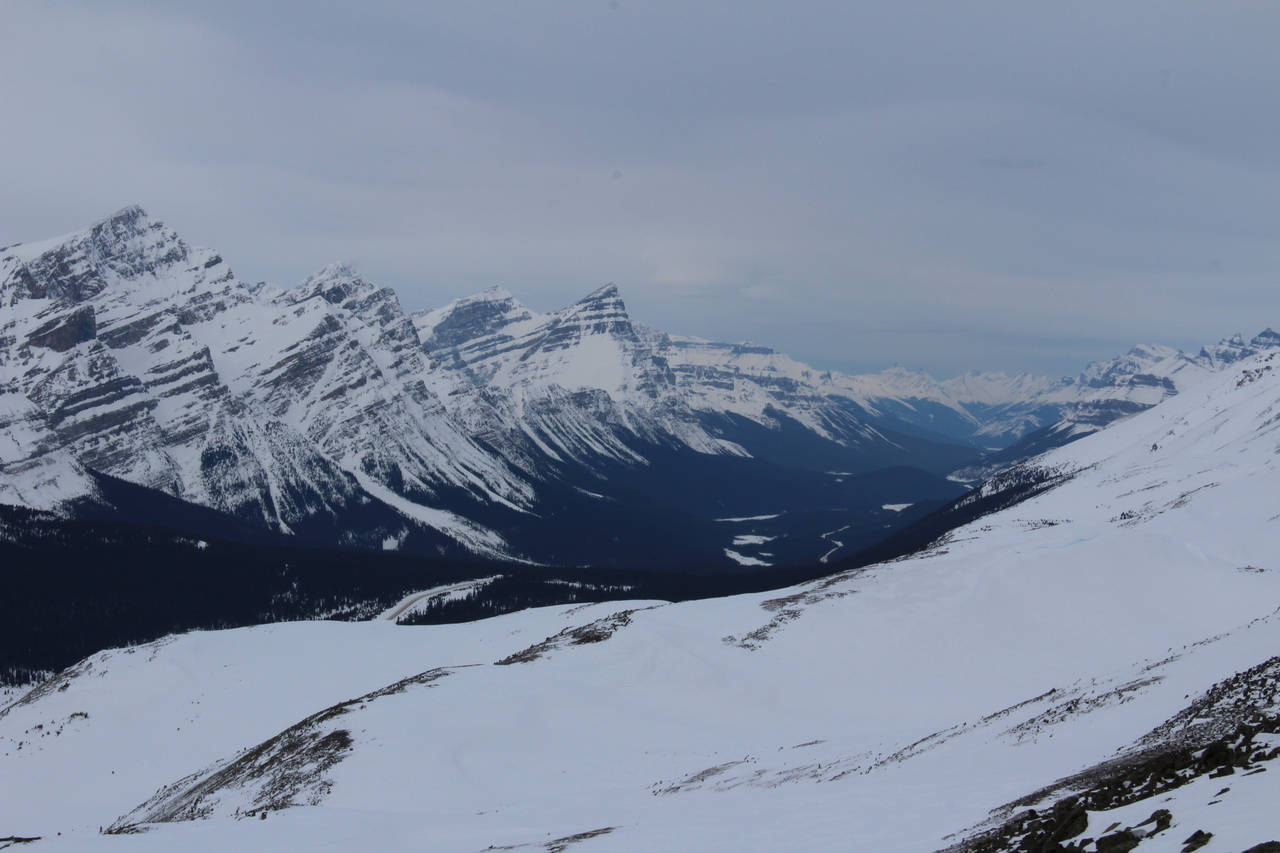 Famous Mounts Lefroy and Victoria tower in the distance (center), beyond Crowfoot Pass! The cliffs of Pulpit Peak rise immediately after the pass, below Waputik Glacier!
