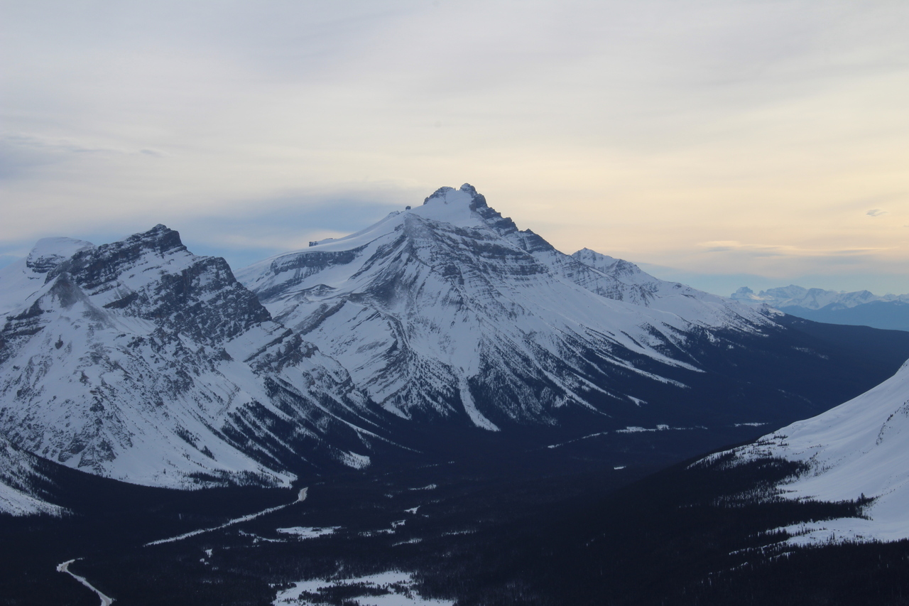 Mount Des Poilus and Mount Collie may sit all the way on the opposite end of the Wapta Icefield, but they're still visible from here, rising on either side of Crowfoot's North Peak!