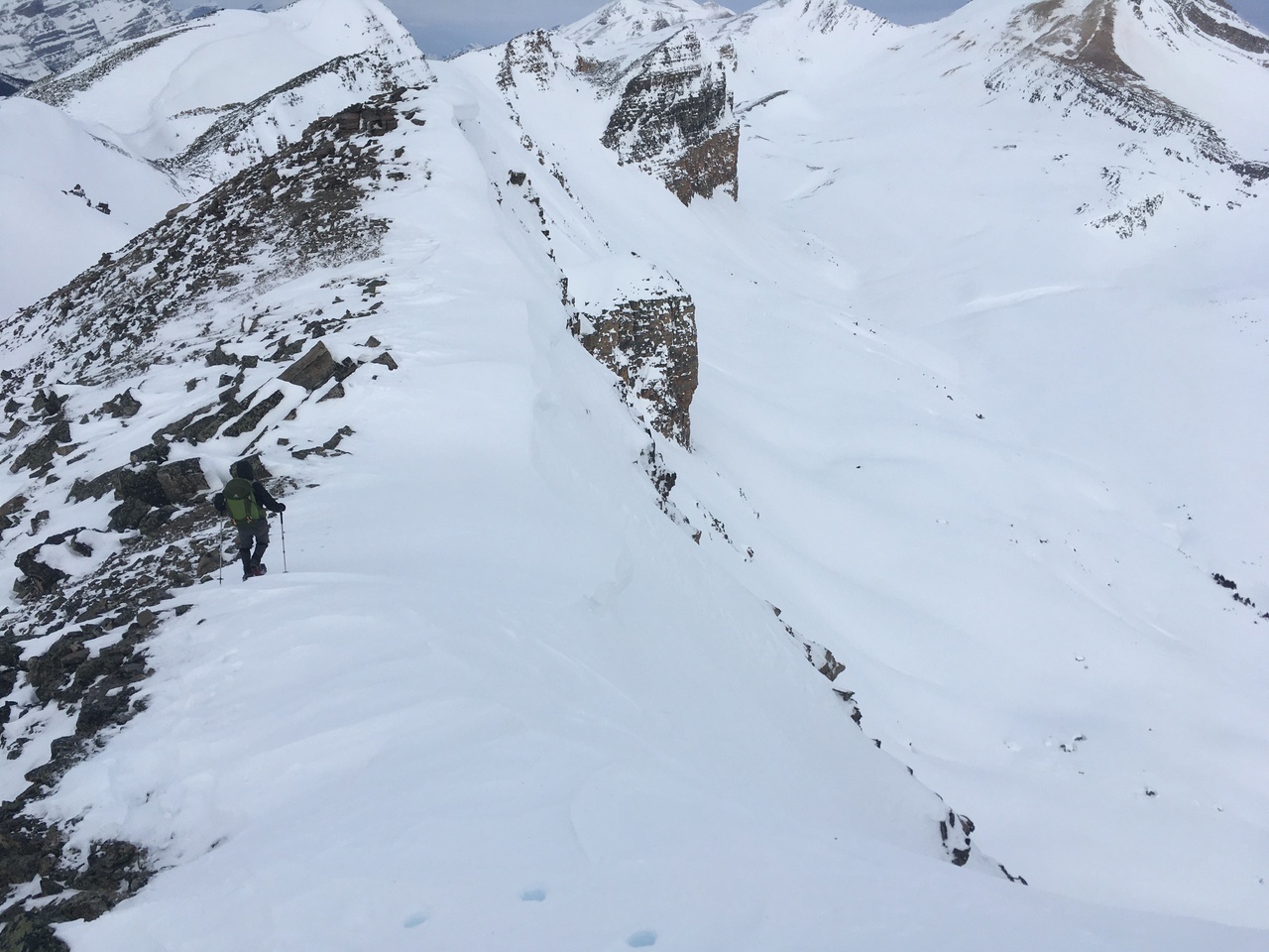 My dad carefully traverses the heavily corniced ridge, up to Crystal Ridge's southeast summit!