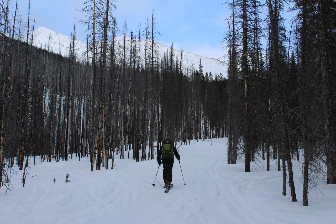 Starting up the broad trail, through burnt forest, on the north side of Engadine Creek. (We can actually see The Tower this time!)