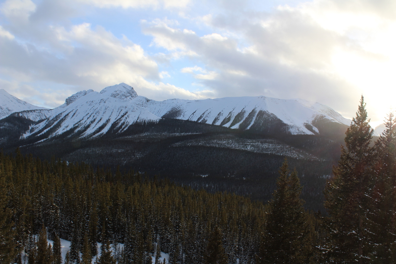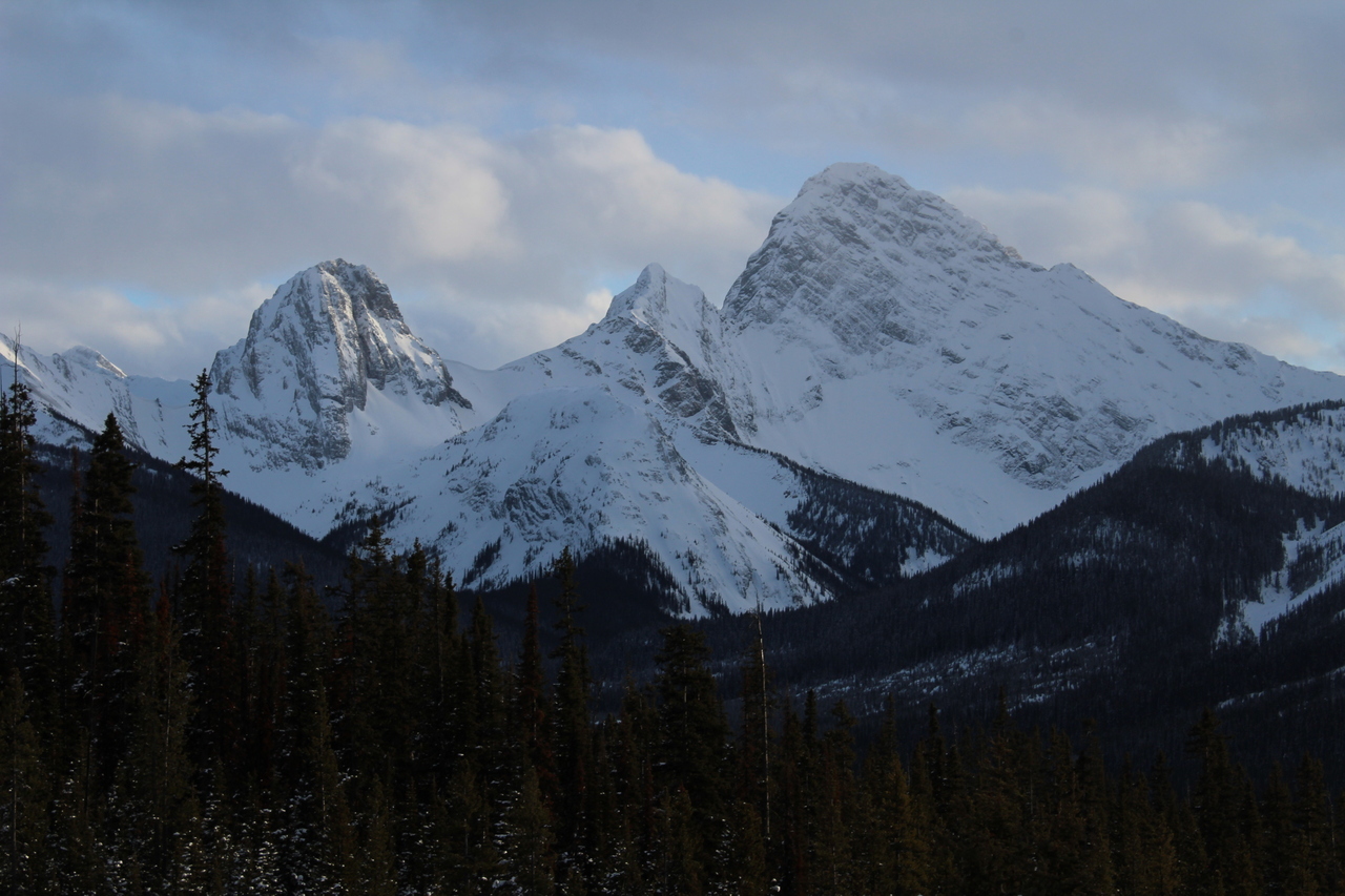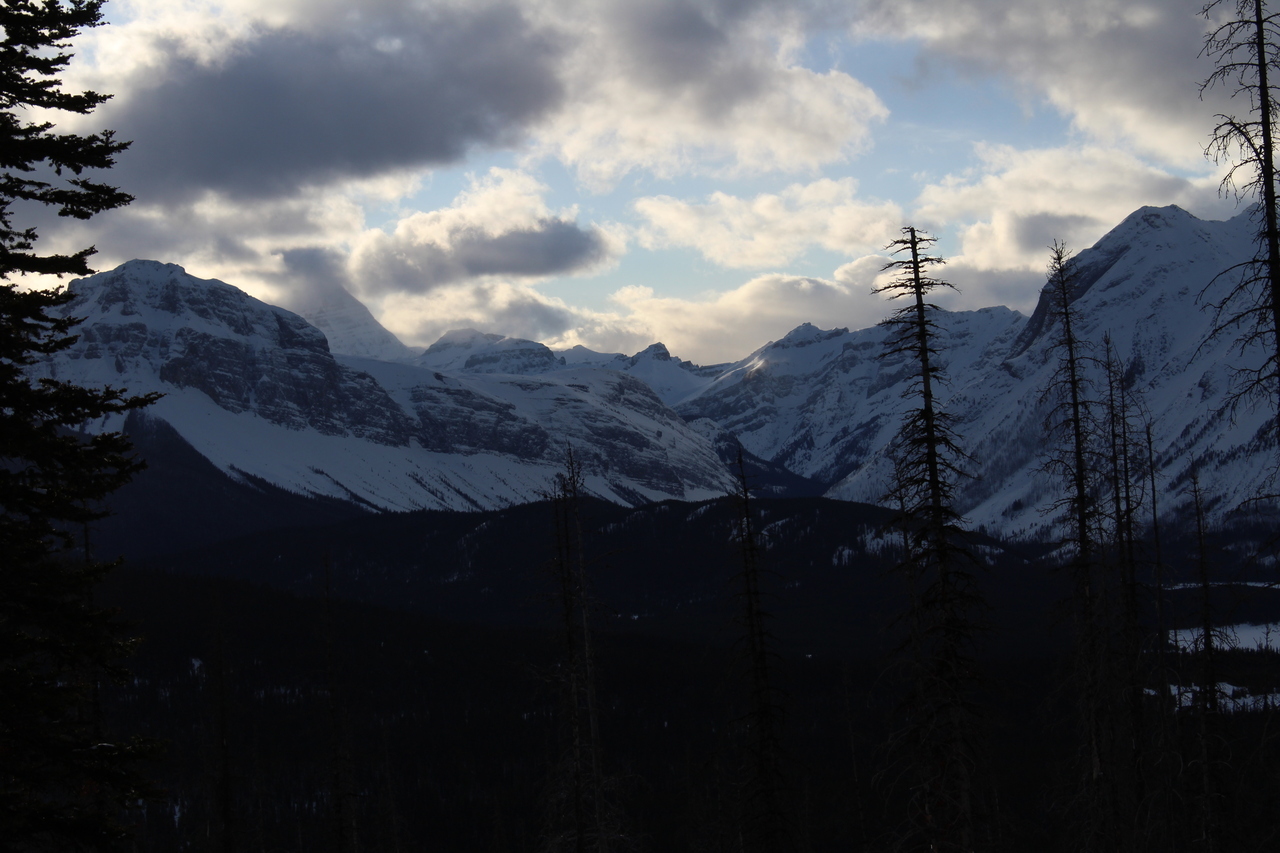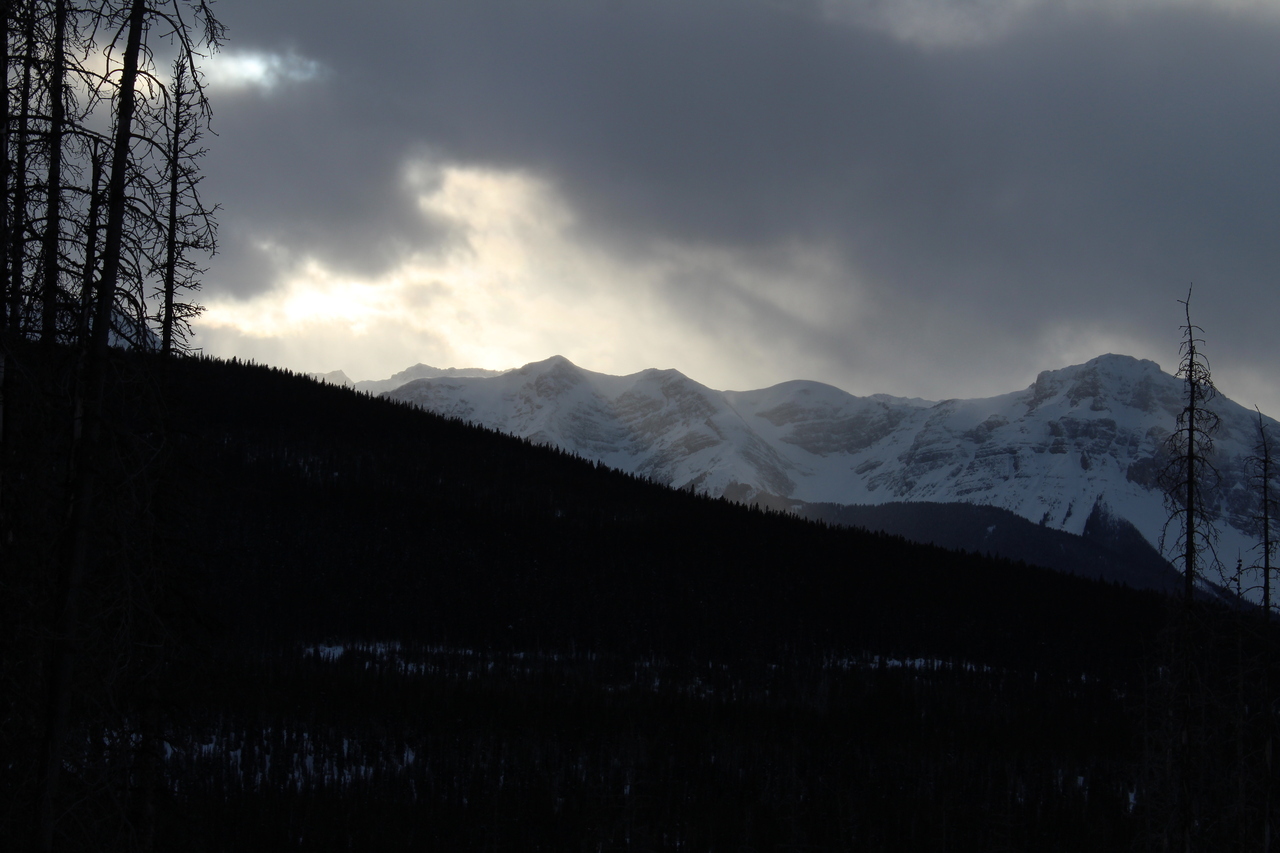 Our final glimpse of sunlight, as the sun disappears behind the mountains. Mount Assiniboine is even visible, rising into the clouds beyond Mount Turner (left)!!
