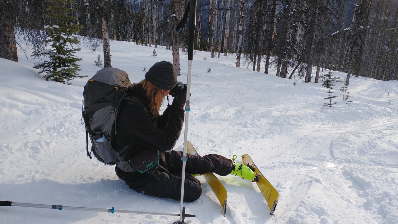 Skinning up the final few meters before making the transition and finally skiing again!! We would've gone a bit further (until the trail starts sidehilling towards Rummel), but we still wanted some evening light to ski in, and the sun was setting rapidly! Photo credit: Dad