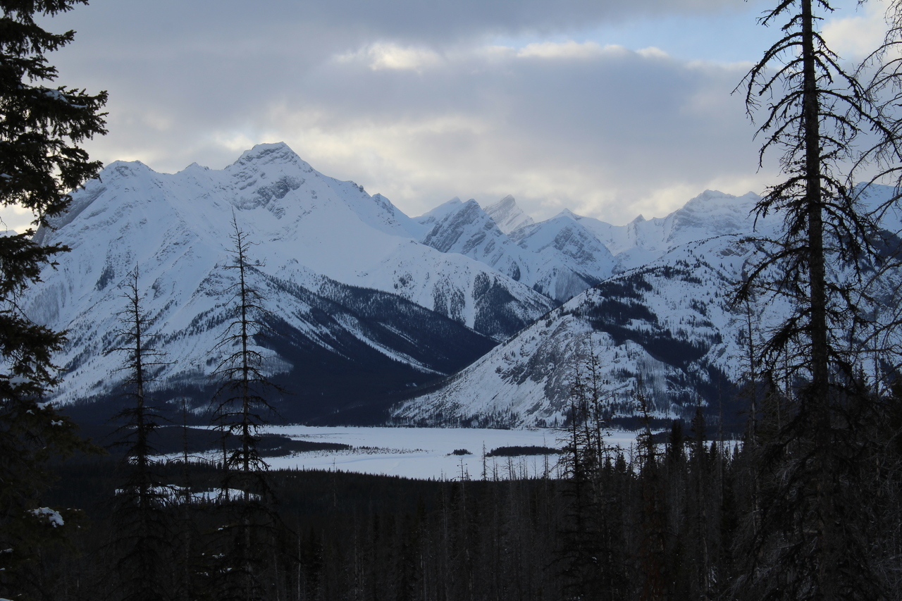 Now there's a view I've never seen before! Cone Mountain (left) rises impressively across the south end of Spray Lake!
