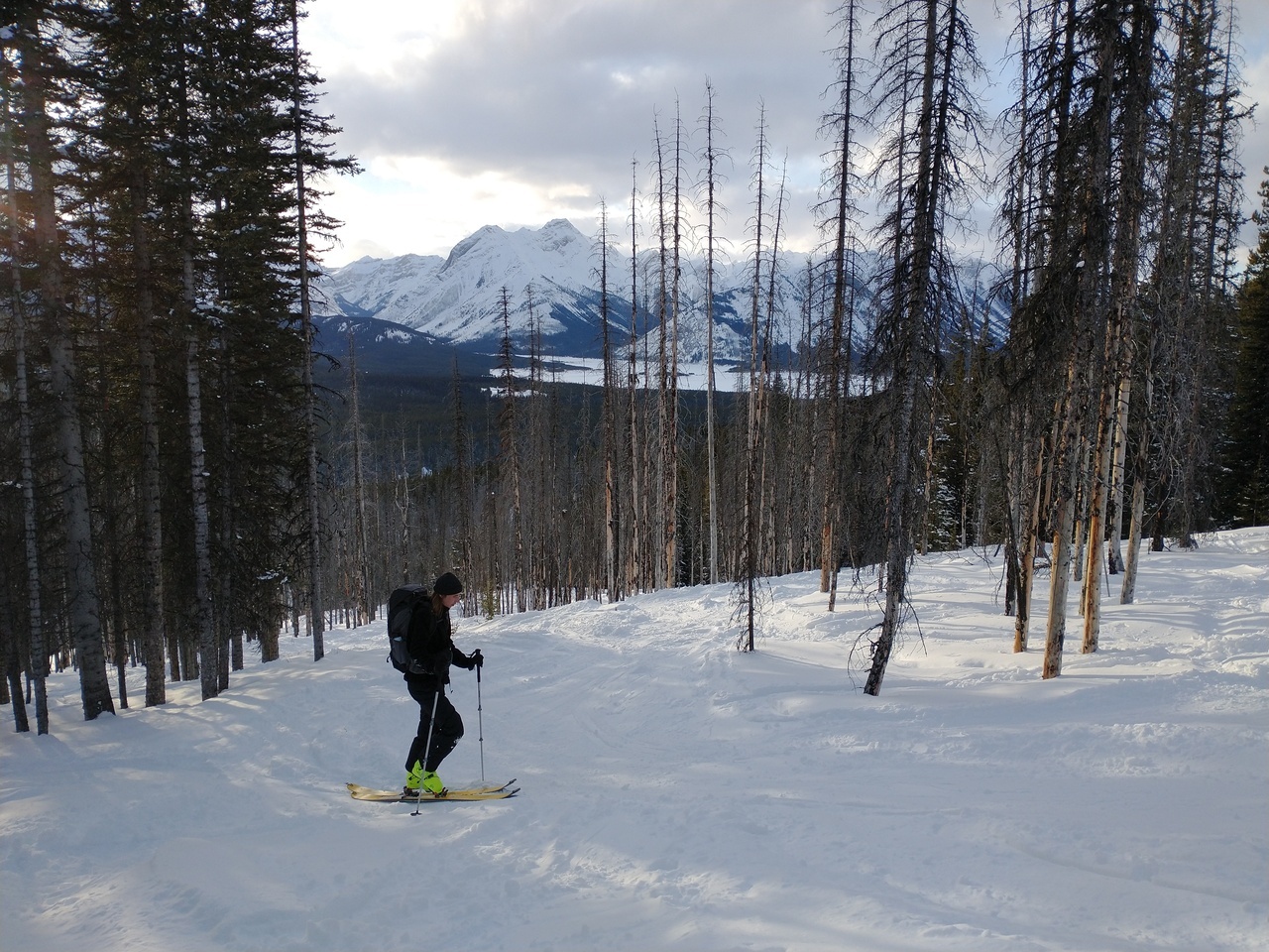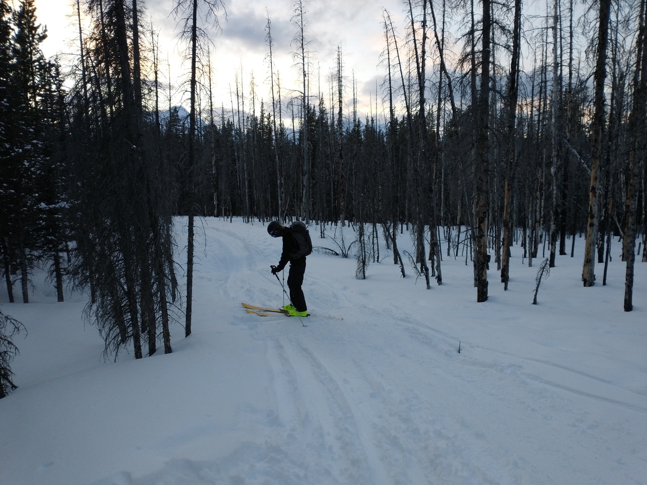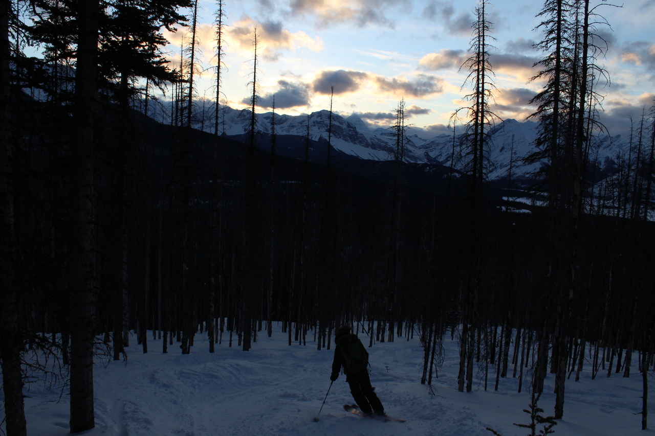 After bagging two summits (Exshaw Mountain and Little Lougheed) earlier in the day, there was still sunlight (days are getting longer!!), and we were both eager to get back on skis after over three months of being on pause since Wolverine! We remembered the broad approach trail along Engadine Creek that we followed while snowshoeing up Rummel Ridge the previous month, and decided it would make for a quick evening lap! It hadn't snowed much recently, and our run was consequently quite skied off. Nonetheless, we enjoyed a beautiful sunset, and views that were drastically better than when we completed Rummel Ridge! This, paired with being able to enjoy the descent on skis, made this short outing more than worthwhile, and a great conclusion to a very enjoyable day in the mountains!