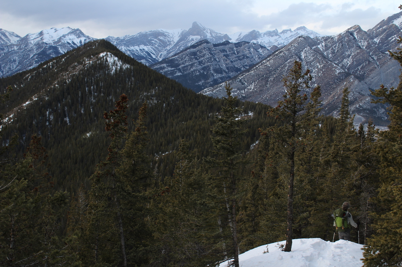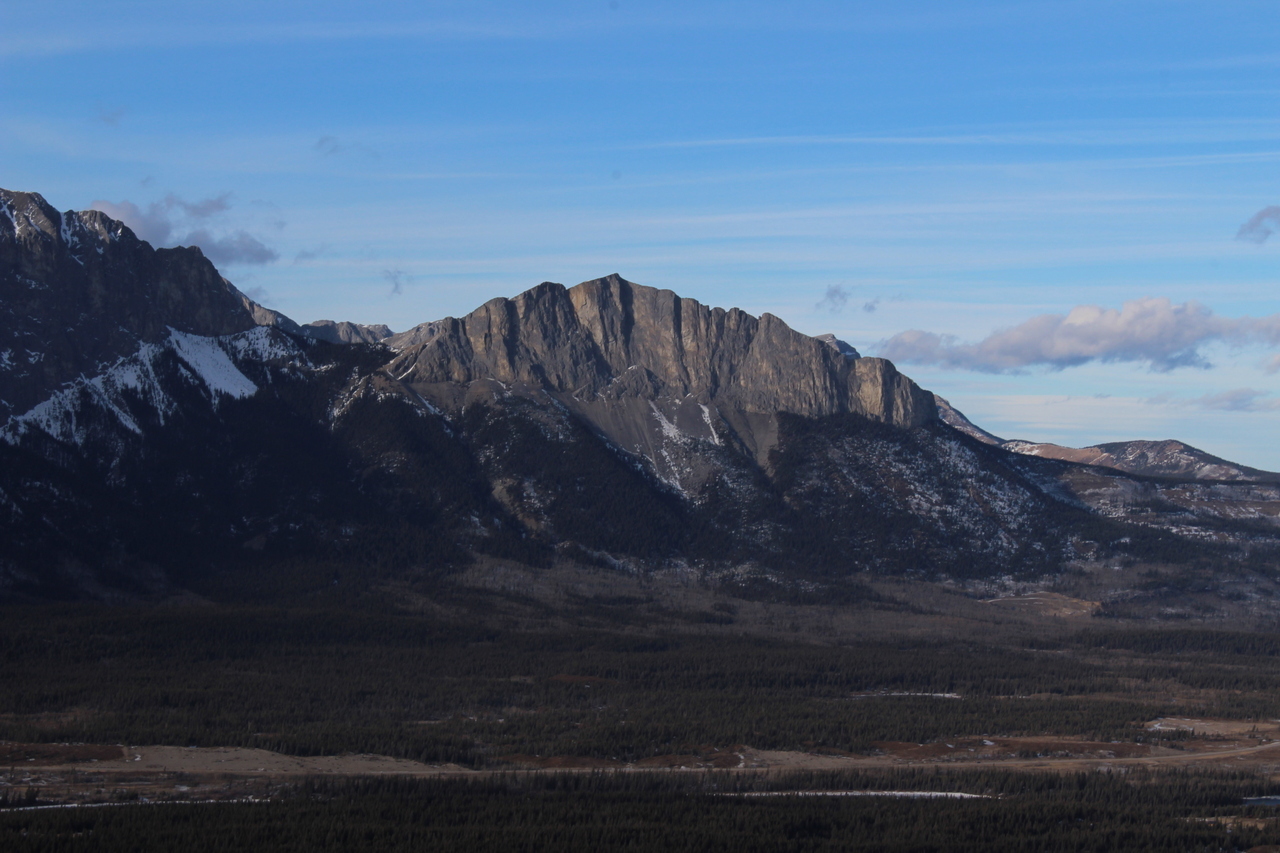 Gap Peak (left) and Mount Fable (right) rise above Exshaw Mountain (treed hill below).