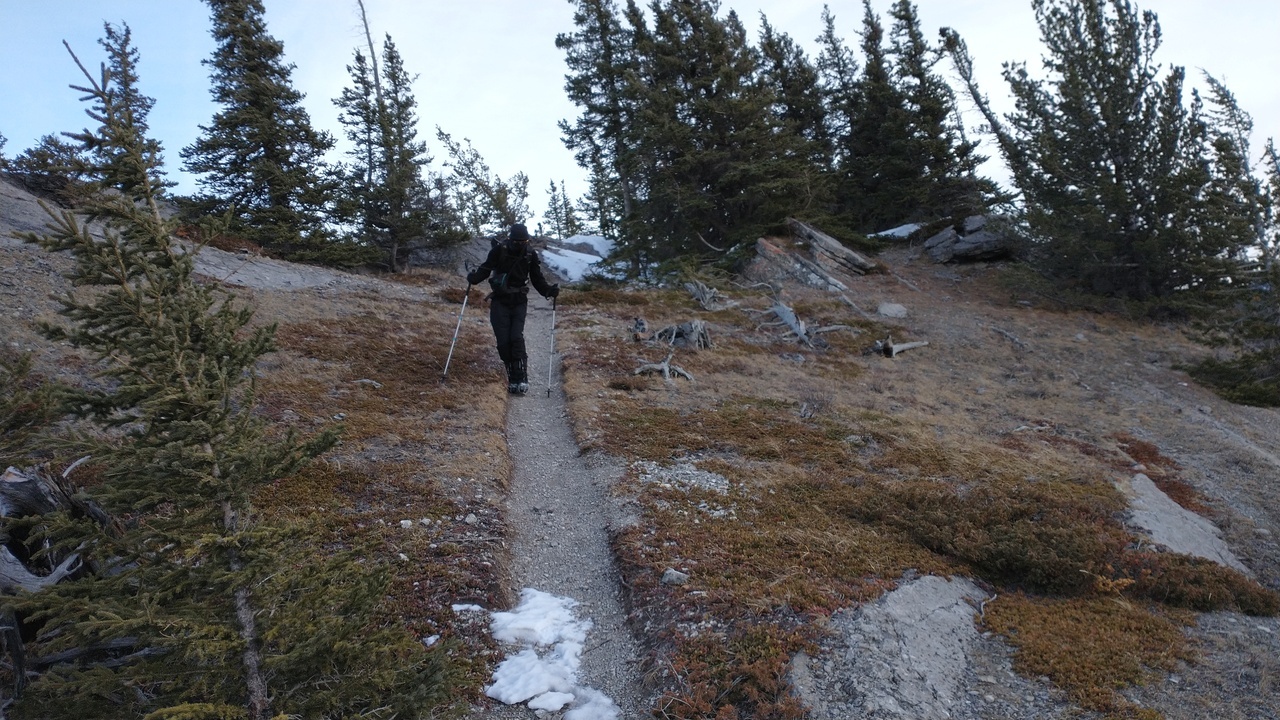 Following the well packed trail, back down towards Jewell Pass, before branching off on our newly created ascent "trail", traversing around the base of Yates.