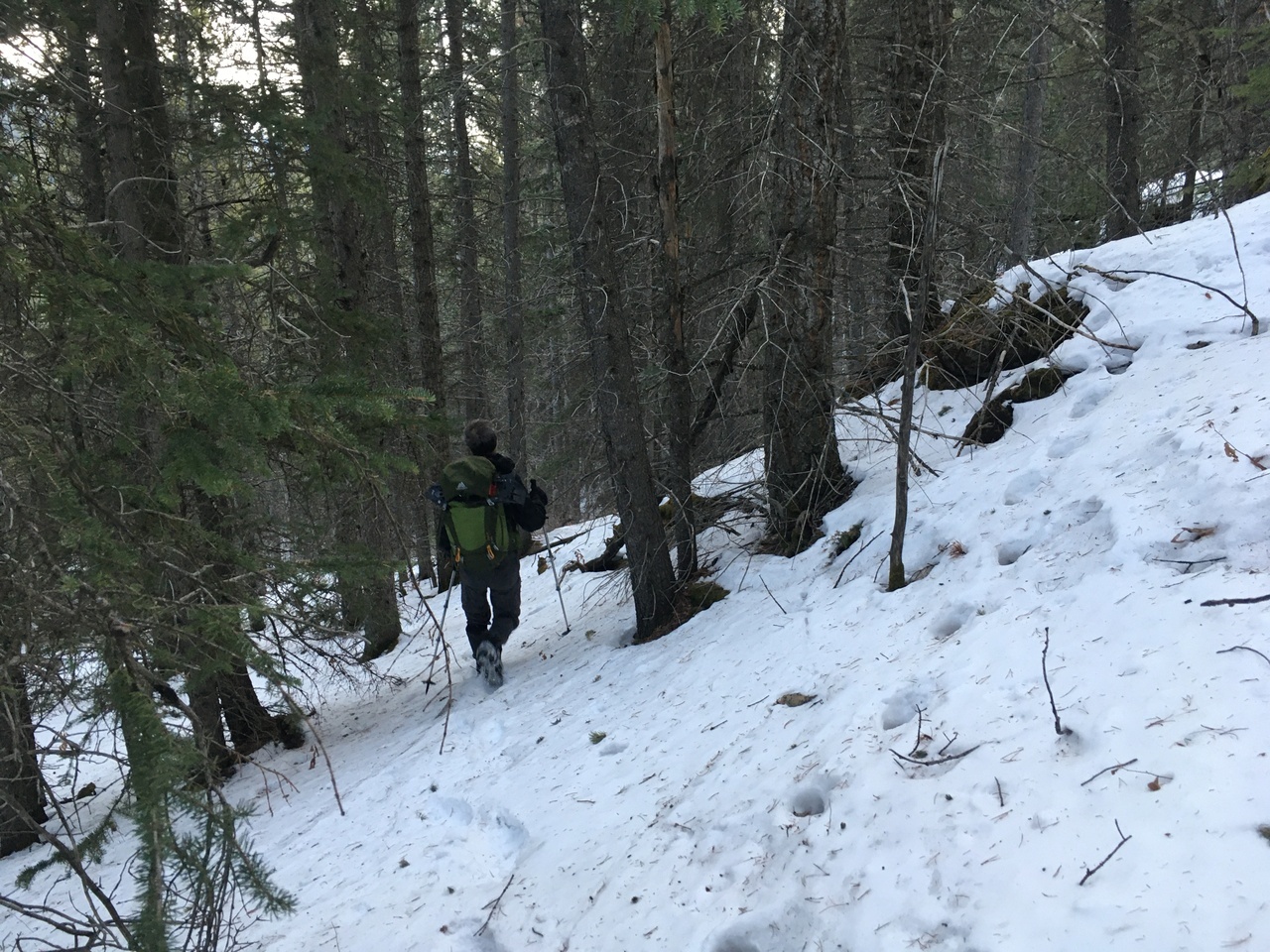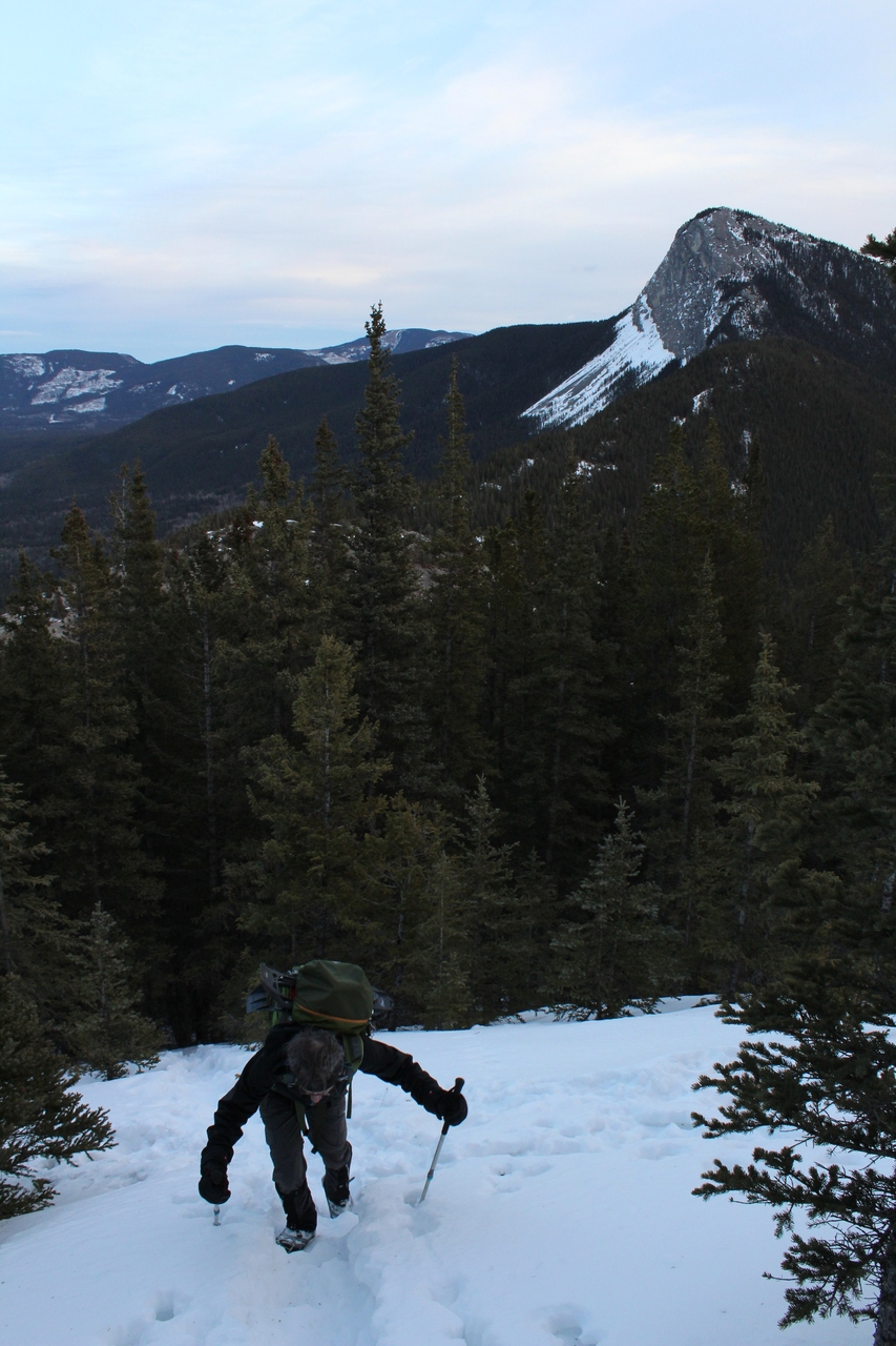 Upon reaching the point where our trail from earlier descends around the north side of Engagement Mountain, we instead traversed to the left, before route finding our way up the initially steep, snowy slopes leading up to the west.