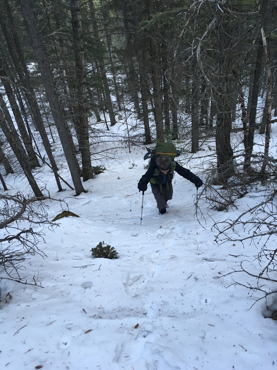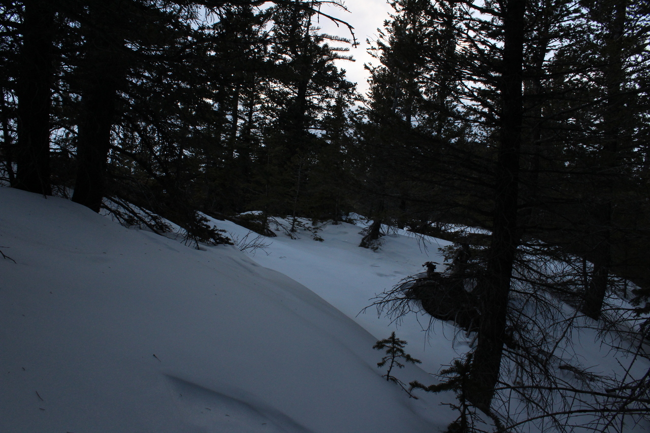 The slope eased off for a brief section, and we intercepted some previous tracks (running down the center of the photo - hard to tell)...Wonder where those came from??