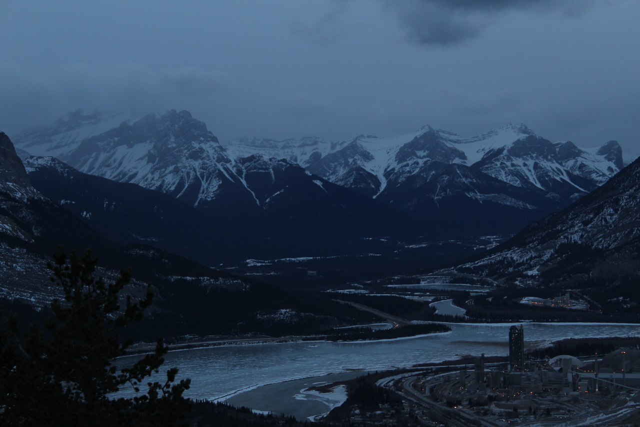 Looking towards Canmore, with the Three Sisters, Ship's Prow Mountain, Mount Lawrence Grassi, and Ha Ling Peak, from left to right.