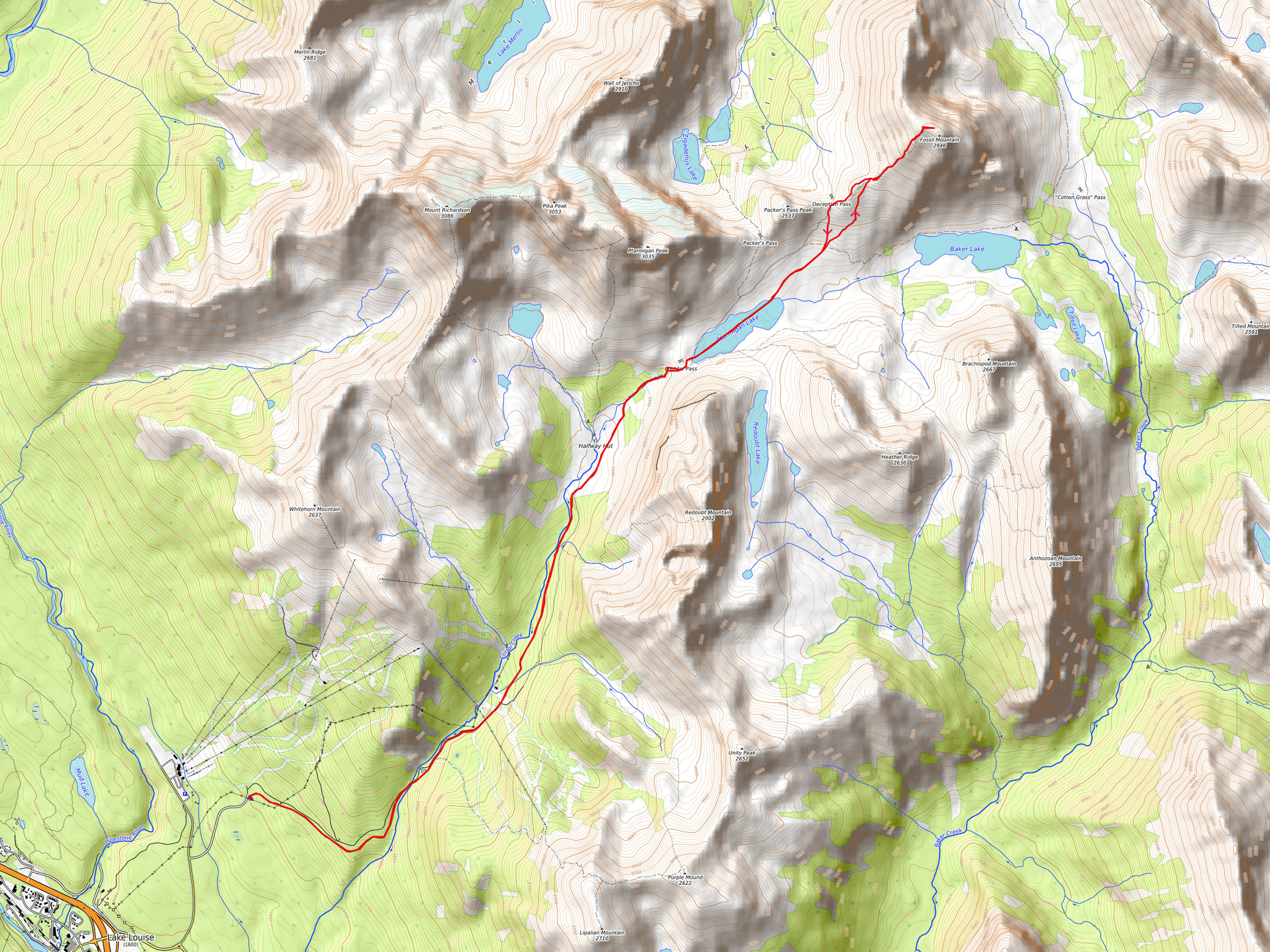 Sure enough, we soon encountered the "distressed" groomer, flipped nearly 90 degrees onto its side, downslope from the ski-out! No clue how that even happens, but there was no way I was sticking around to find out and risk get kicked off the ski-out for real this time! We briefly wished the two fellas good luck, and quickly continued on our way. The remaining hike up to the ski hill was the same as always (it's starting to feel a bit repetitive with this being our fifth time up it in the last couple years...), and with a steady pace we were soon passing through the resort and starting up the trail to Boulder Pass.