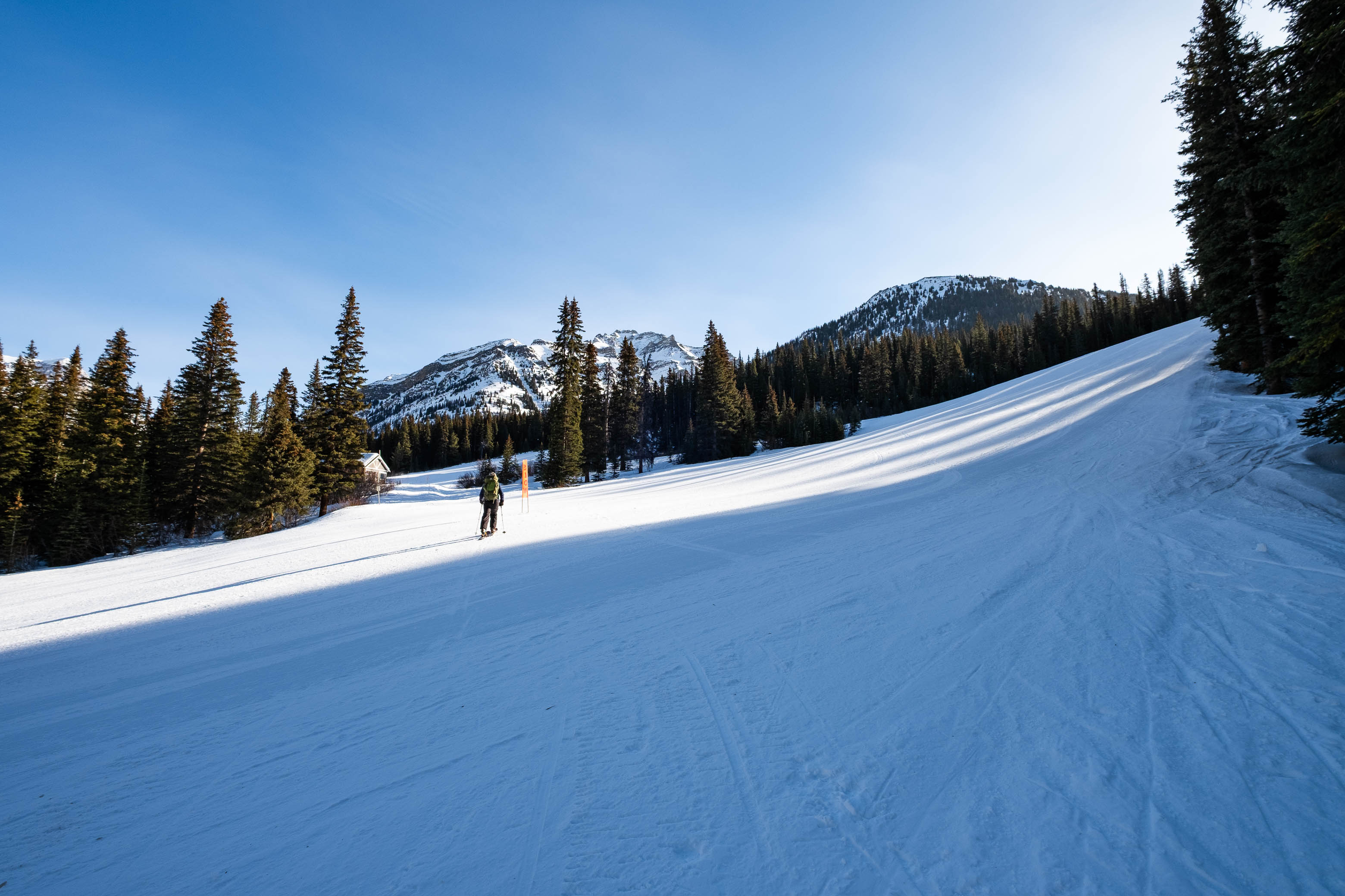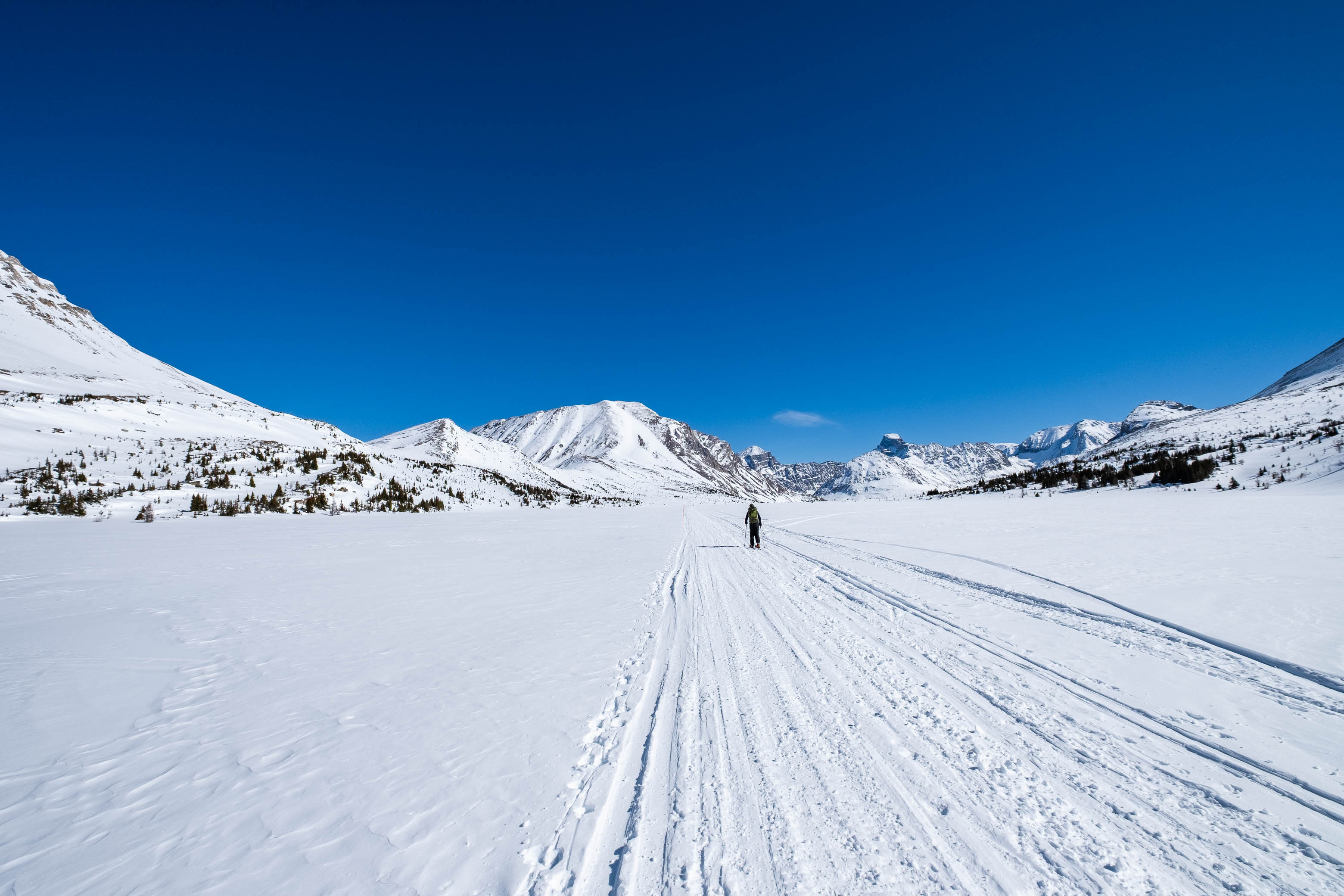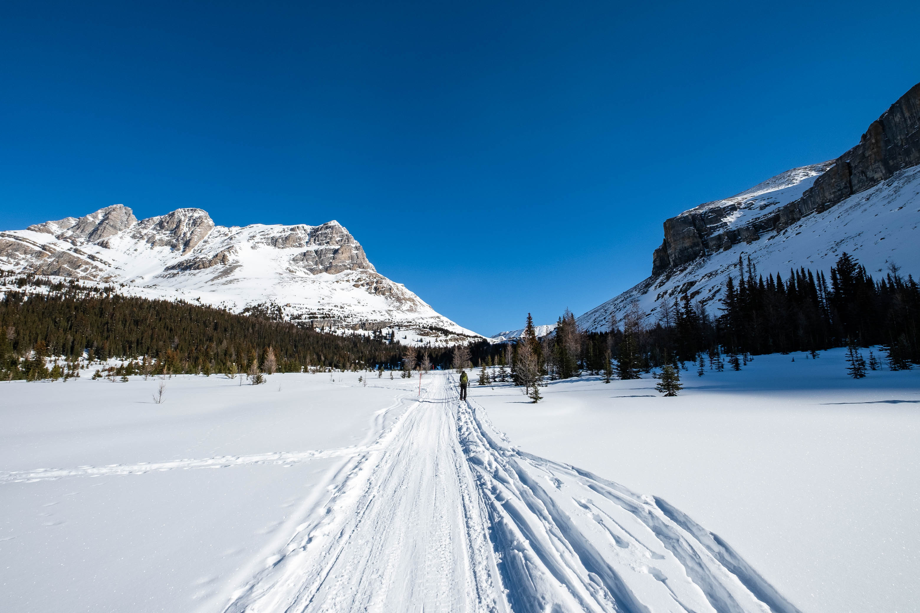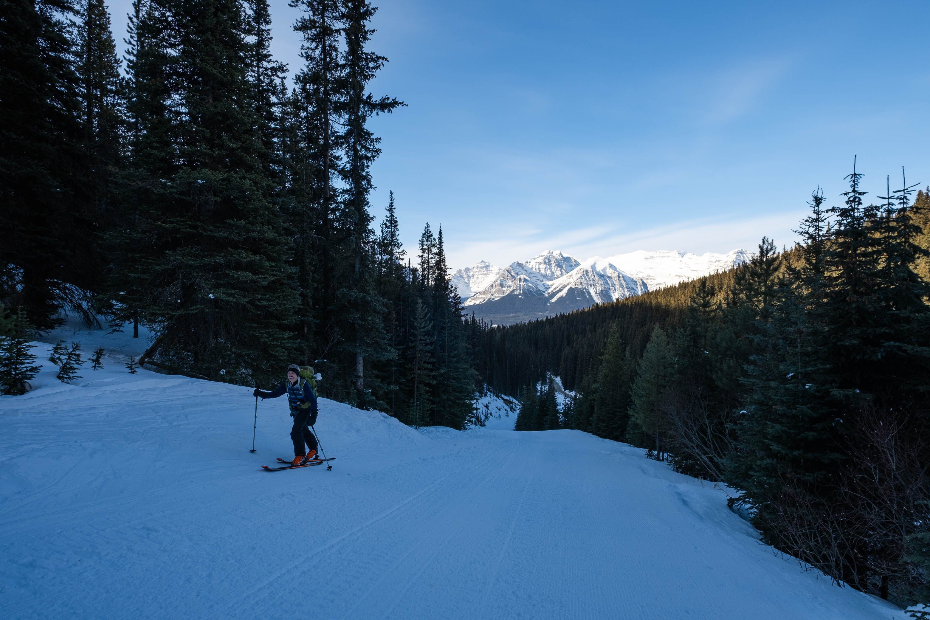 We set off from the Fish Creek parking lot, prepared for another uneventful, monotonous trudge, but quickly discovered that this would not entirely be the case. Monotonous trudge, yes, but definitely not uneventful! About a kilometer in, a ski patrol came ripping down the ski-out on a snowmobile, but started slowing down and stopped right beside us - OH NO! My mind immediately jumped to the most negative outcome, thinking we were about to get kicked off the ski-out for some stupid reason and have yet another failed attempt getting up to Skoki this season!! - He proceeded to let us know that the ski-out was indeed closed (NOOOOO!), because a groomer had slid into the ditch and couldn't get out. Luckily the ski patrol was a cool dude though, and said we should still be able to sneak around them and continue on our way (PHEWWW! 😅).