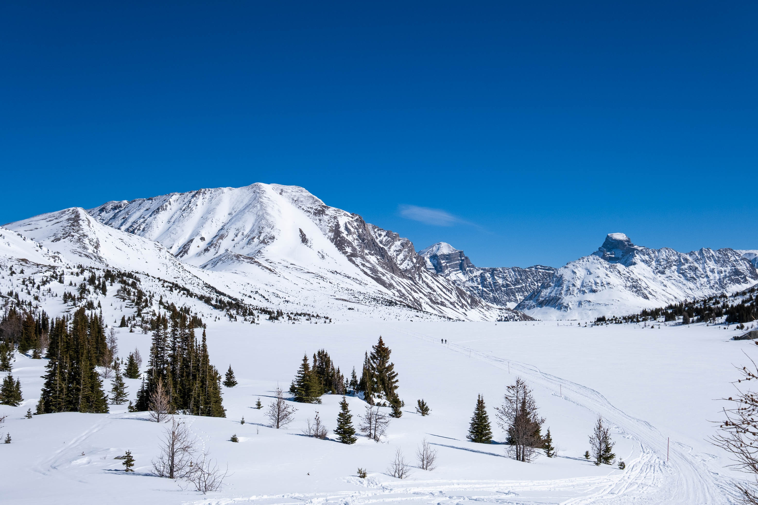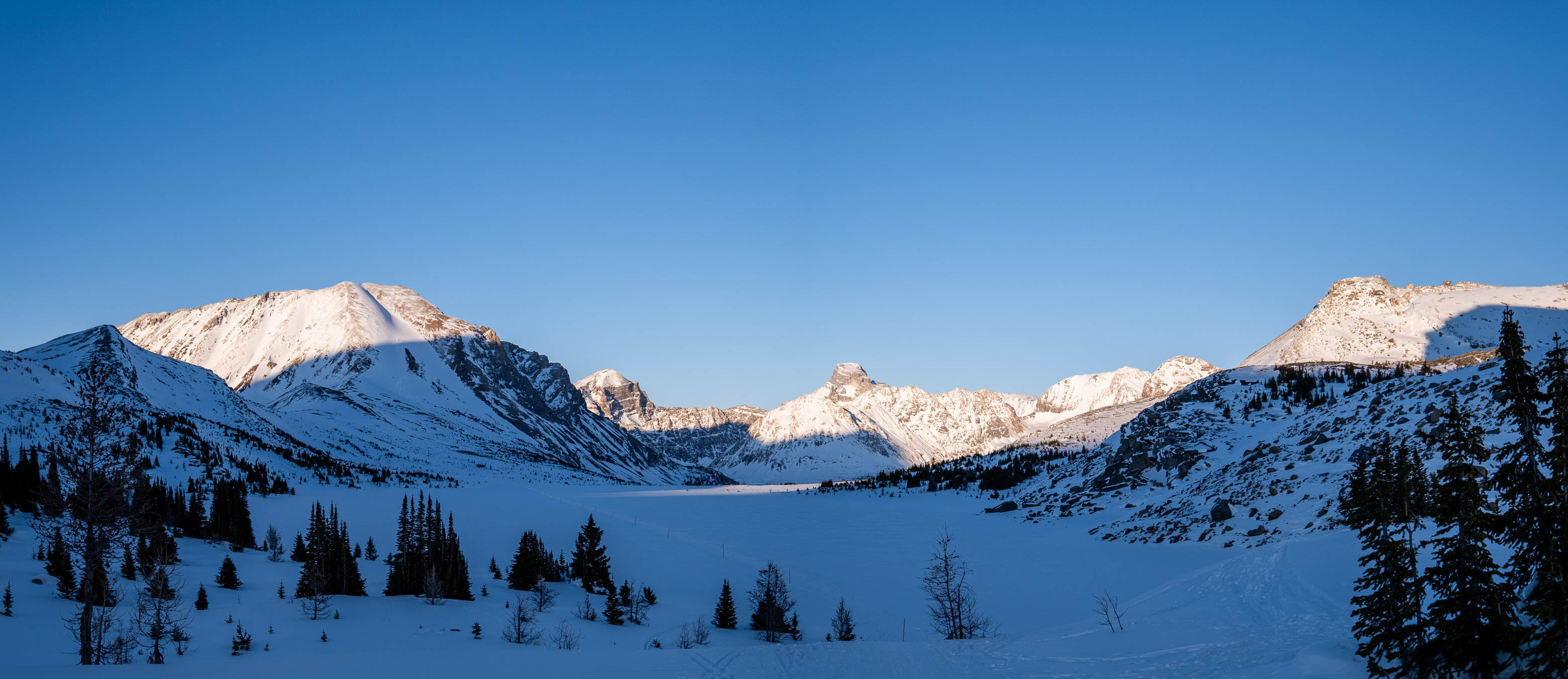 As we made our way around the western flanks of Redoubt Mountain, we were accompanied by the sound of birds chirping and the warmth of a bright sun shining down on us - it was really starting to feel like Spring! Views were stunning, with not a cloud in the sky, and I was enjoying the beautiful weather far too much to even think about the trek. Before we knew it, we were standing at Boulder Pass, and having never been out here in winter before, I was surprised to find a set trail - complete with red marker posts! - leading across the entire length of Ptarmigan Lake. Come to think of it, Skoki Lodge would definitely make for an ideal winter backcountry location (and would therefore, have a solid trail leading to it), but for some reason I just never thought of that before...
