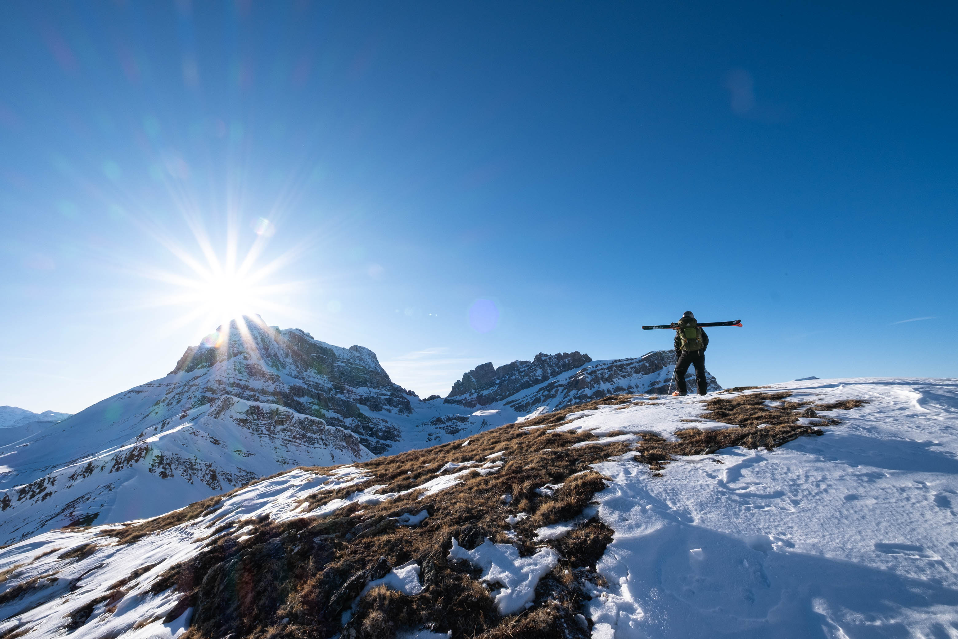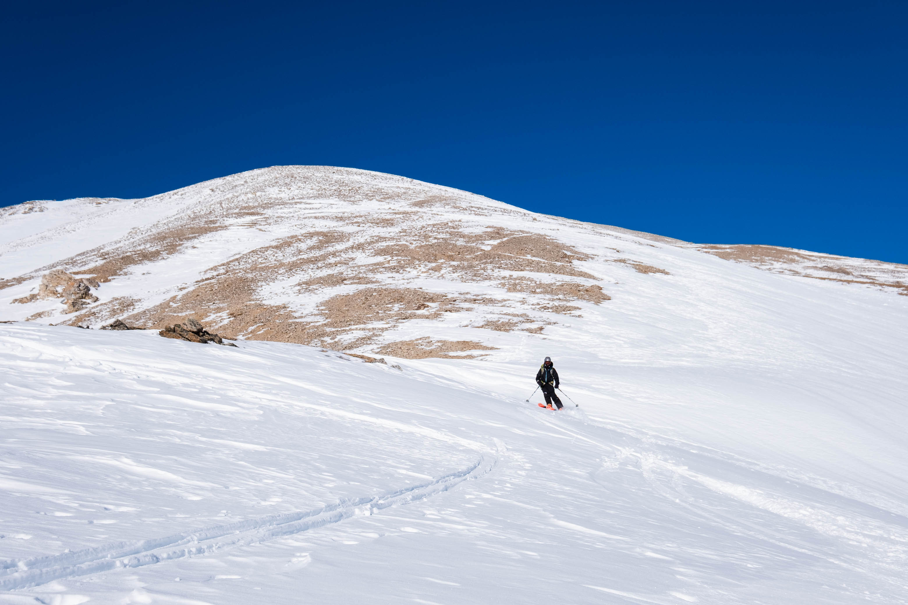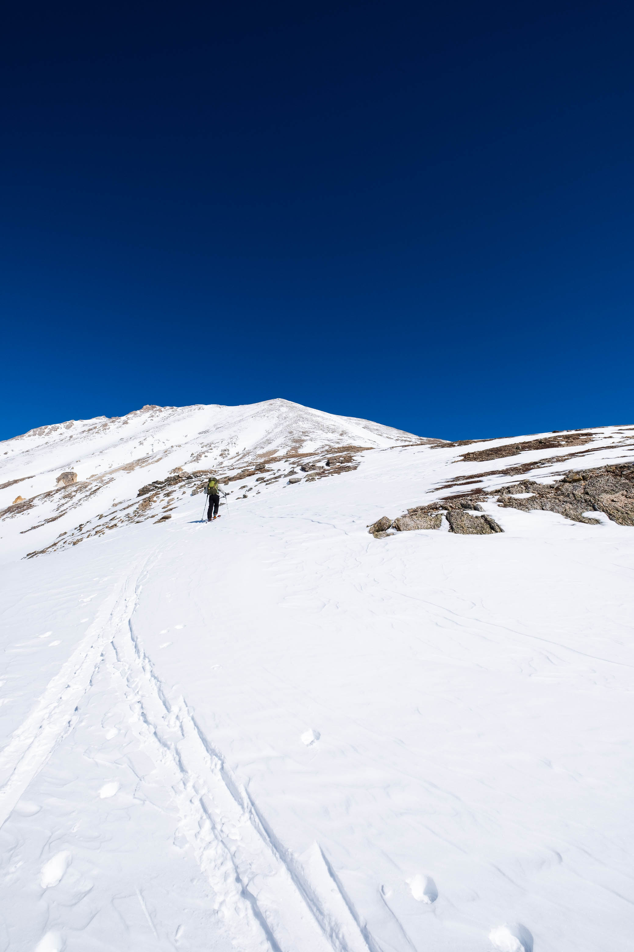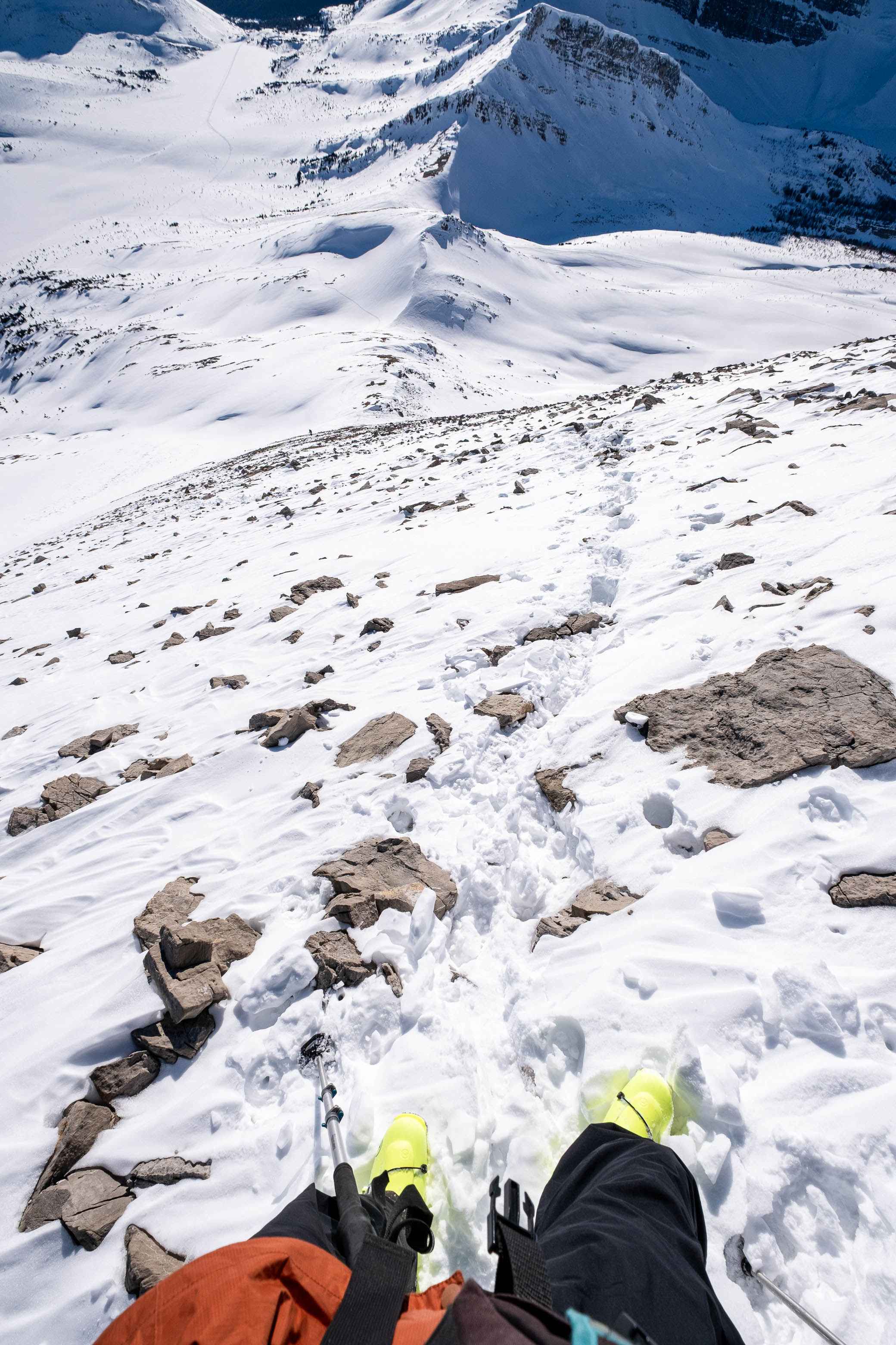 After retracing my steps along the ridge, I was surprised to look down the rubbly ascent slopes and find my dad, just a tiny speck, already over halfway down - I had some major catching up to do! I quickly started down - almost running! - to close the gap, and while running down snowy scree/rubble in ski boots isn't the easiest thing, I managed to stay on my feet (mostly 😉), and almost caught up to him by the time we arrived back at our skis.