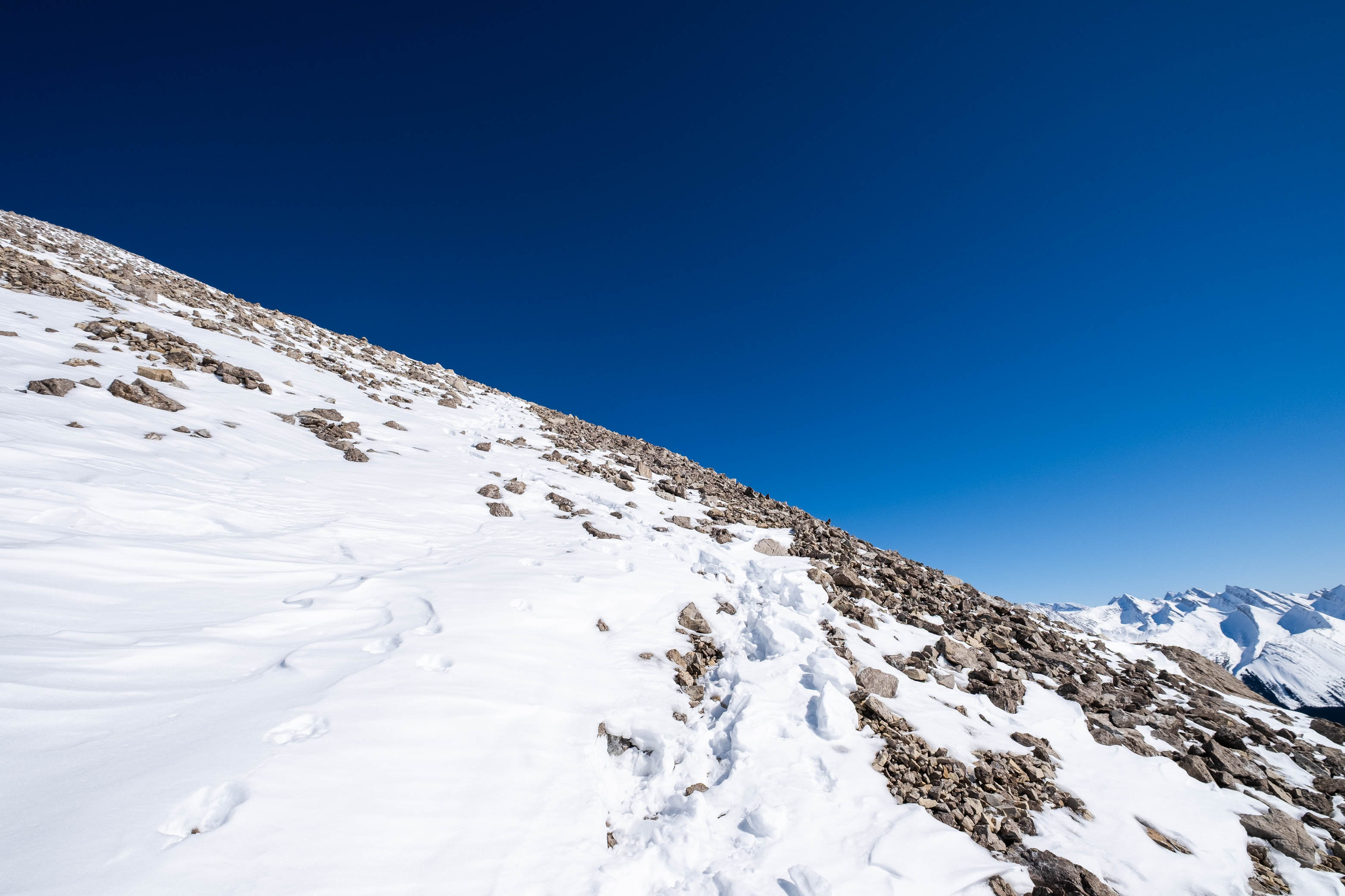 We took a short breather at the pass, and I found myself gazing across the lake, to Fossil Mountain's surprisingly bare southwestern ascent slopes rising at its conclusion. It's not every day that you skin 8 km into the backcountry, are granted perfectly clear skies, and have the chance to summit a near 3000 m mountain with very minimal avalanche risk...I just had to ditch our original Heather Ridge plan and go for it! Now don't get me wrong, these were by no means perfect condtions to ski Fossil Mountain - as a matter of fact they were exactly the opposite! - but they were the safest conditions you'll find to summit this mountain in winter, and for me, sacrificing the skiing was worth it for the promise of stunning views from the summit. For some strange reason, my dad wasn't as easily sold on the "long, awkward, rubble bootpack towering across the lake", but after a little bit of convincing, I was eventually able to lure him into another one of my big adventures! 😉