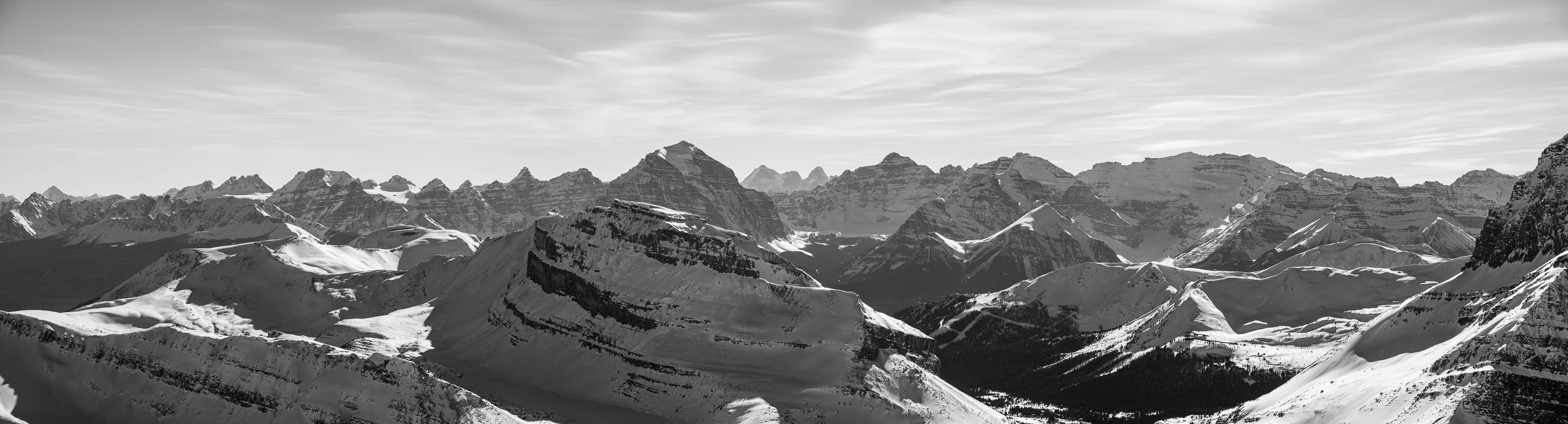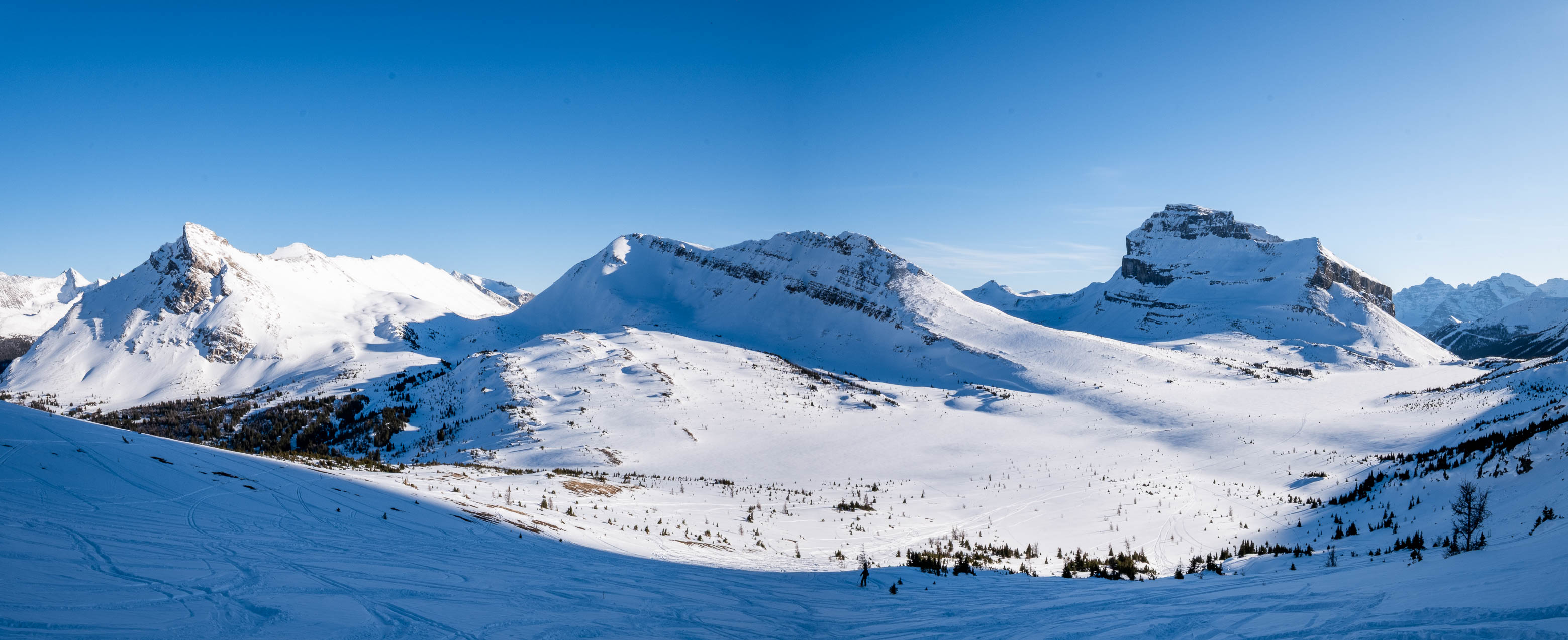 After a massive failure of an attempt of Heather Ridge last week (Don't bother looking for a report. All we did was skin 3 km up the Lake Louise ski-out before my dad made it clear that he was simply too exhausted from our six laps the previous day, and wasn't going to make it if we continued.), I couldn't help but want to immediately go back and get 'er done! As we started up the long, uninspiring ski-out for the second time in six days, however, the clear blue skies had me dreaming of grander objectives, and when we arrived at Ptarmigan Lake to absolutely perfect conditions, I was quick to suggest an objective that was "slightly" larger than what my dad originally thought he was getting himself into...