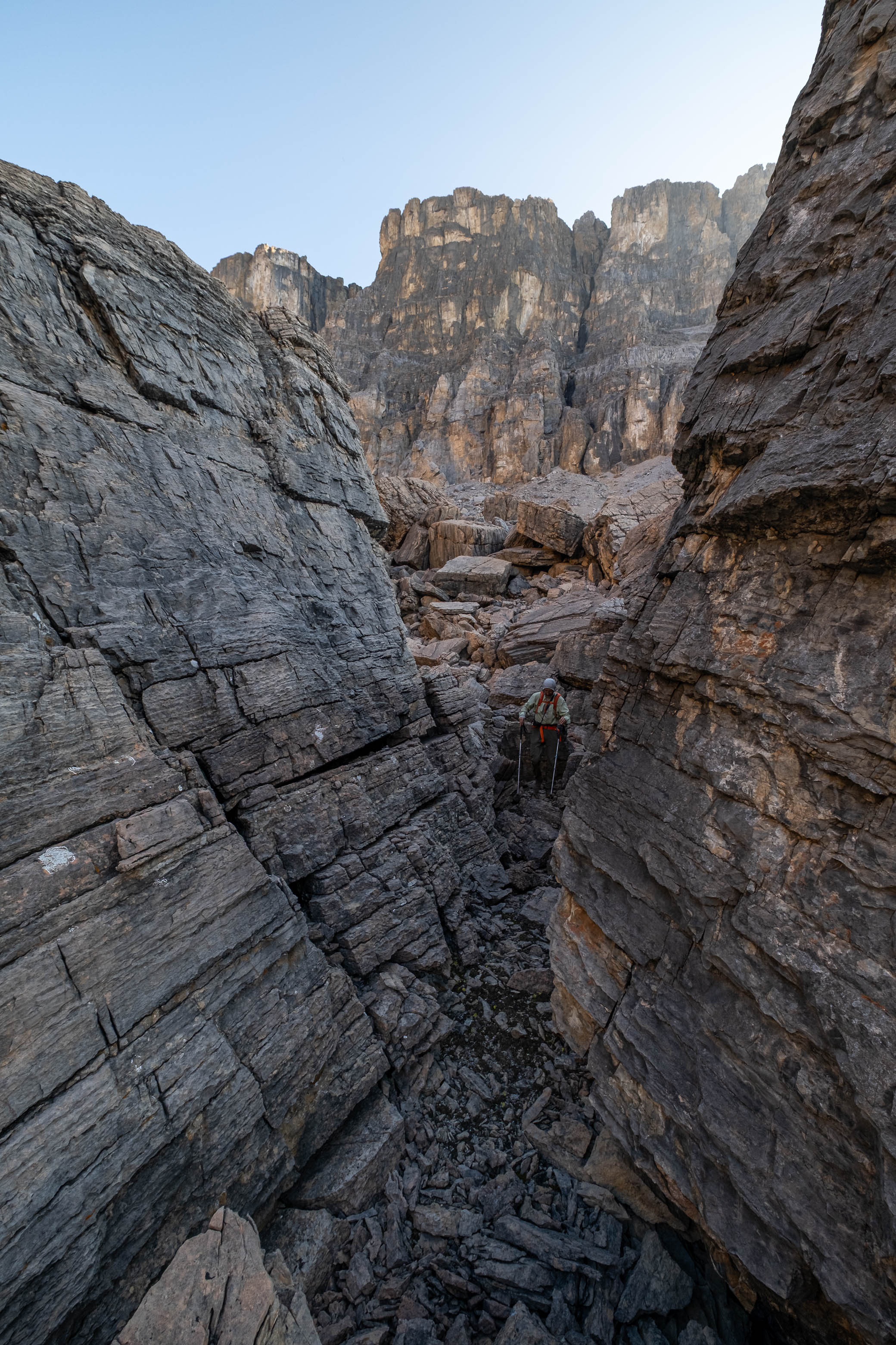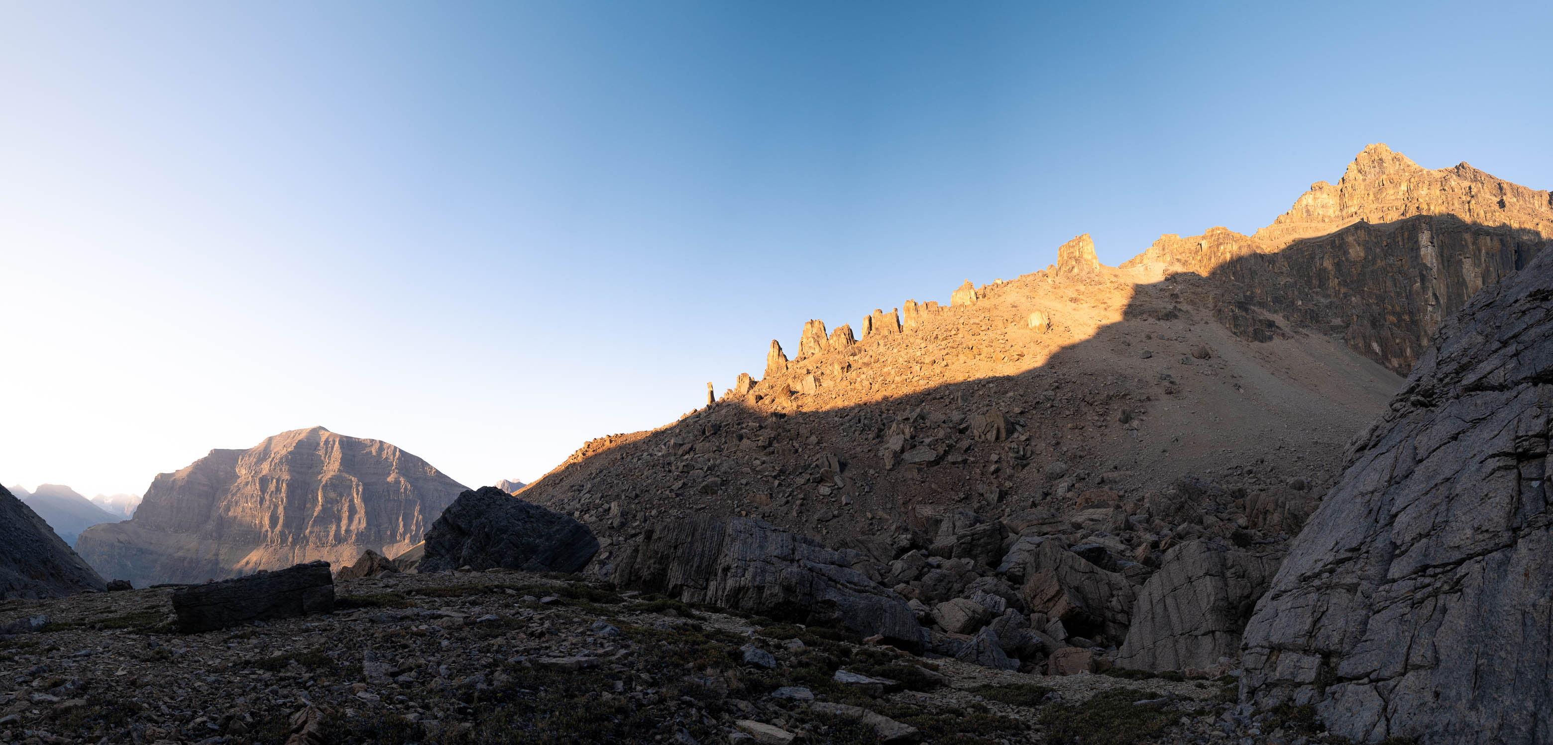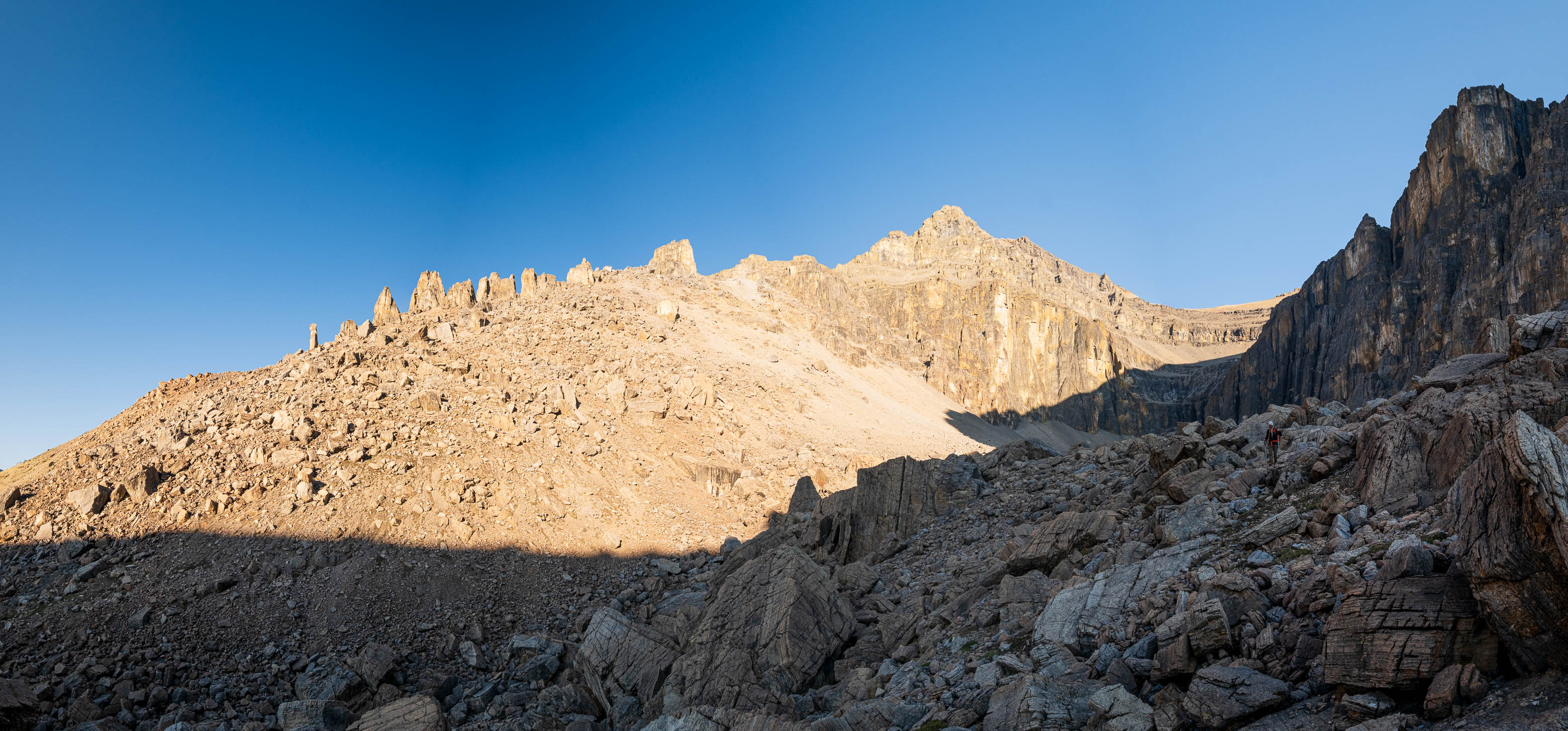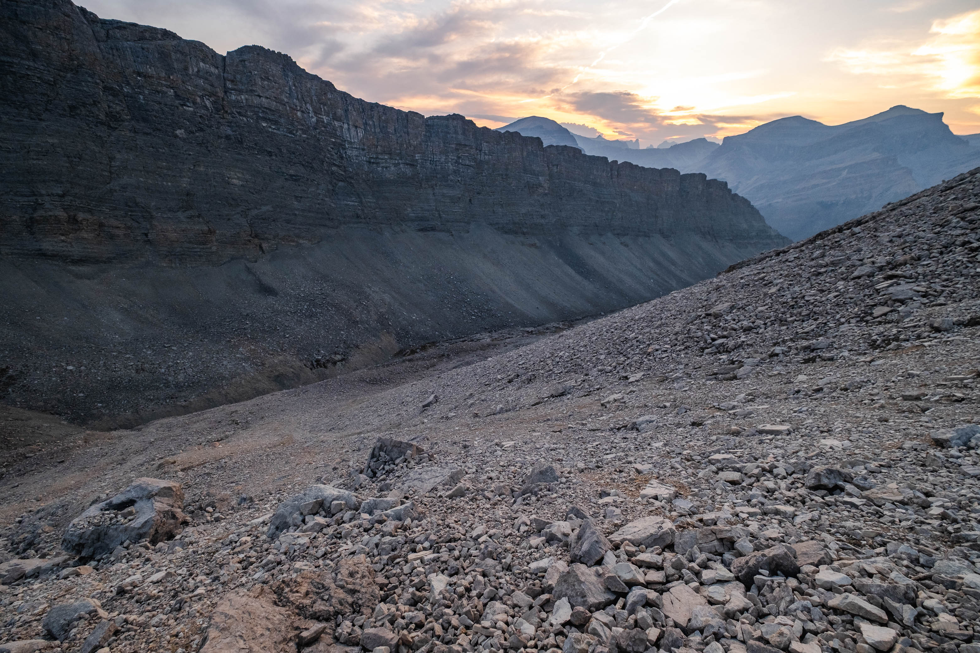 Sunrise from our bivy in Loudon's southern hanging valley. We descended the steep rubble/boulder slope, at center-right, in the dark the previous evening.