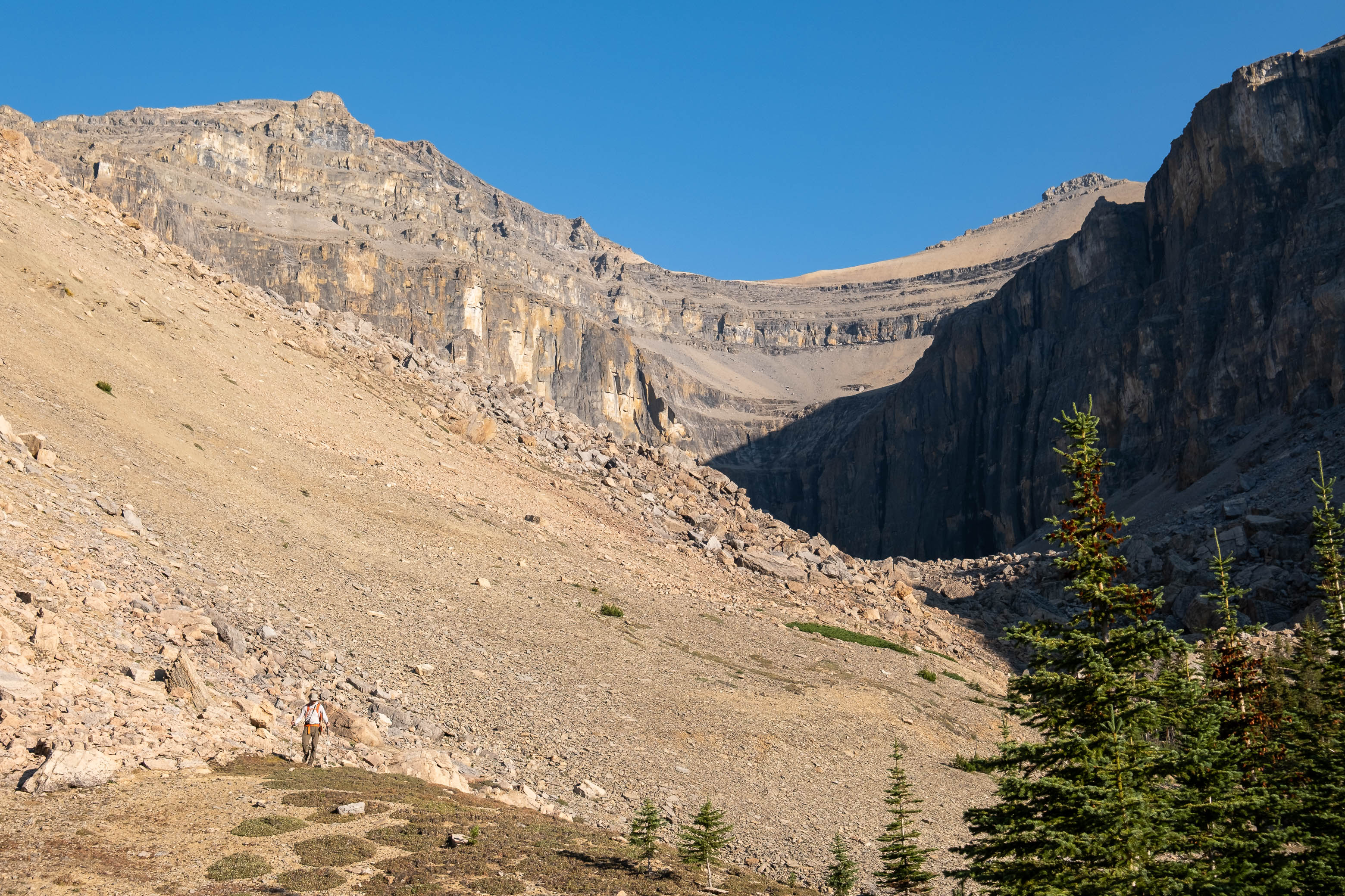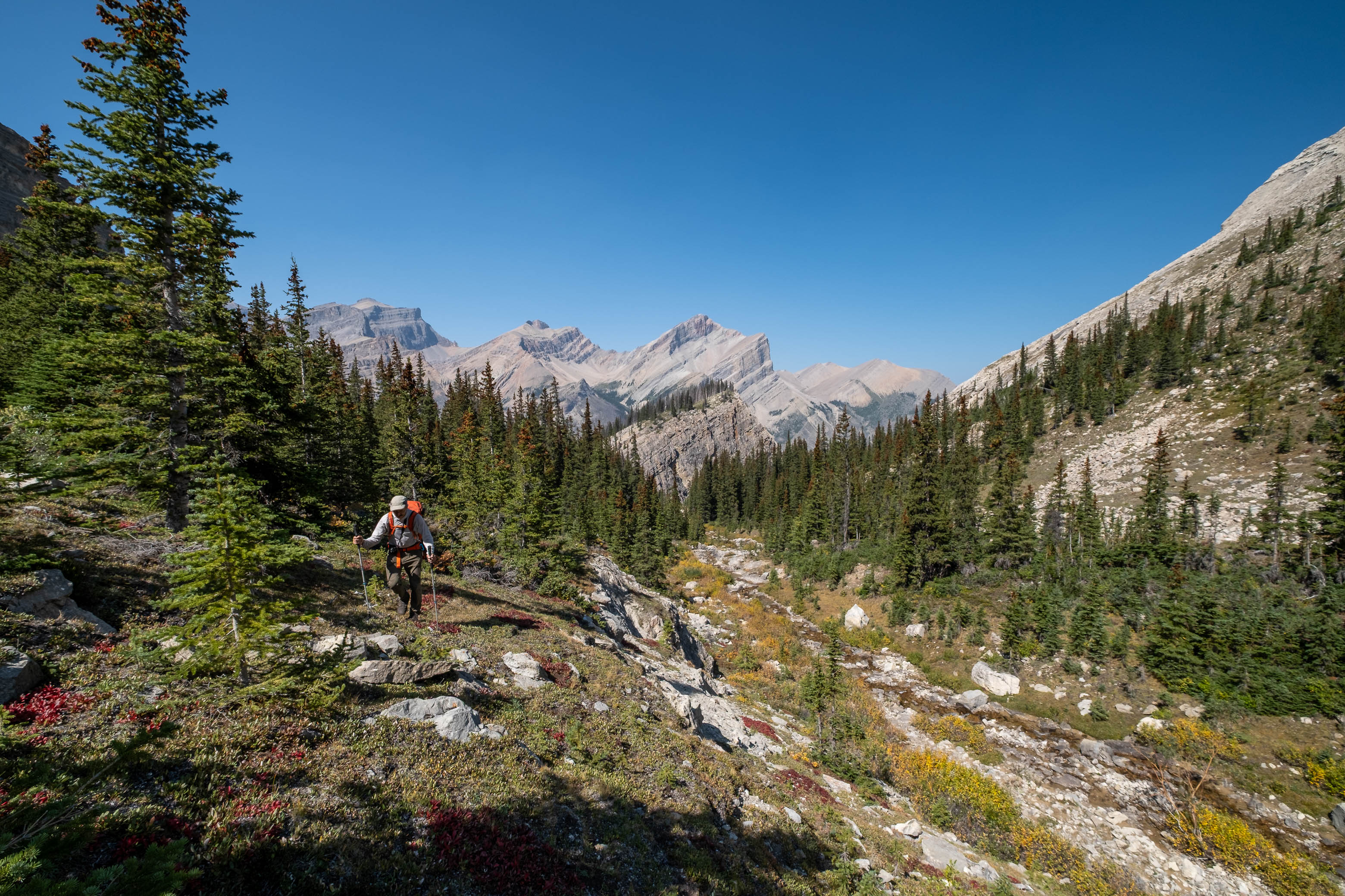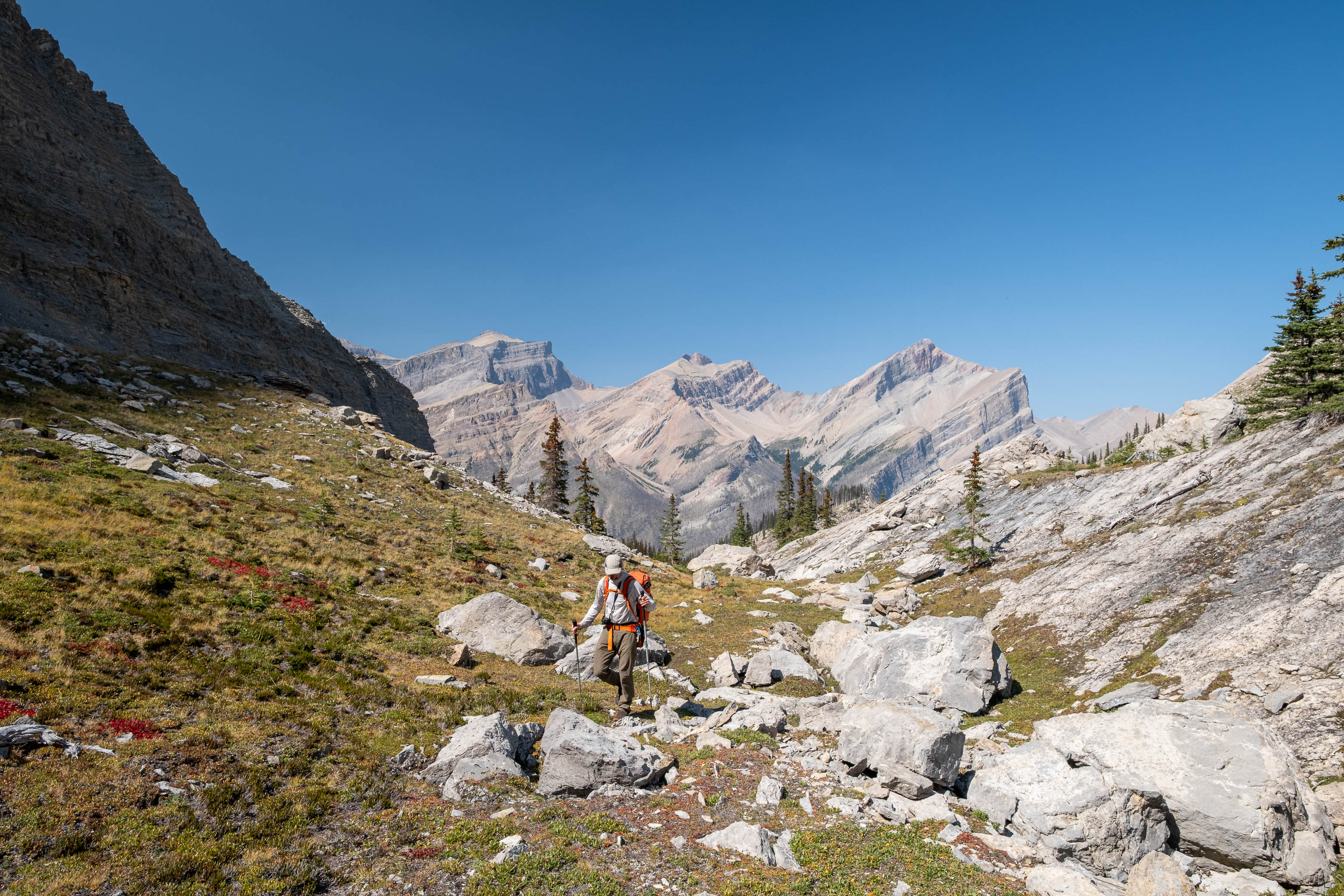 Views open up behind us as we enter the hanging valley of "Chortling Marmots Creek". Mount Loudon, along with its southern hanging valley where we started our morning, rise directly across the Siffleur River Valley (C-R).