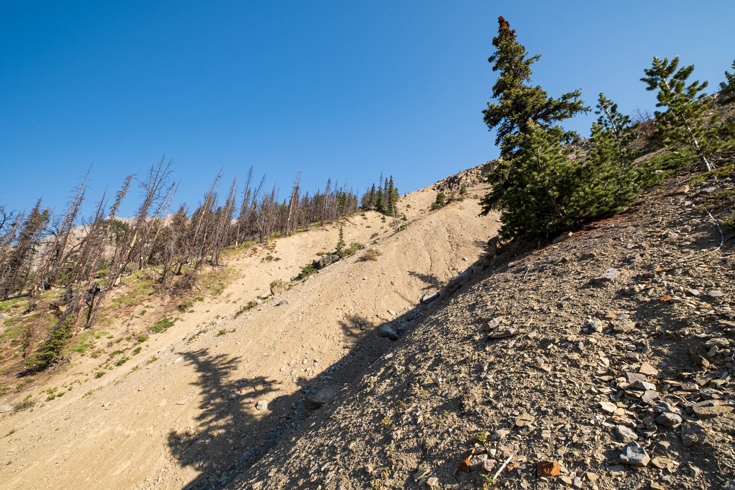 Descending burnt, western slopes down to the Siffleur River.