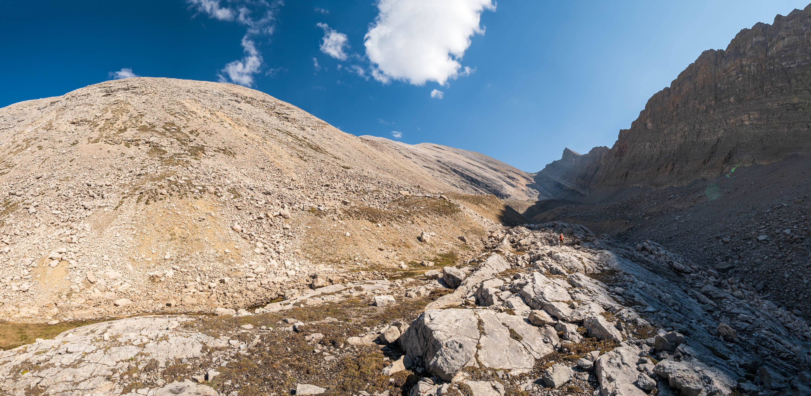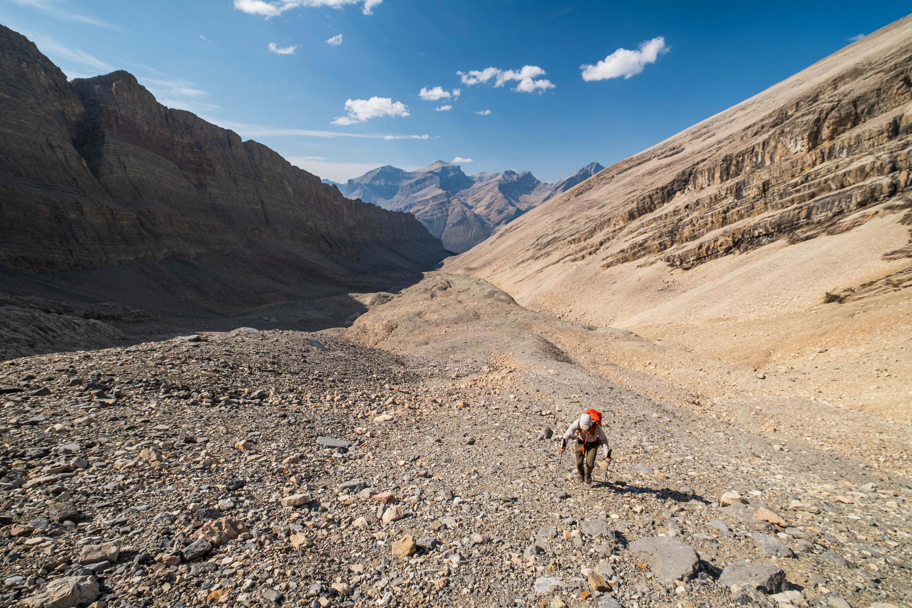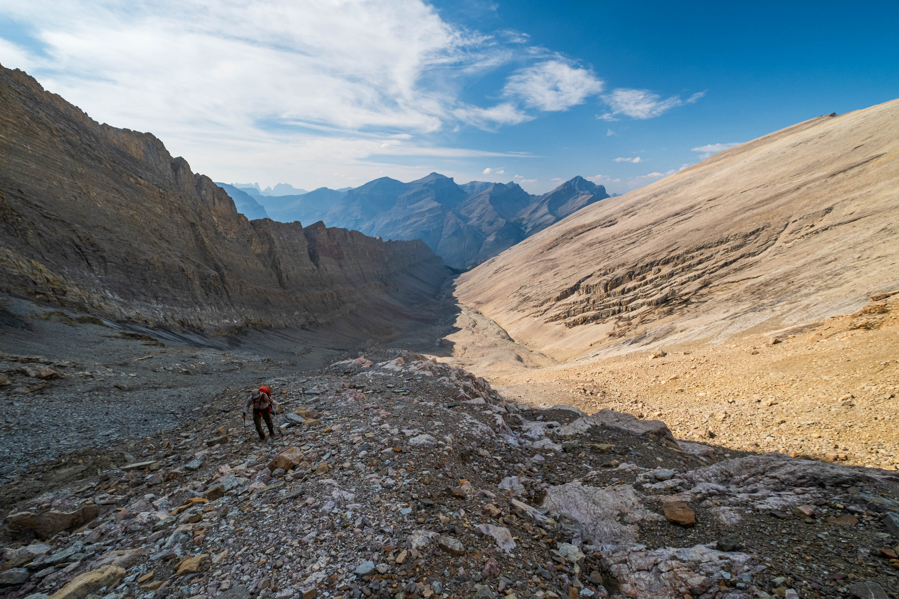 Wandering up the long, rubbly, "Chortling Marmots Creek" Valley. Fuhrer rises out of sight at left, with the distant col we're aiming for straight ahead (C-R).