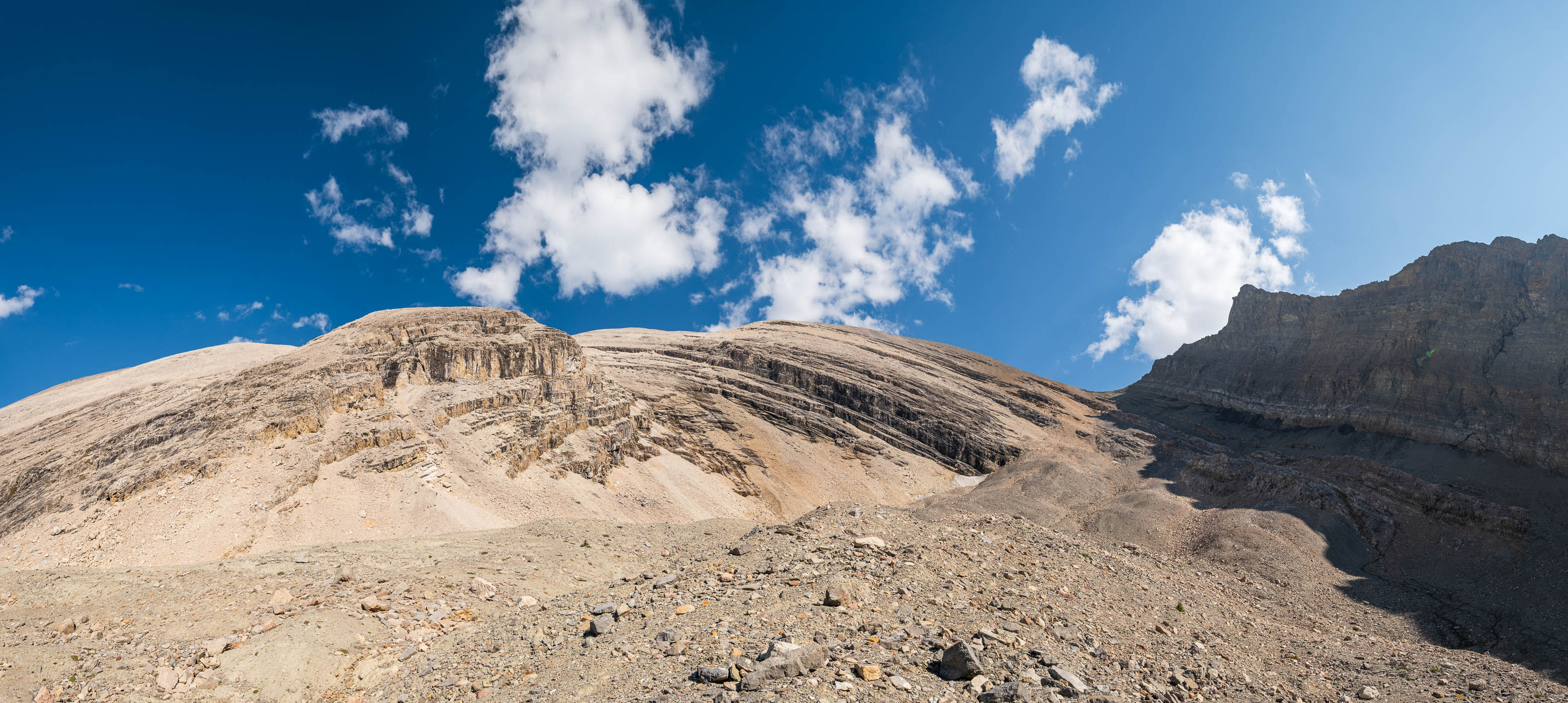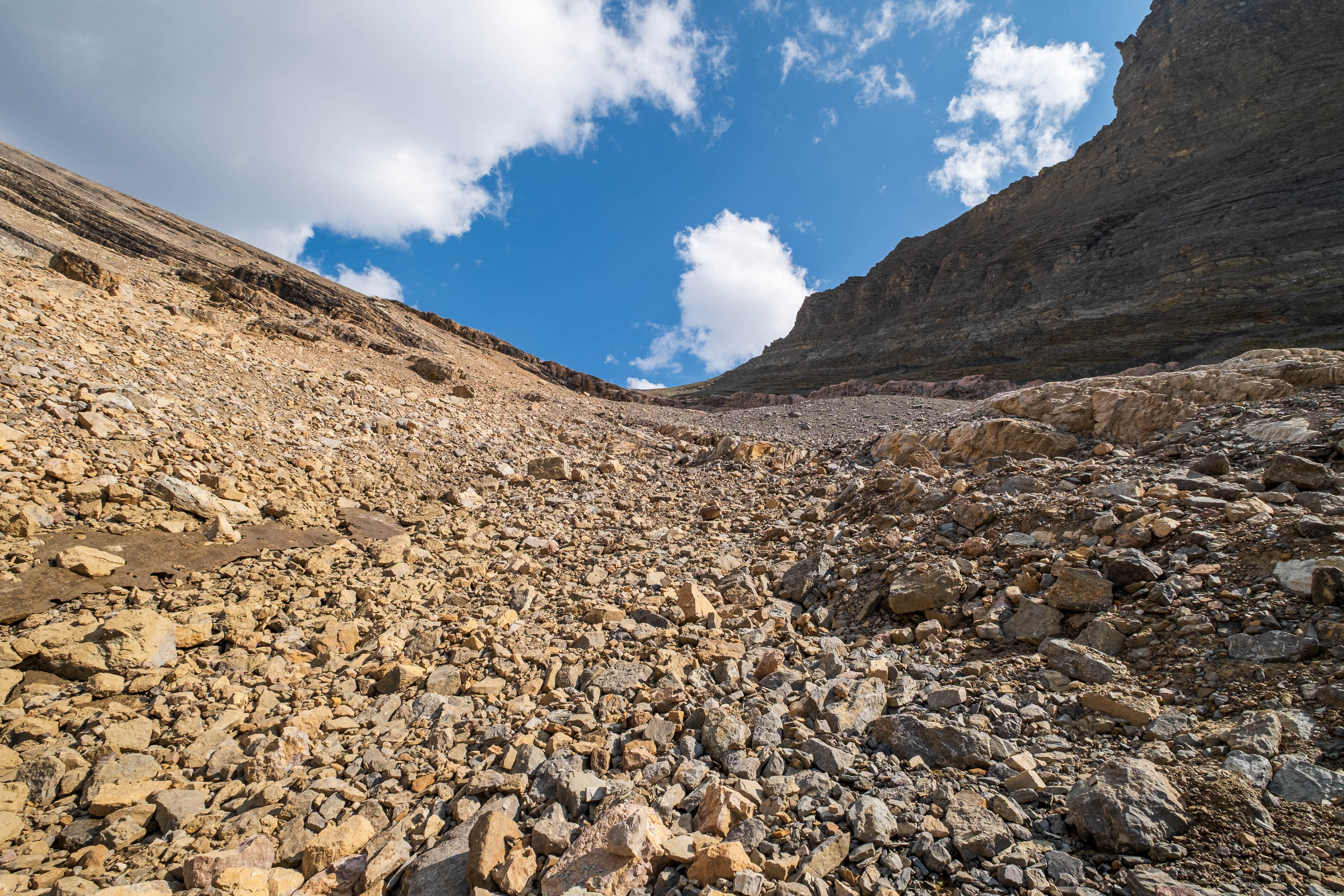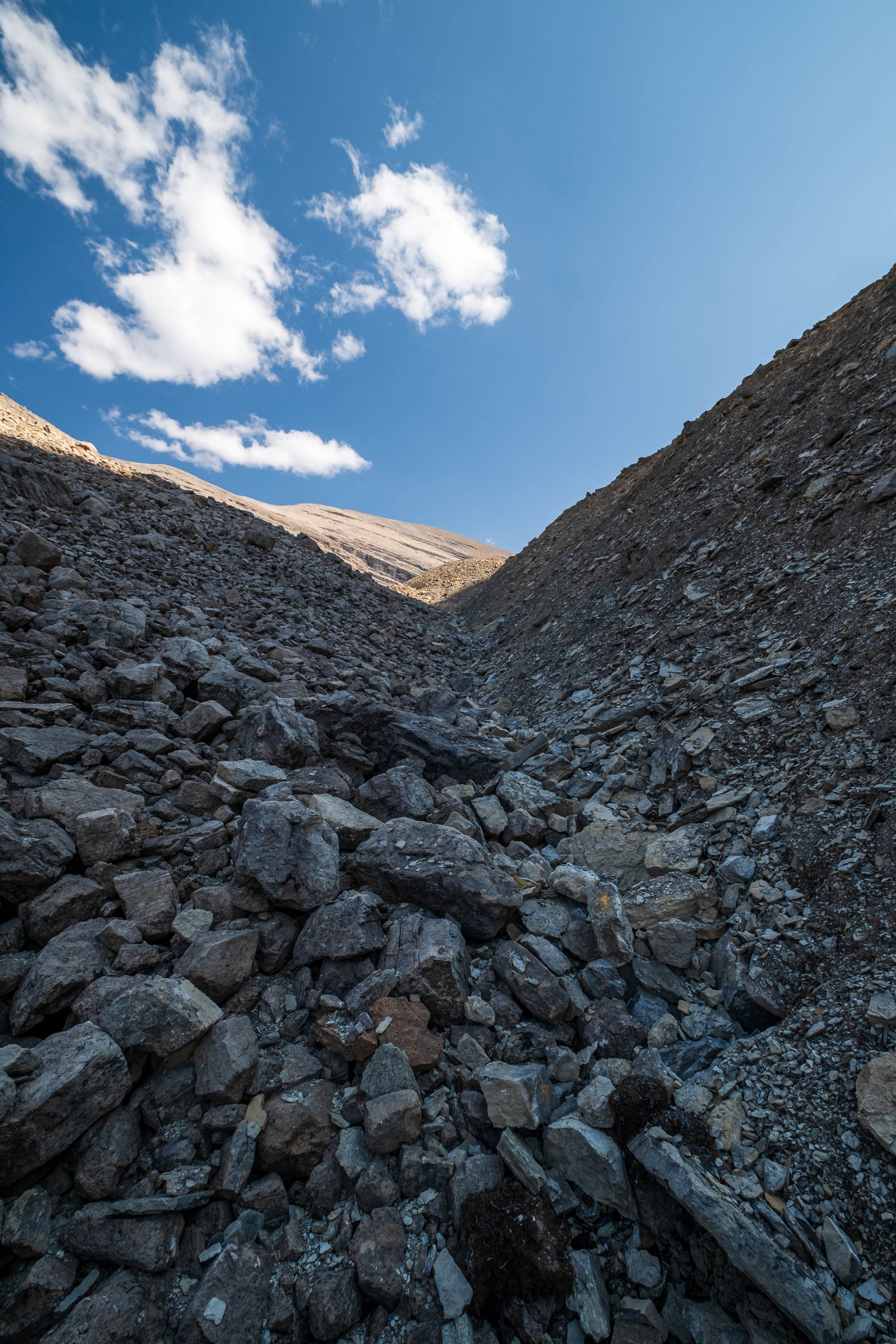 Wandering up the long, rubbly, "Chortling Marmots Creek" Valley. Fuhrer rises out of sight at left, with the distant col we're aiming for straight ahead (C-R).