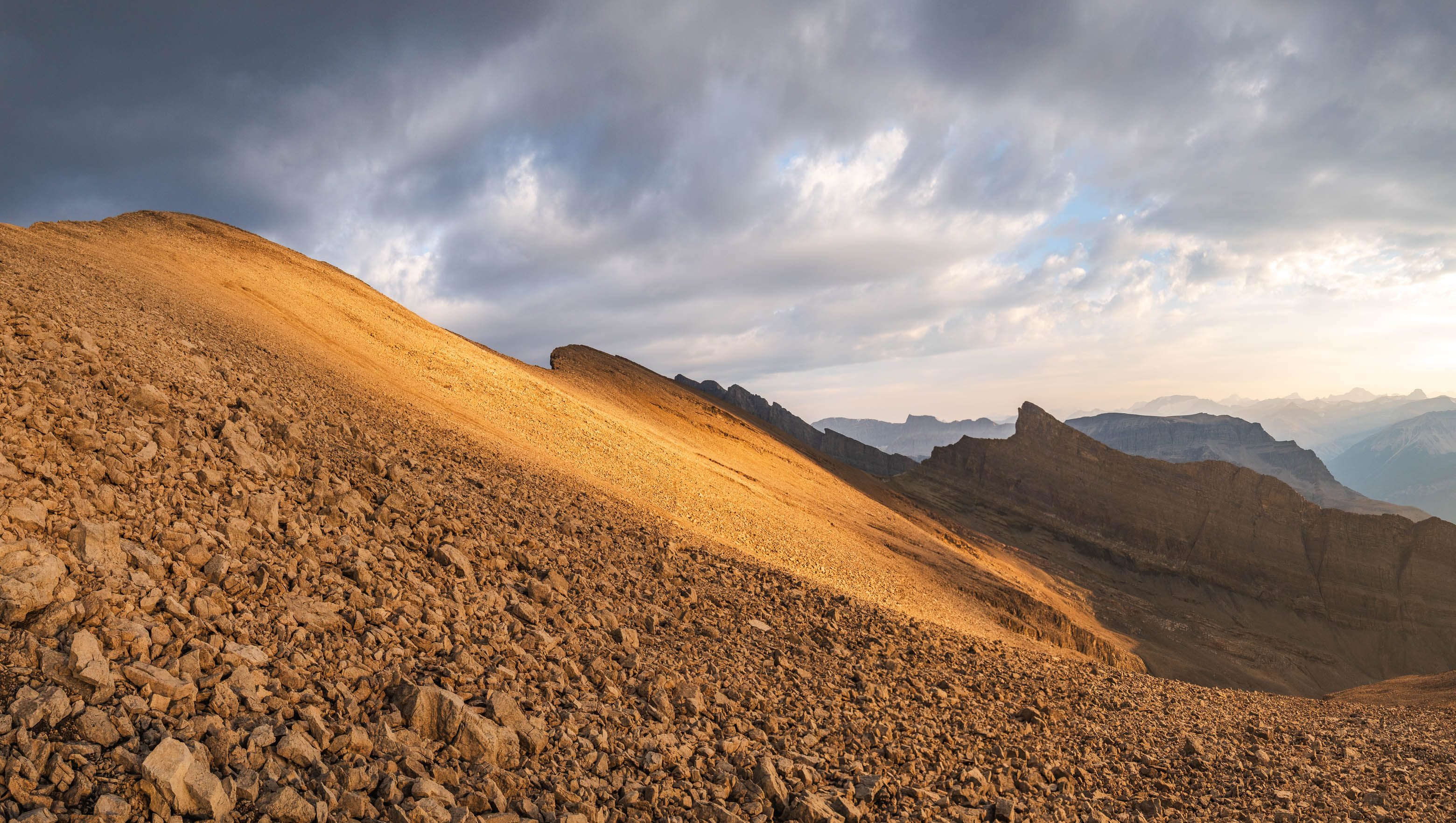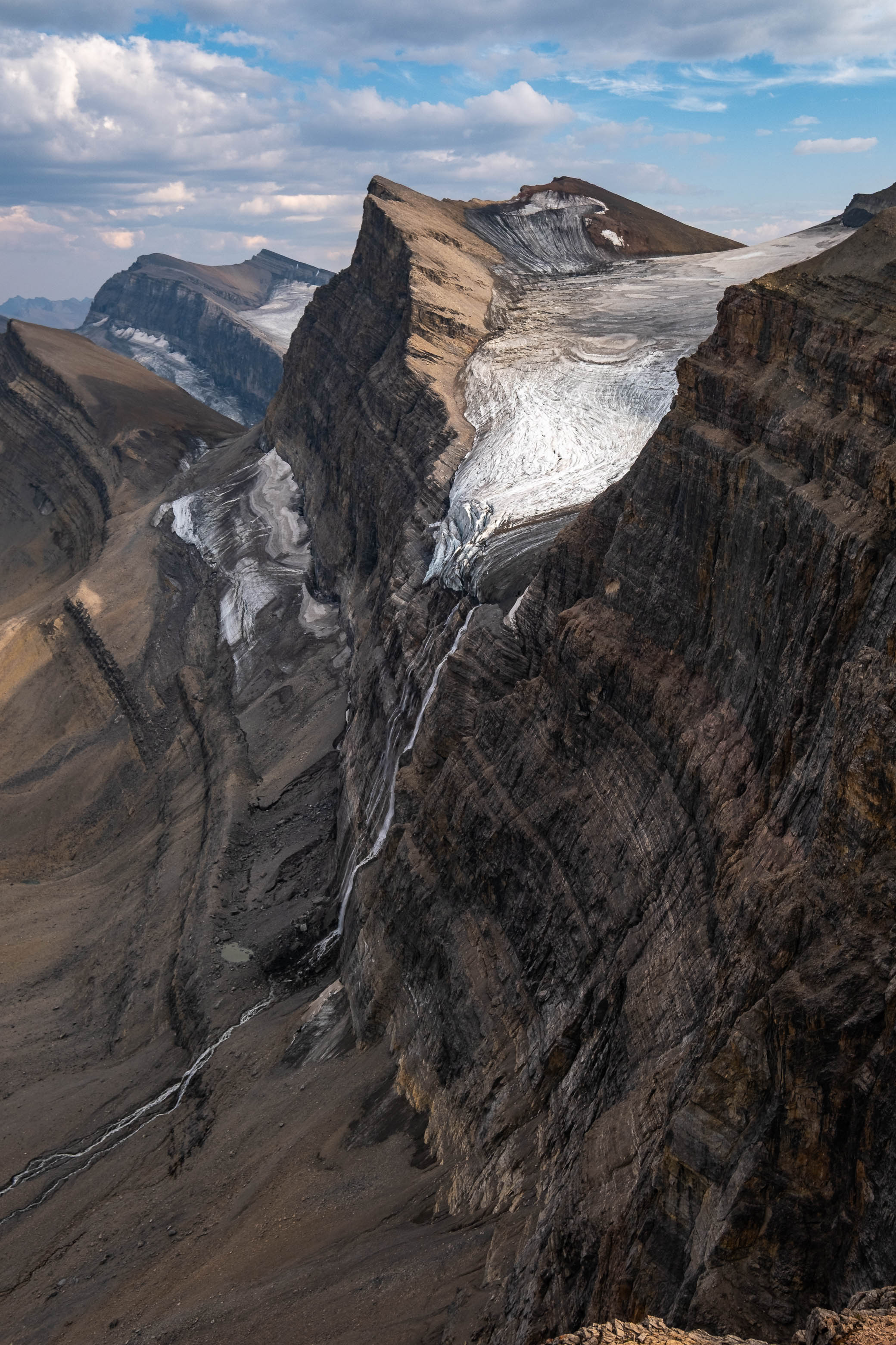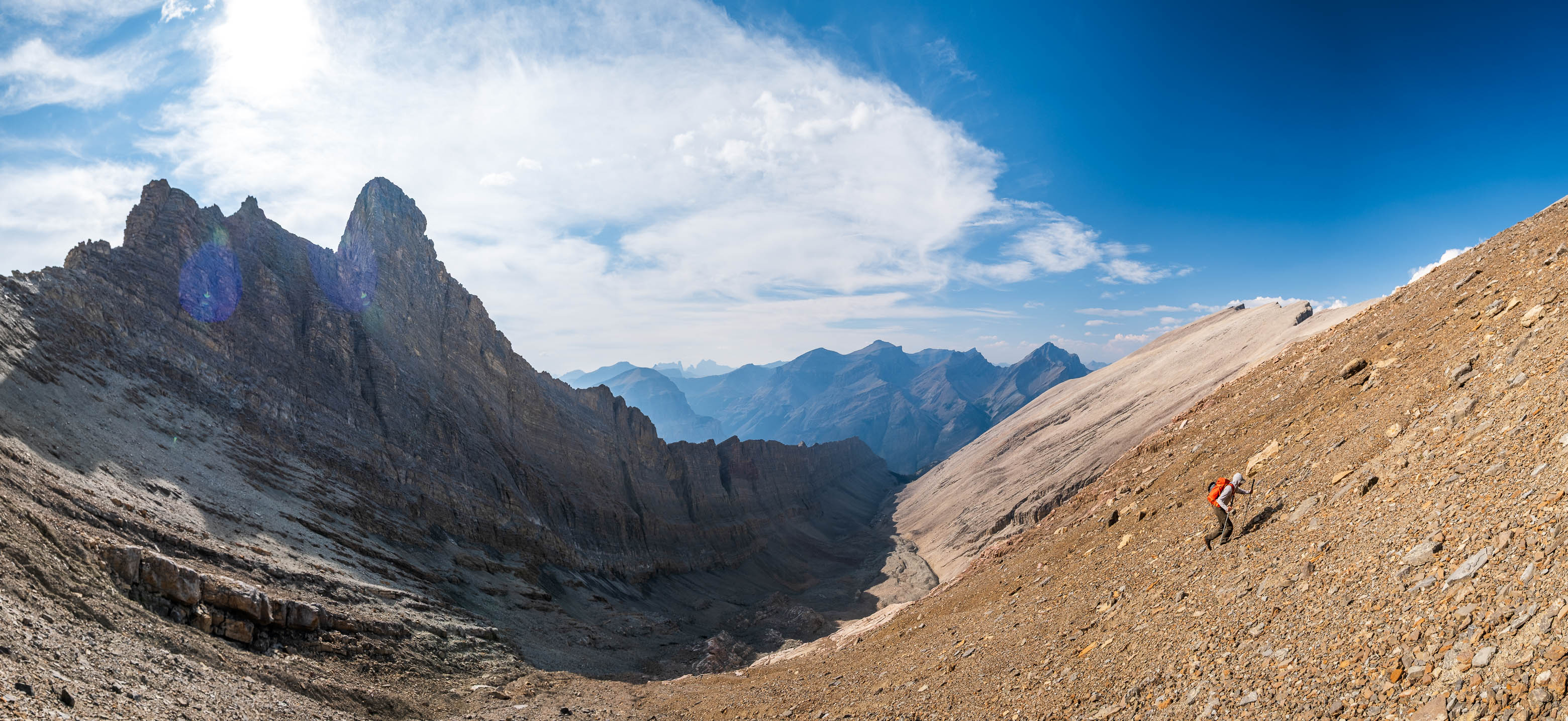 Exiting the hanging "Chortling Marmots Creek" valley, with Loudon and Siffleur rising across the much larger Siffleur River valley.