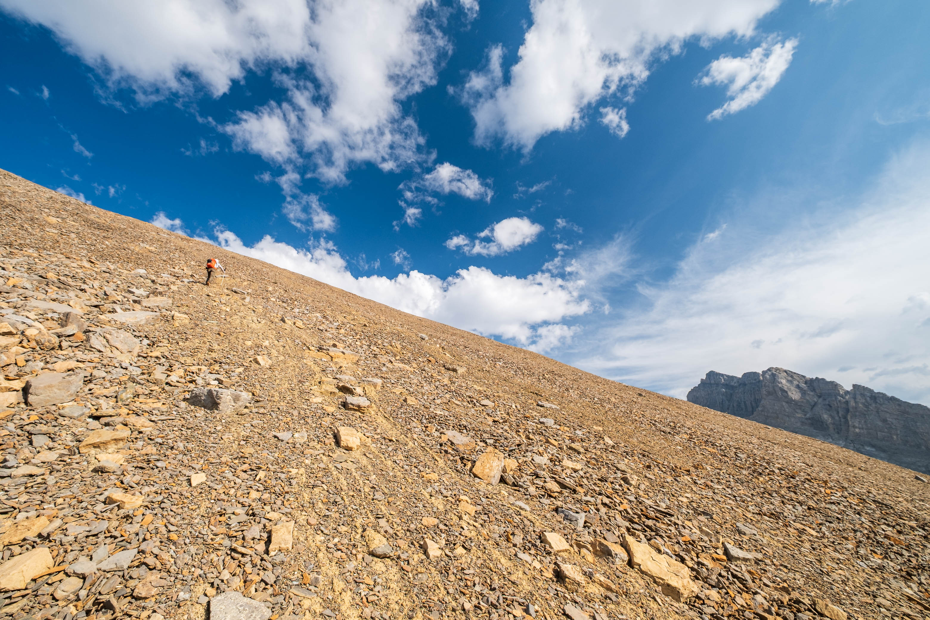 Ascending scree and shale slopes to Fuhrer's southern summit ridge.