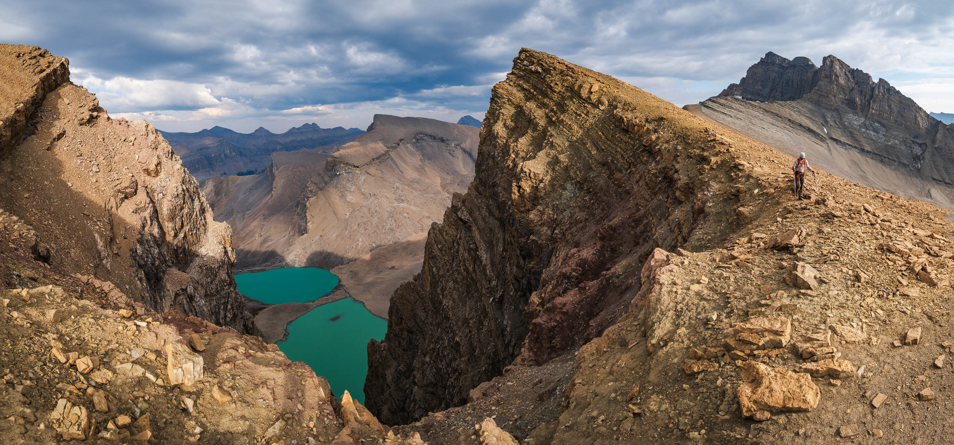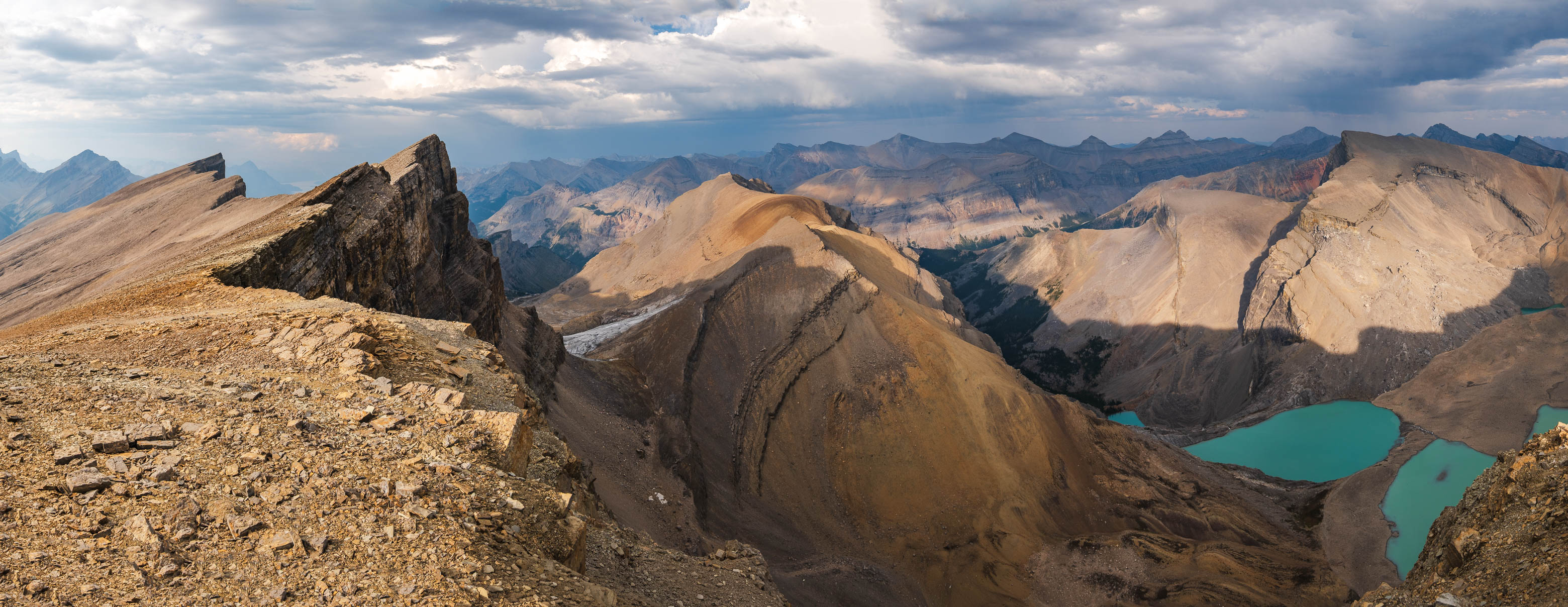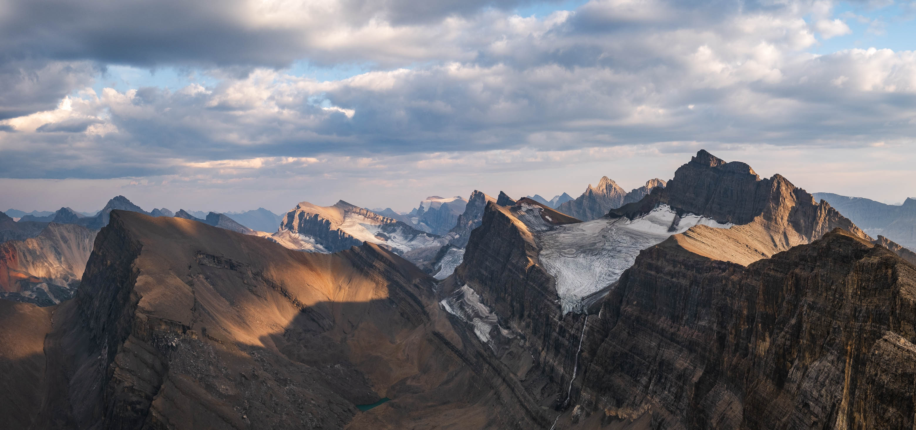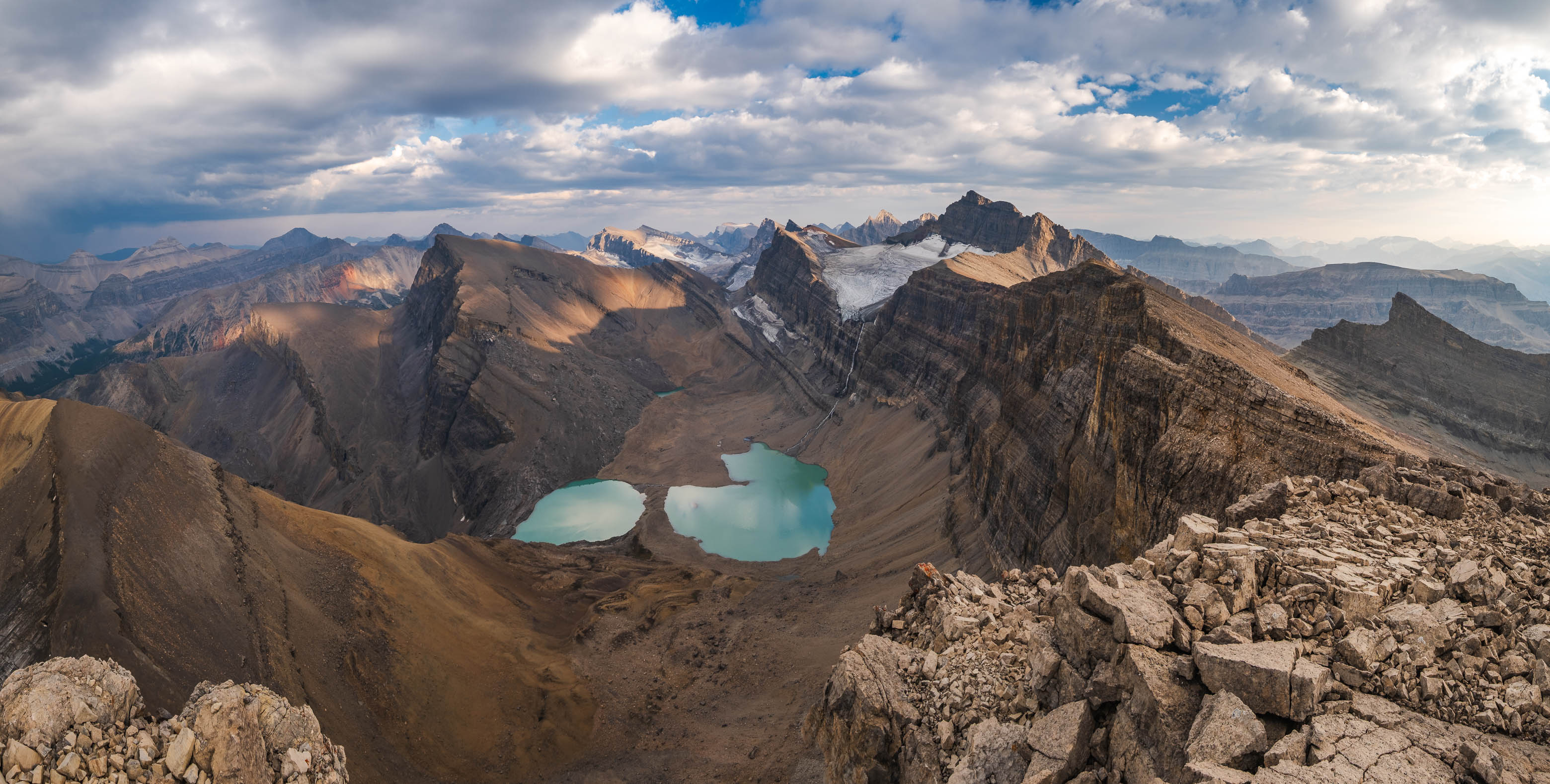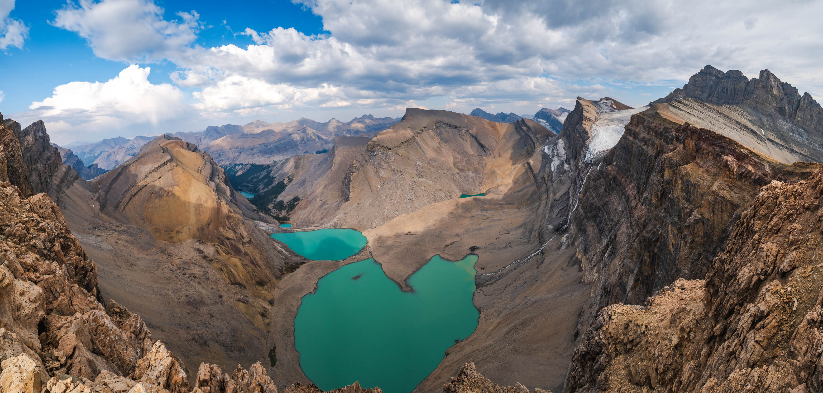 A thick layer of cloud rolled in as we climbed these final 100 vertical meters, but views were still incredible as we traversed directly above Fuhrer's sheer east face. A few minor ups and downs later, we found ourselves at the small summit cairn built by Vern and Wietse just one month prior, accompanied by yet another magnificent summit panorama to reward us for our efforts. The lower two Fuhrer Lakes were blocked out from this angle, but the views we gained off Fuhrer's NE face easily made up for it, with a small hidden glacier feeding a couple more colourful tarns, 500 meters directly below us!