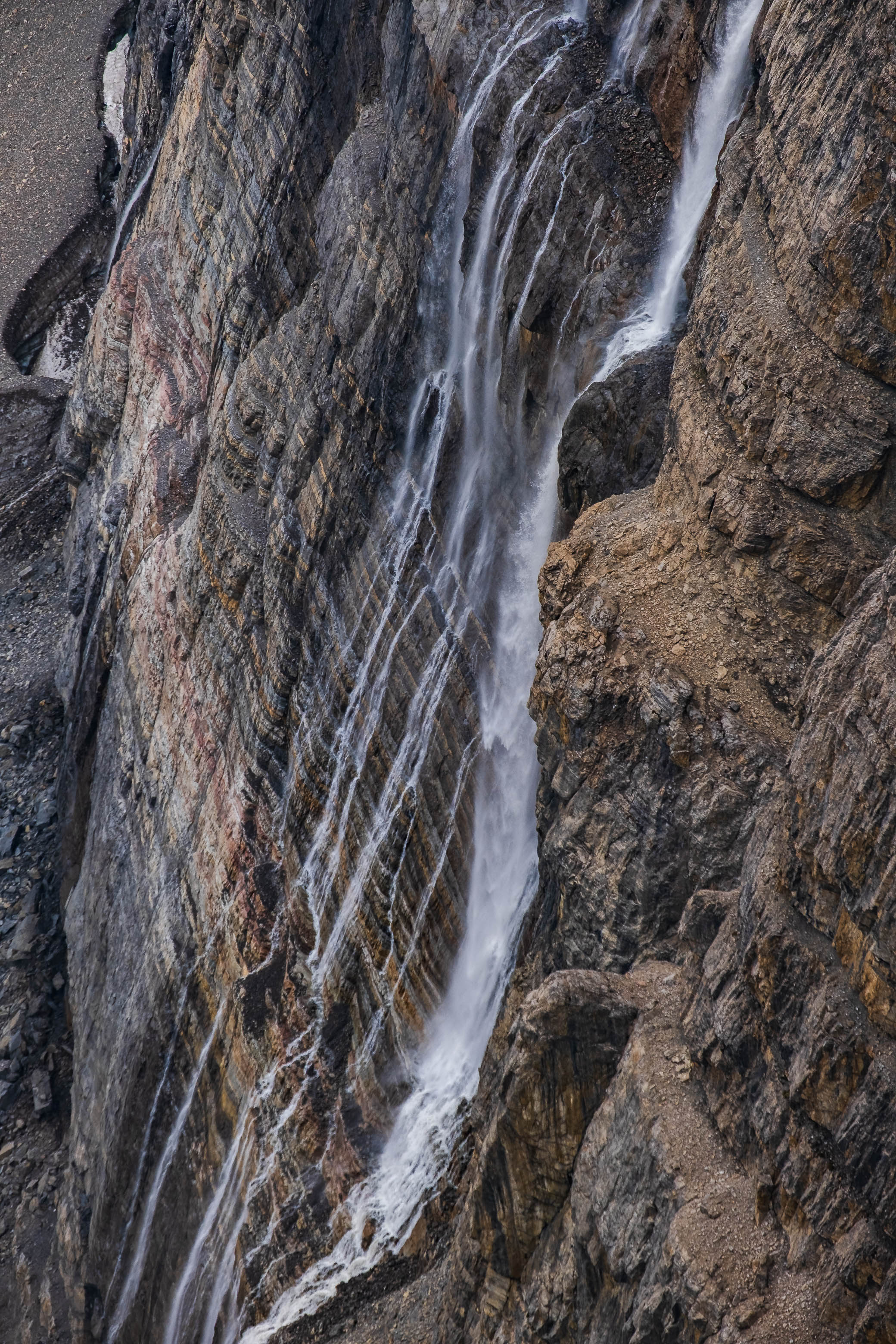 An incredible waterfall crashes down the cliffs below Abstruse's NE glacier to feed the Fuhrer Lakes!
