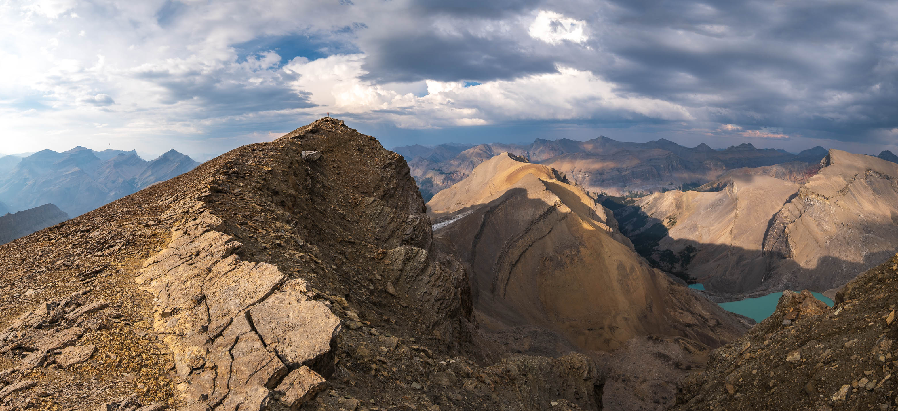 Having traversed the summit ridge at a very leisurely pace (the views were just a little bit distracting...), and with dark t-storms brewing ominously to the east, we didn't have much time to waste. After leaving a small film canister summit register (I meant to add in Rick Collier's 2000 ascent and Vern and Wietse's July 29, 2023 ascent, but it totally slipped my mind in the moment!), and snapping a few more pictures, we continued to follow in Vern and Wietse's footsteps - taking a more direct line back to camp by continuing down the ridge to the NW before angling down steep, western rubble slopes back to Chortling Marmots Creek.