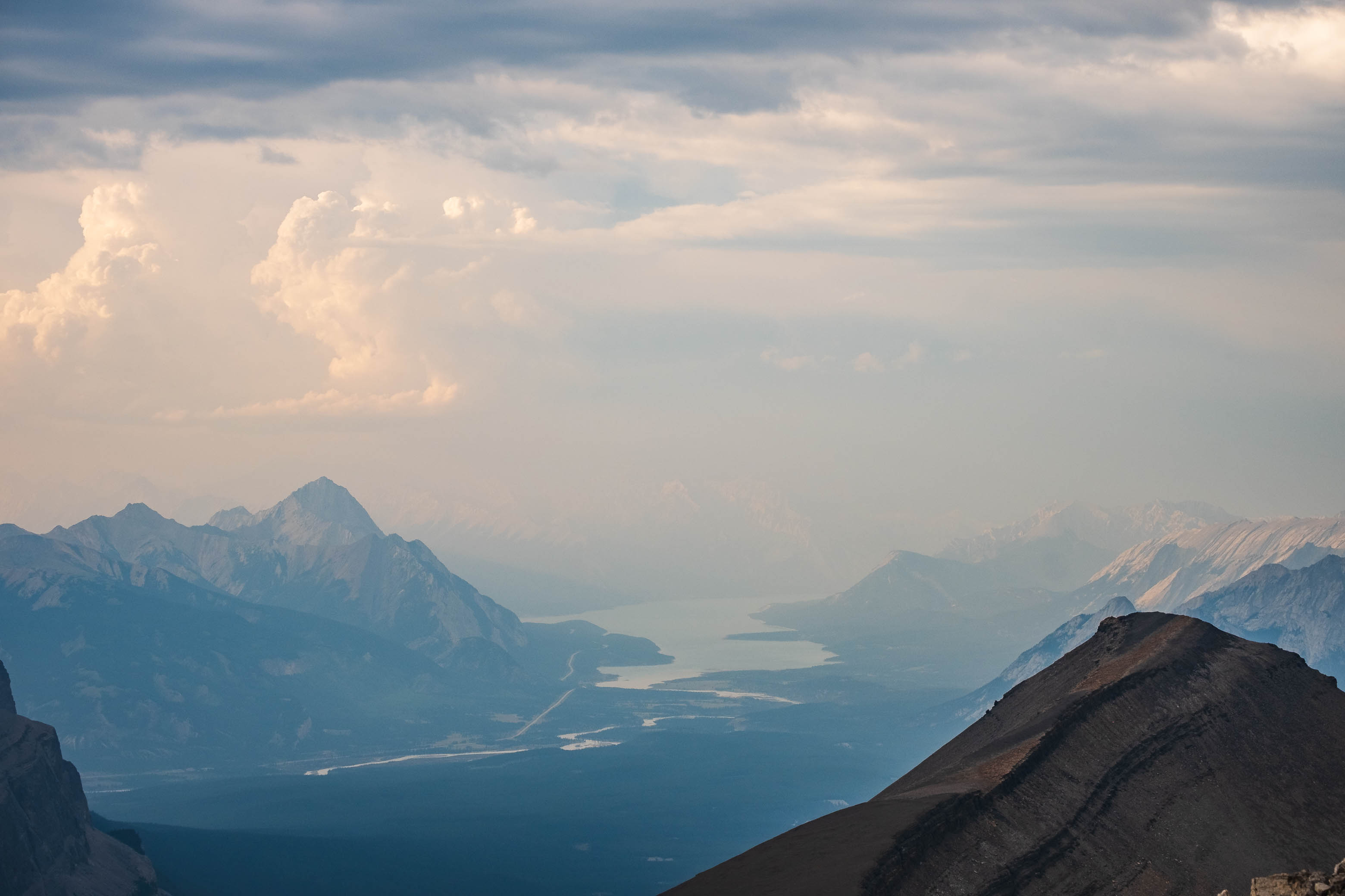 Hazy views beyond Mount Heinrich to Elliot Peak, Abraham Lake, and the Siffleur Falls Staging Area, where we started our adventure three days ago!
