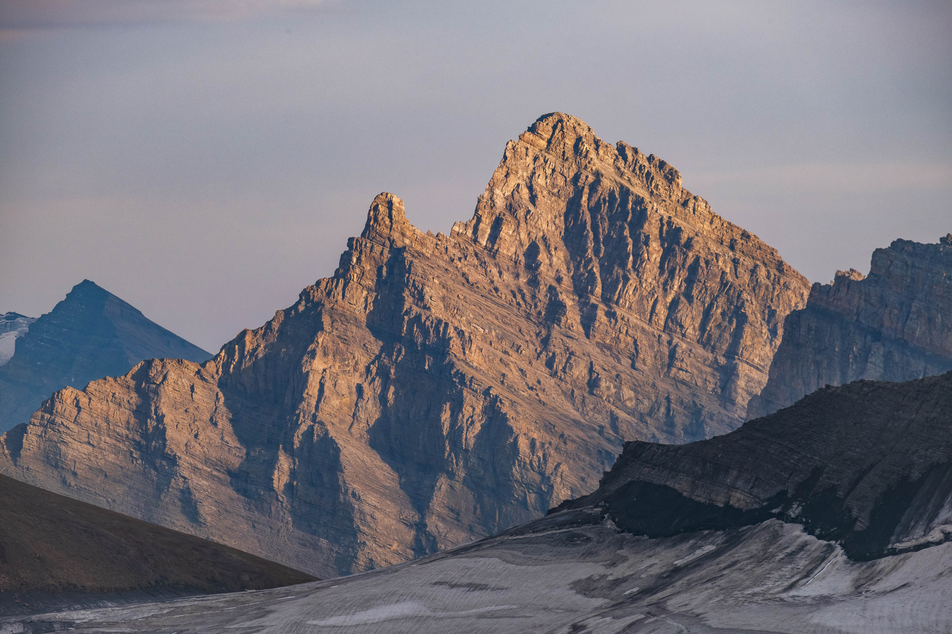 Erudite Peak is briefly highlighted in beautiful evening light, with Cheshire Peak rising in the shadows beyond.