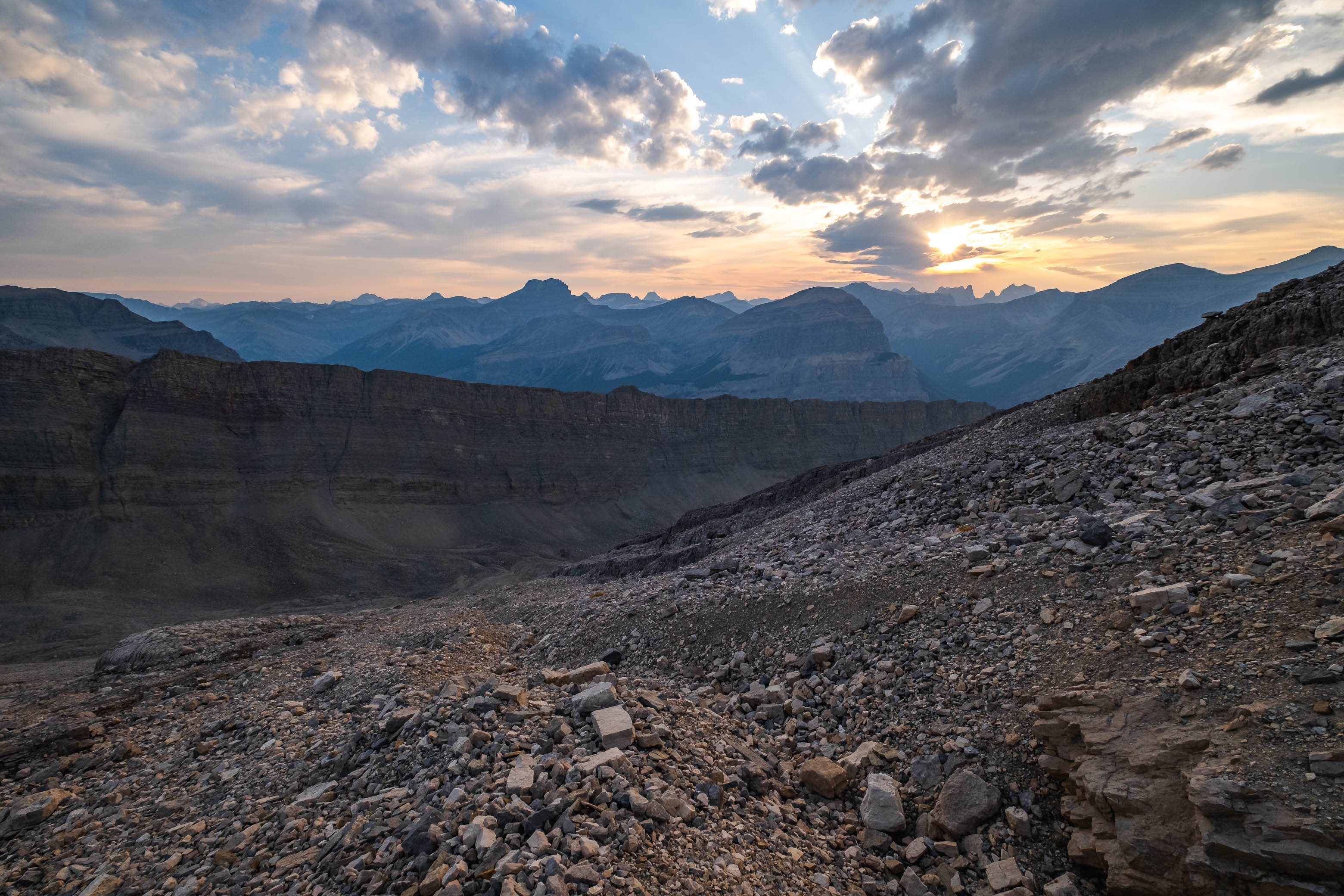 The sun slowly sets over a sea of peaks in Banff National Park.