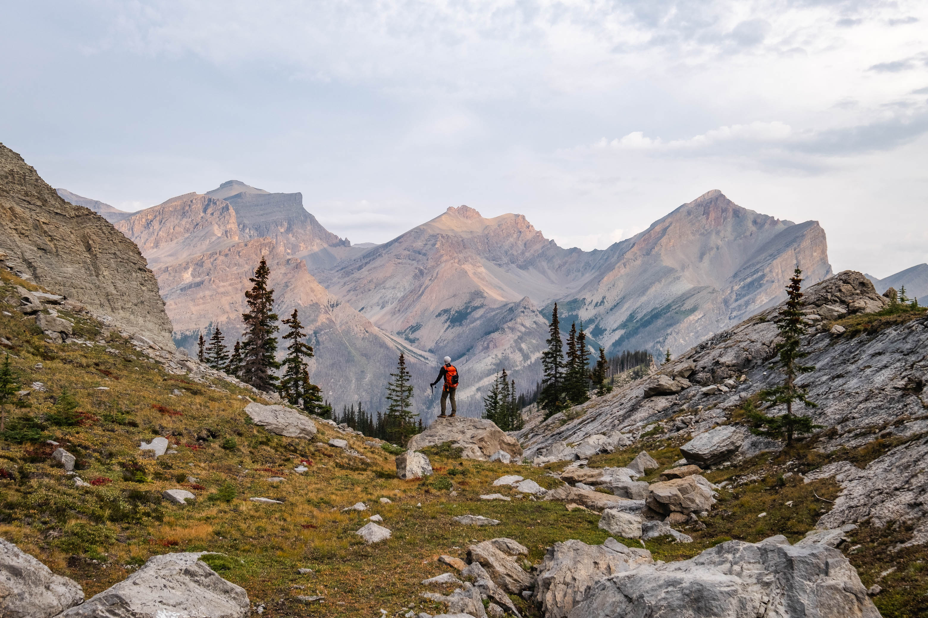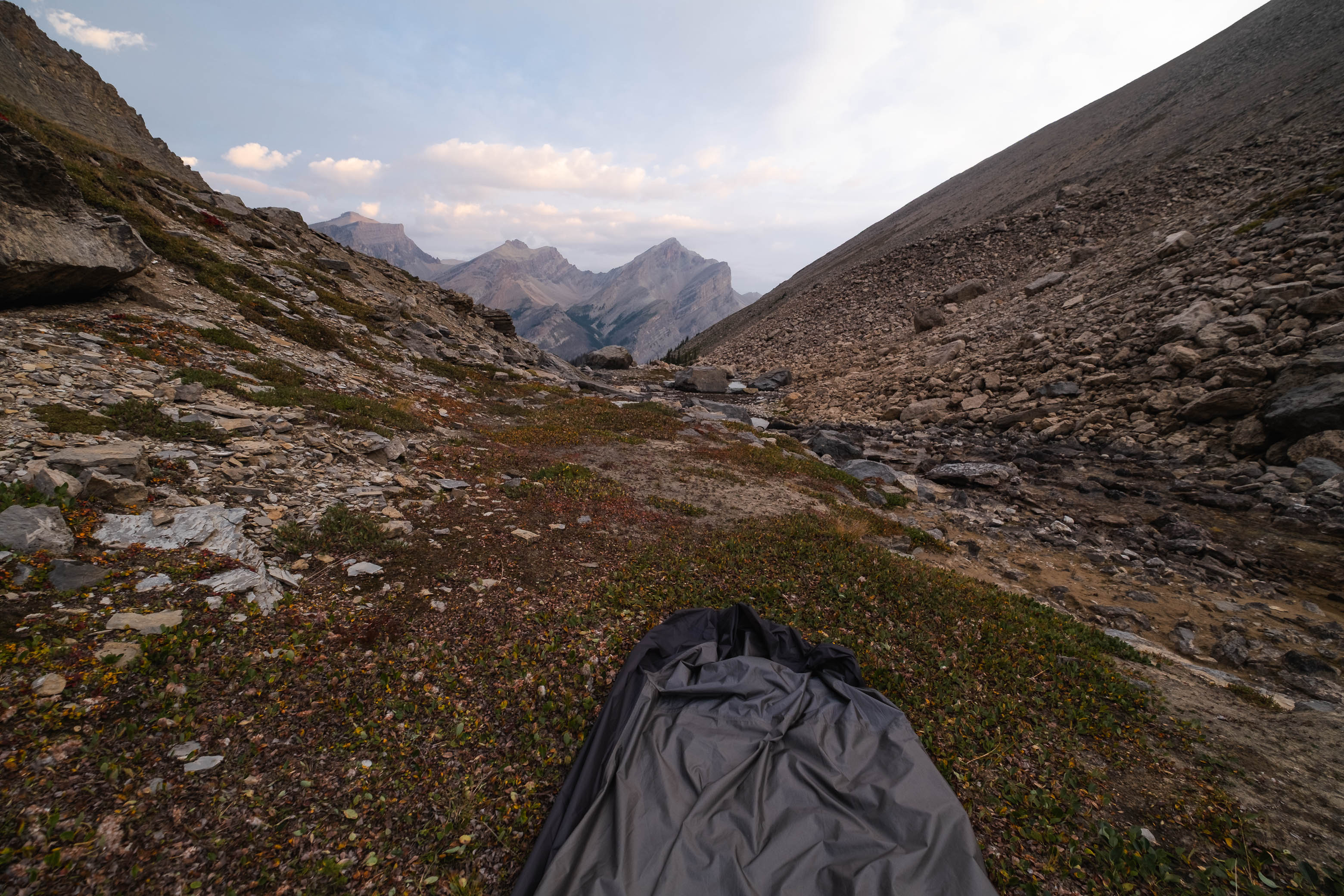 Thanks to some sporadic rain showers throughout the night, our final sleep in the backcountry was definitely more restless than the first two had been. When the sun finally rose around 07:00, I was more than a little bit eager to say goodbye to the claustrophobic confines of my bivy bag, and quickly packed up for a long exit back to the Siffleur Falls Staging Area.