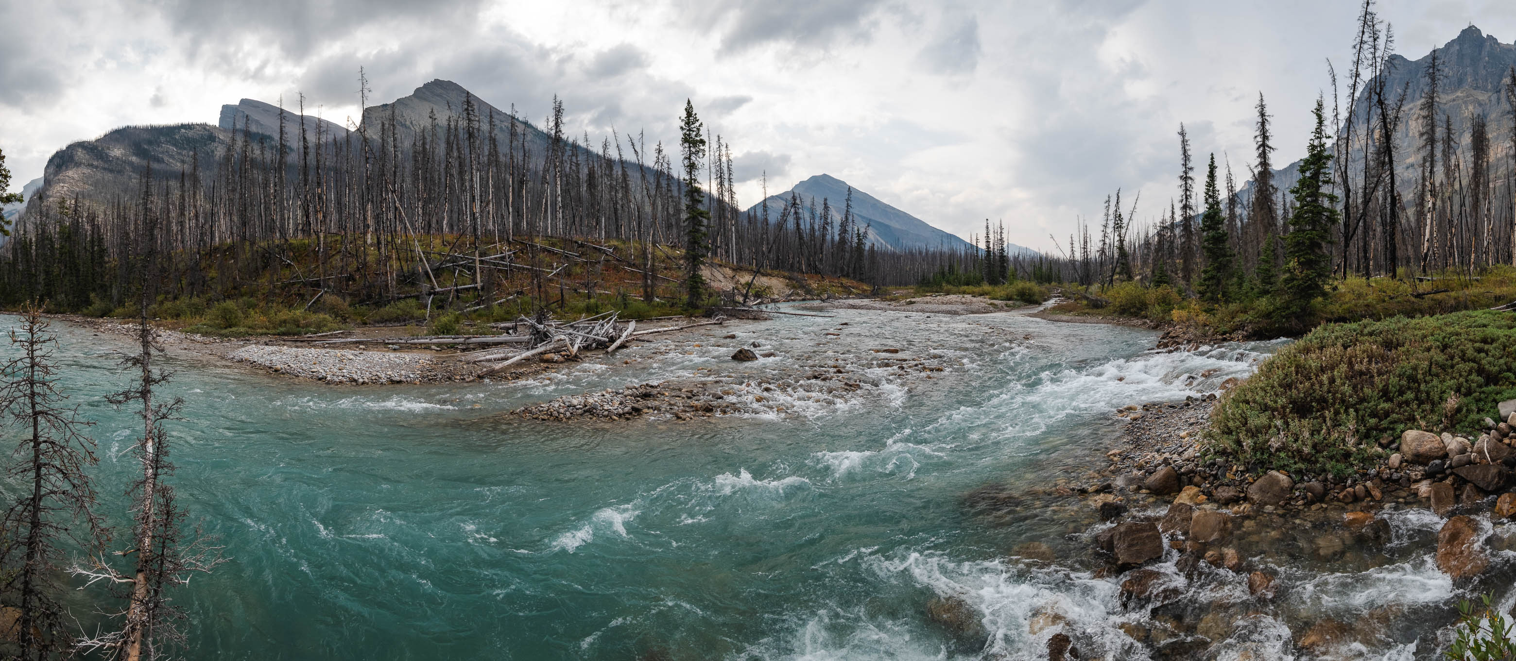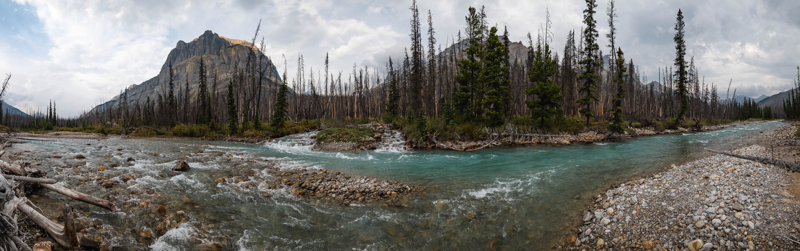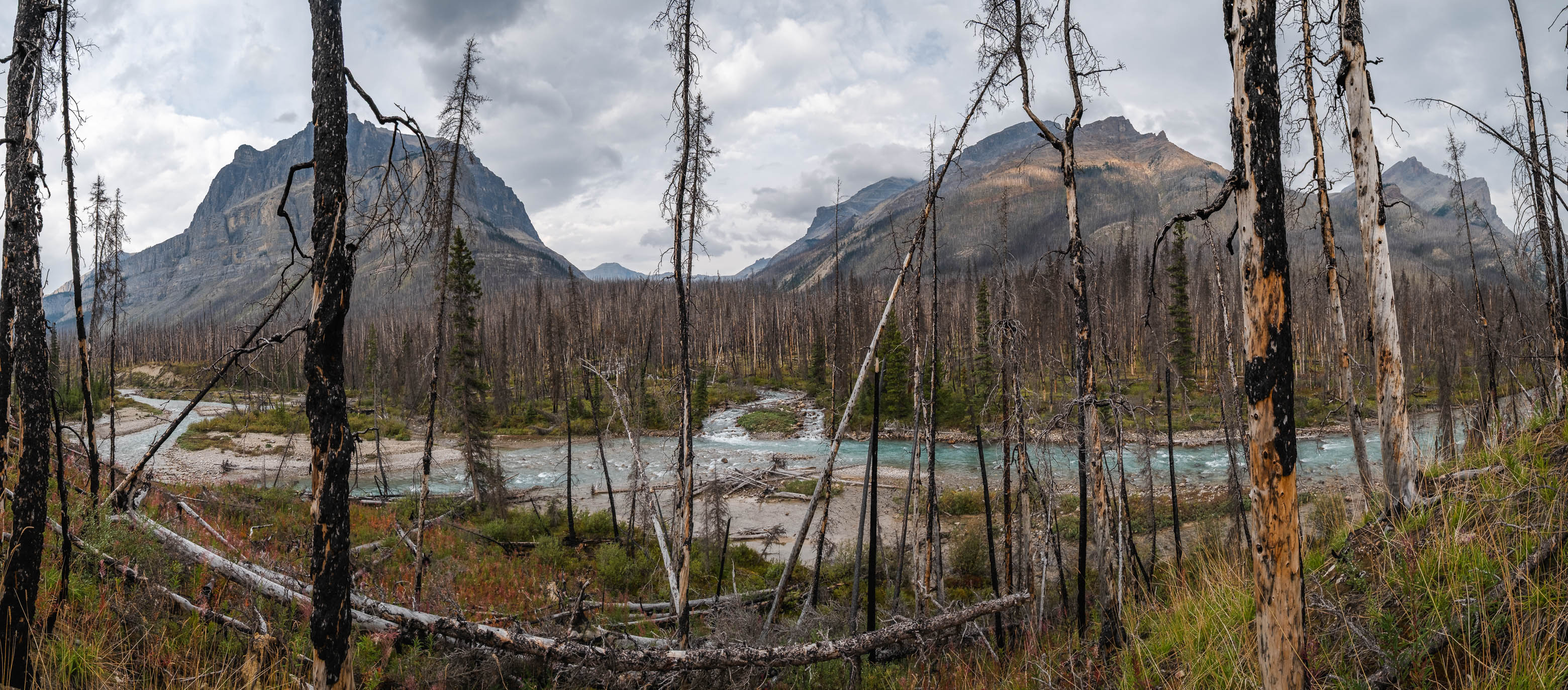 Exiting the burnt forest with a distant NE outlier of Quill, Loudon, and Siffleur rising across the Siffleur River.