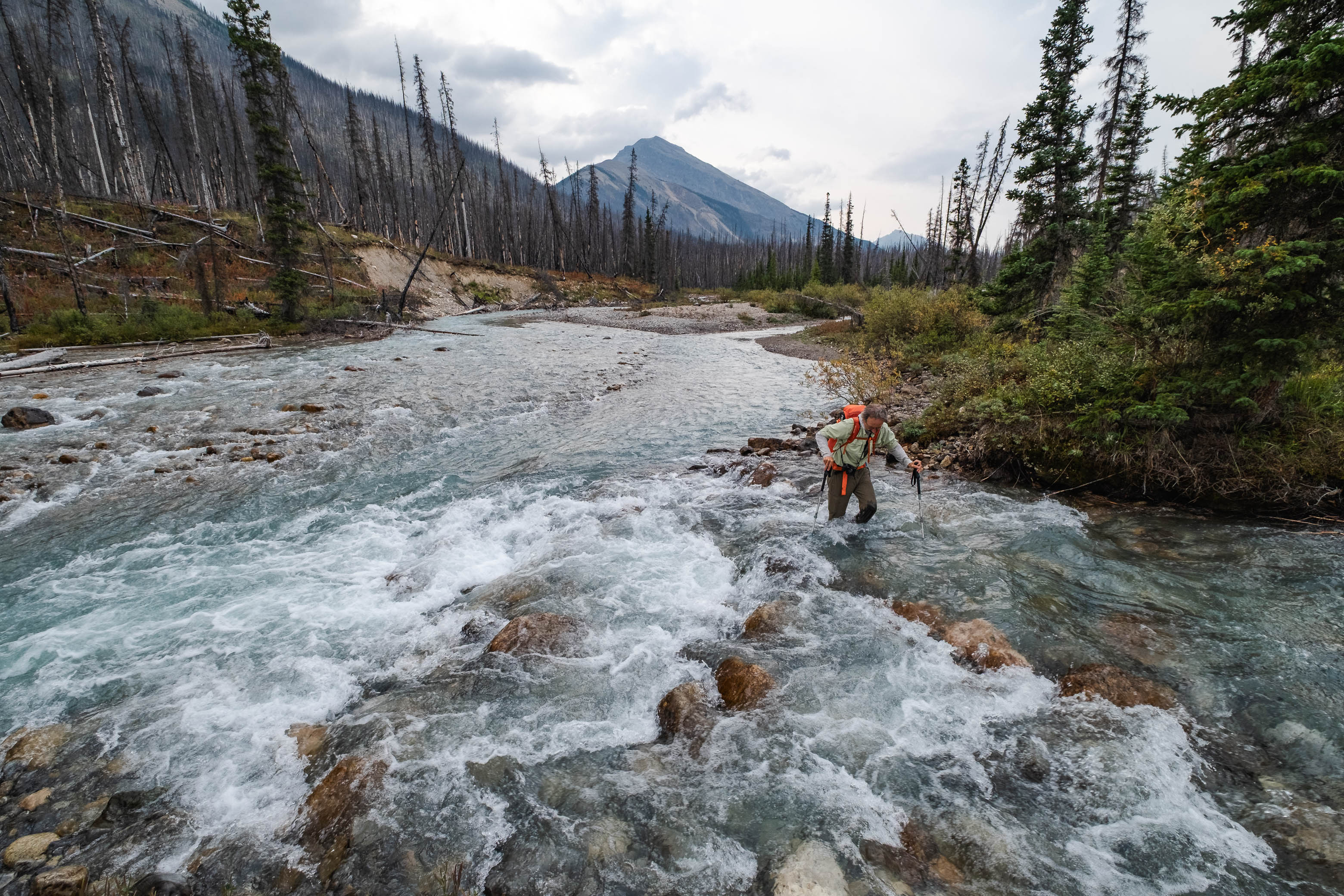 Note how much deeper the water is on the right compared to the left. This is thanks to the added flow from Porcupine Creek (center), which we avoided by angling upstream to cross the Siffleur, before tackling Porcupine Creek separately.