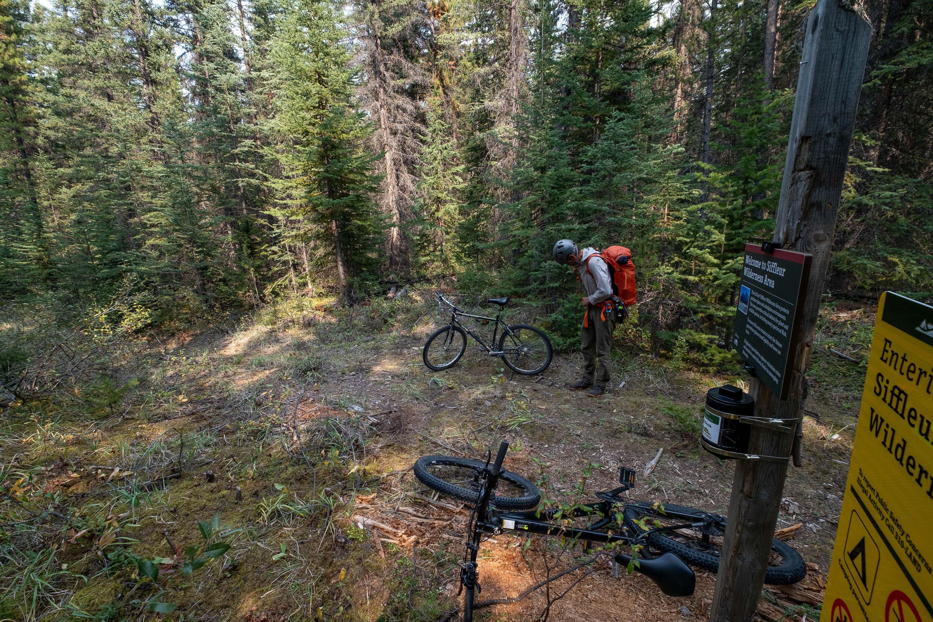 When we arrived back to our stashed bikes at the wilderness boundary, we opened up the recently installed log book to find one entry since Vern and Wietse's trip. It was some snarky comment about there being too many restrictions on the Siffleur Wilderness Area, and while we originally had no intention of writing anything in the log book, we simply couldn't resist adding a counter comment applauding Alberta Parks for how wild and beautiful the area has been kept and asking that it remains that way.