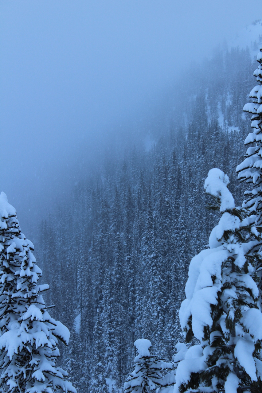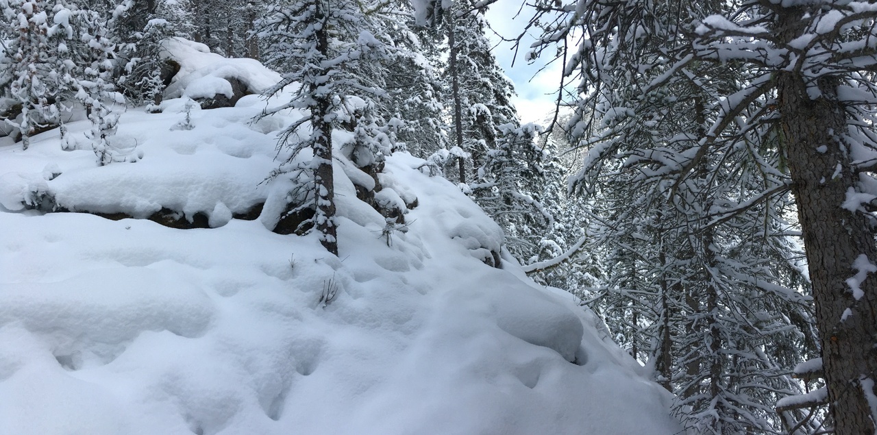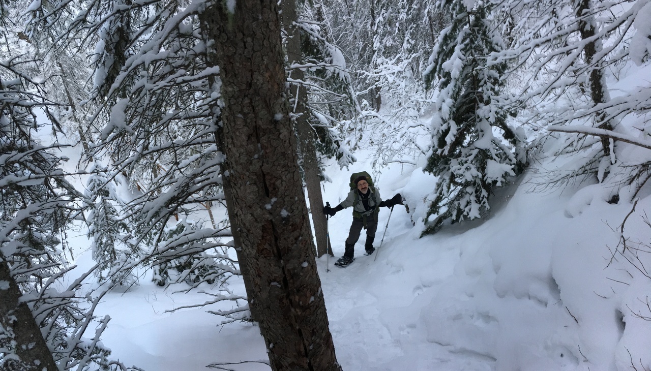 Climbing this steep slope on snowshoes was quite the adventure! Shout-out to the trees for being there when I needed them most, to drag myself up the super slippery snow!