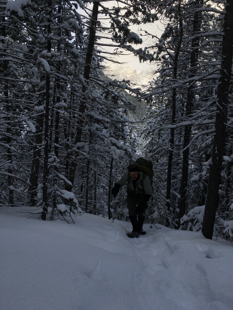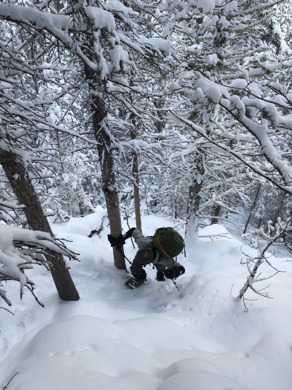 Crux #2 of the day: descending the steep section back down to the creek on snowshoes!! We may or may not have fallen on our butts a few times...