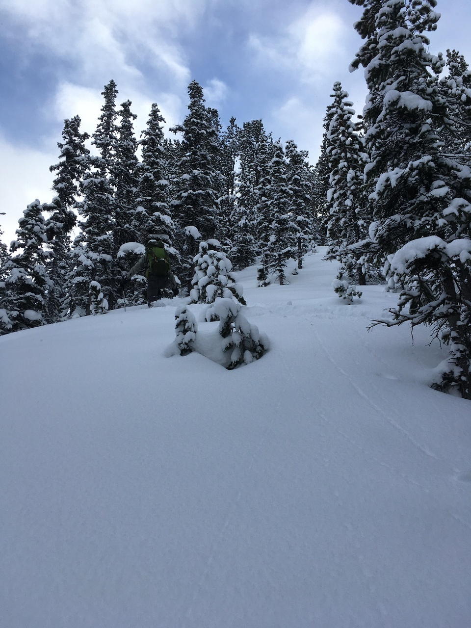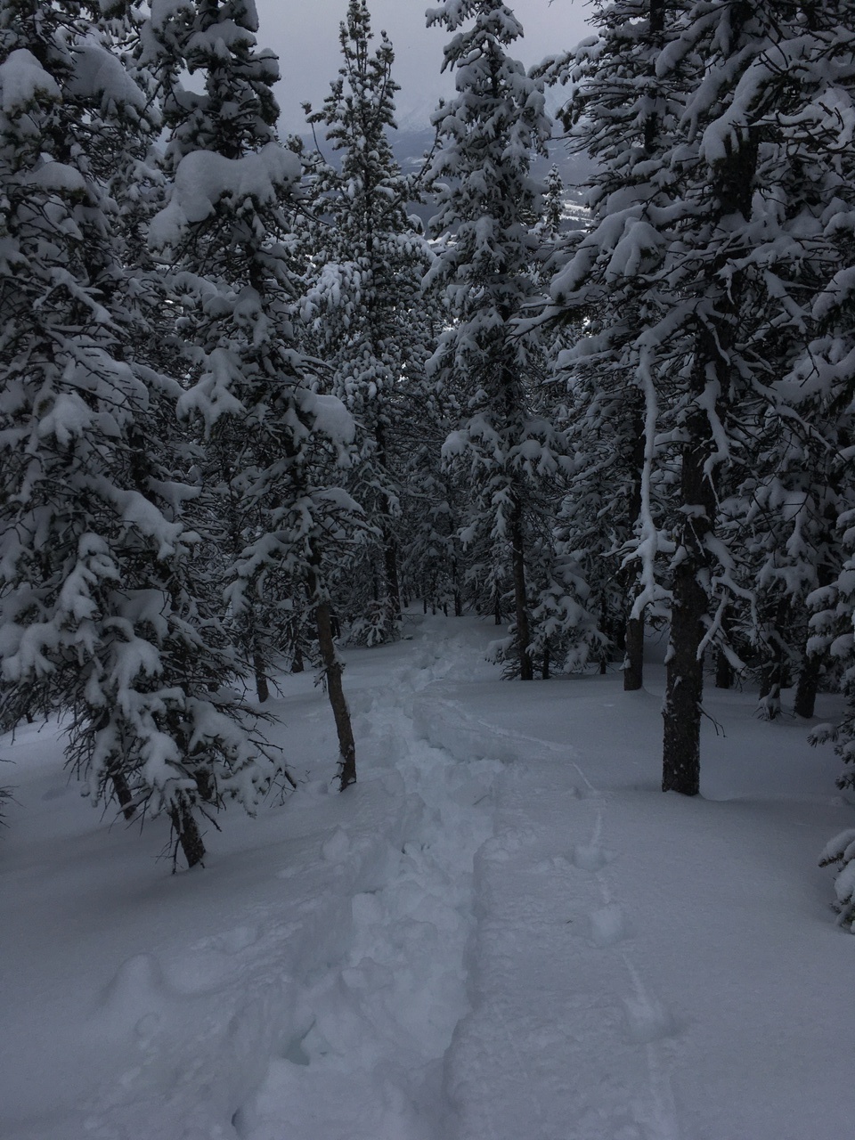 Following our tracks back down the mountain. If I'm being honest, I actually spent more time off our tracks, unable to resist descending the deep soft powder beside...it's too much fun!...Though it might make things confusing if people try to follow our tracks now...oops