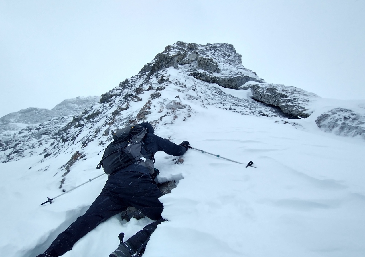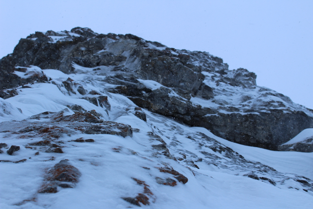 My dad gave it a go with snowshoes, but would end up sliding all the way back down to me in slow-motion as he dug his poles in, trying to get a grip on anything! But the fine, crystalized snow just rained down off the slabbly rock beneath. We decided it was time to switch to microspikes, as a slip slightly further up the crux was not an option!