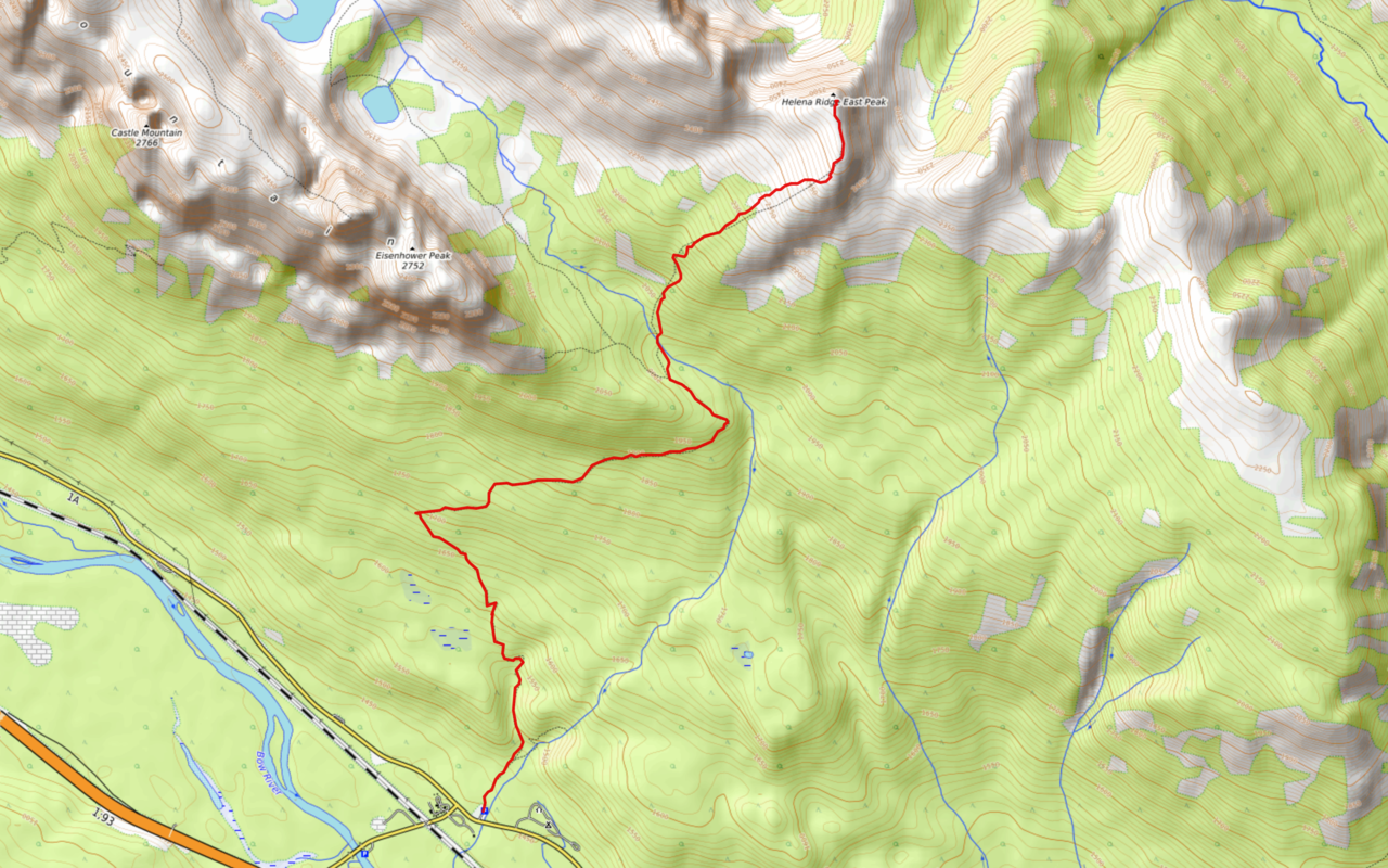 We got a quick glimpse of the south end of Helena Ridge East Peak (right), before heading deep into the forest!