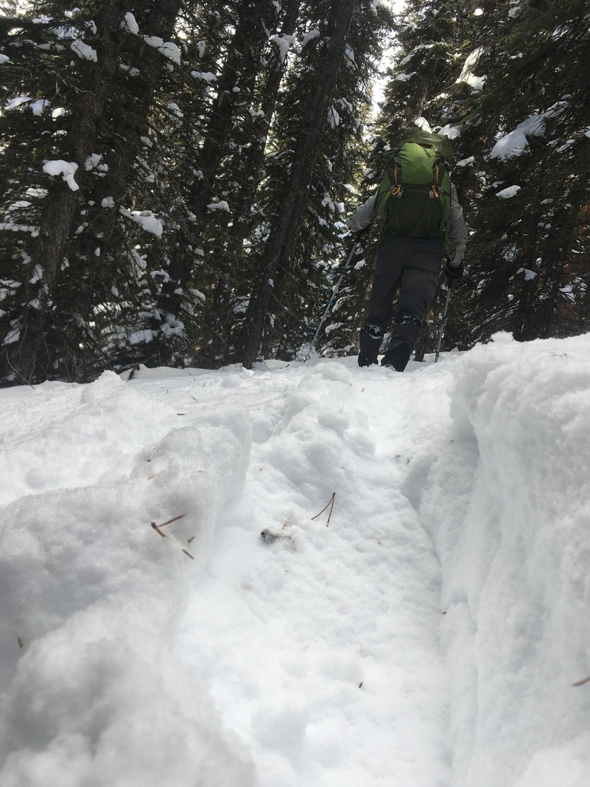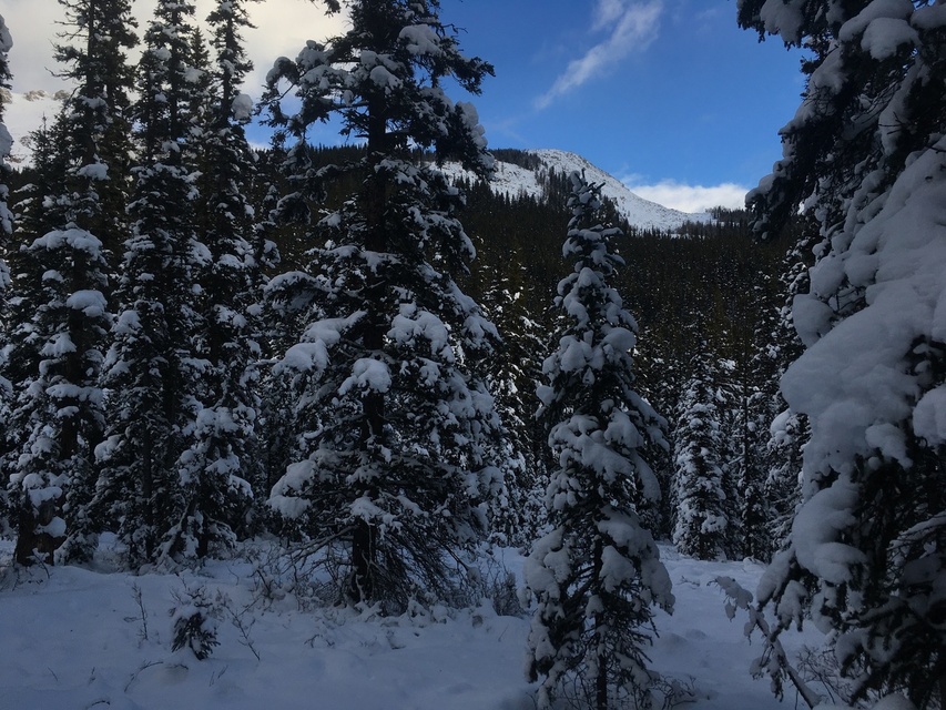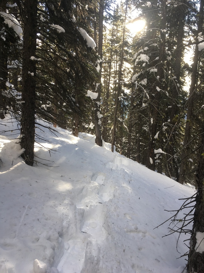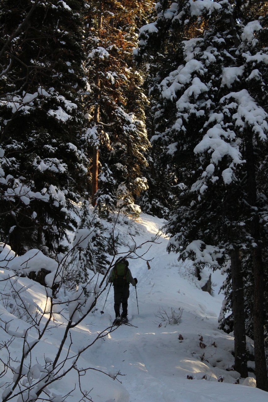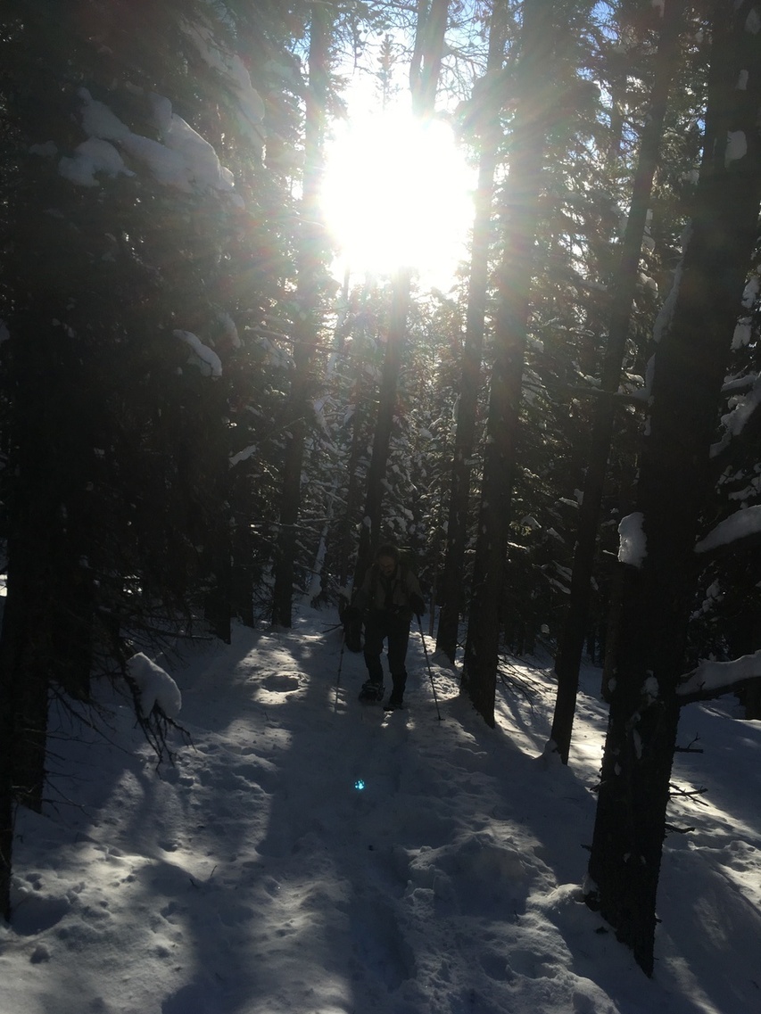The sun rises as we continue up the trail! A couple people already broke the Rockbound Lake trail for us (looked like a set of ski tracks and snowshoe tracks), making our work easy to start our day!