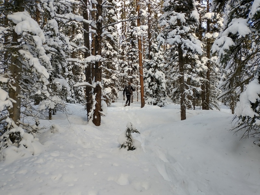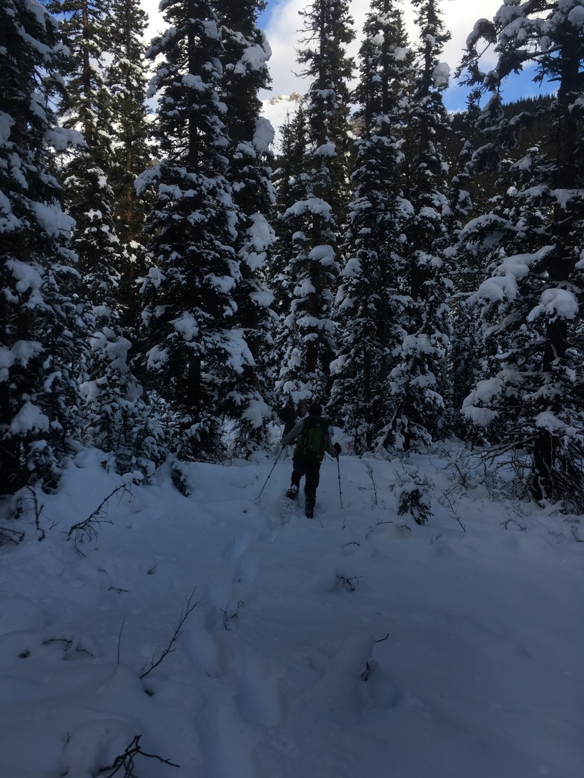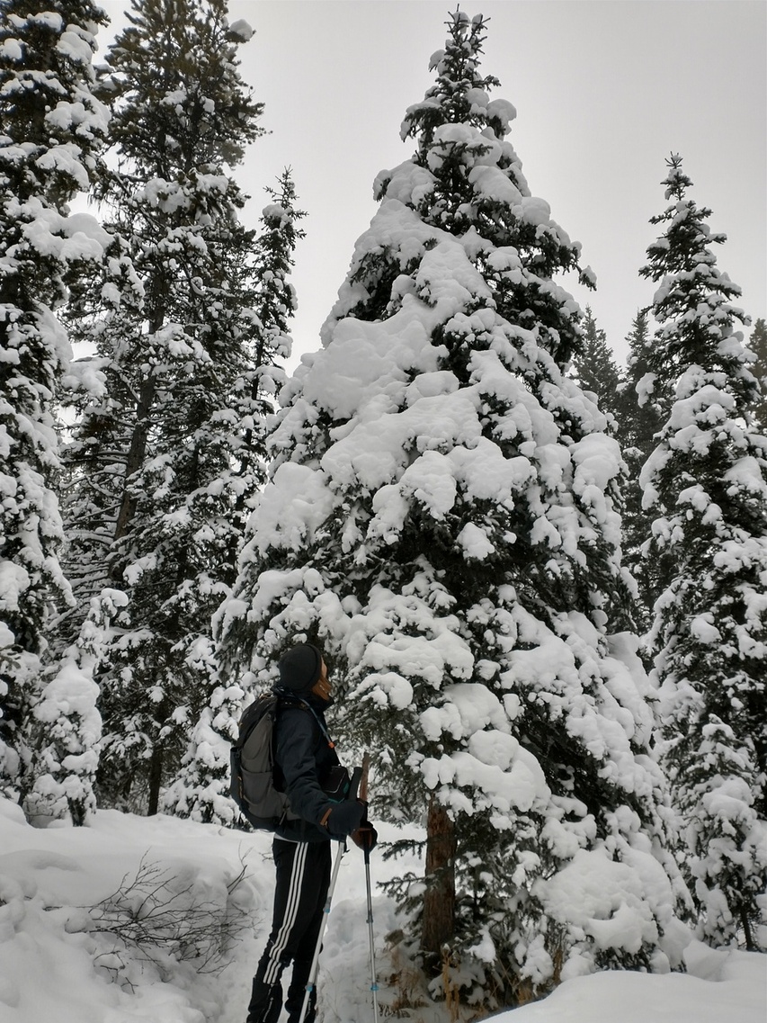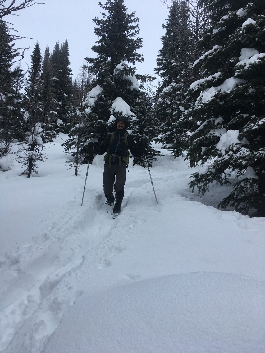 We took turns breaking trail through the powder, following the path of least resistance, avoiding dense patches of trees, and staying relatively close to the route our map showed. It was super fun creating our own, unique trail that might be followed by others later in the season! (Hopefully we did an okay job...) Photo credit: Dad
