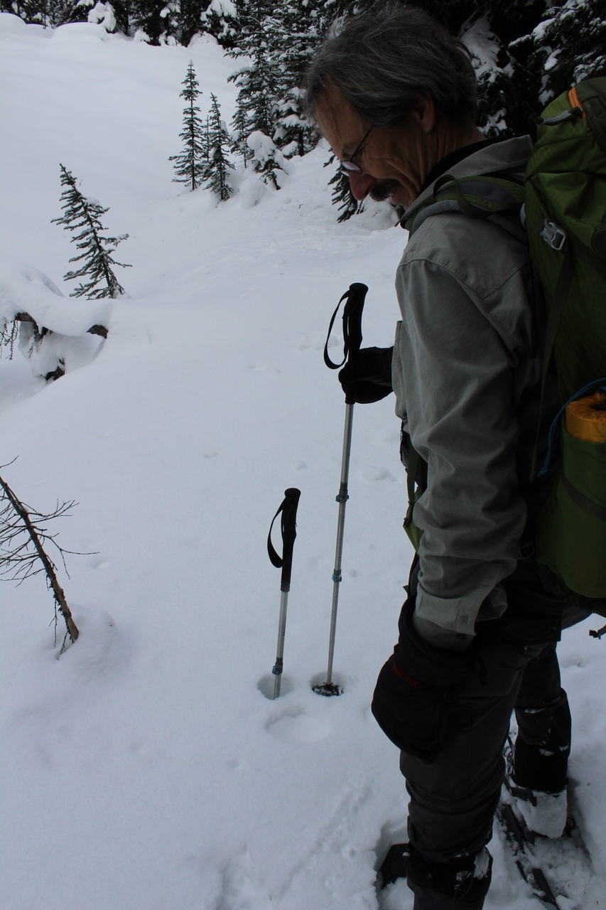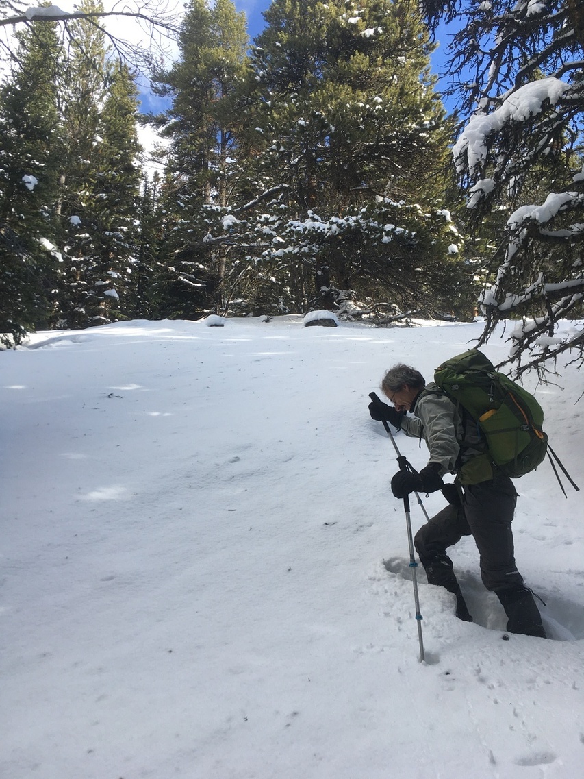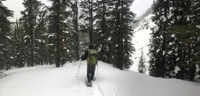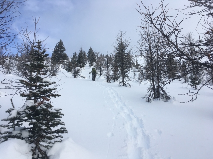 We took turns breaking trail through the powder, following the path of least resistance, avoiding dense patches of trees, and staying relatively close to the route our map showed. It was super fun creating our own, unique trail that might be followed by others later in the season! (Hopefully we did an okay job...) Photo credit: Dad