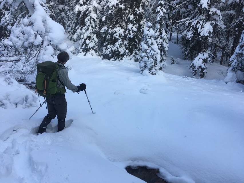 We got lucky and found this frozen "bridge" that allowed us to cross a flowing stream along the way!
