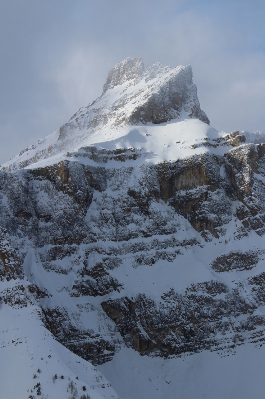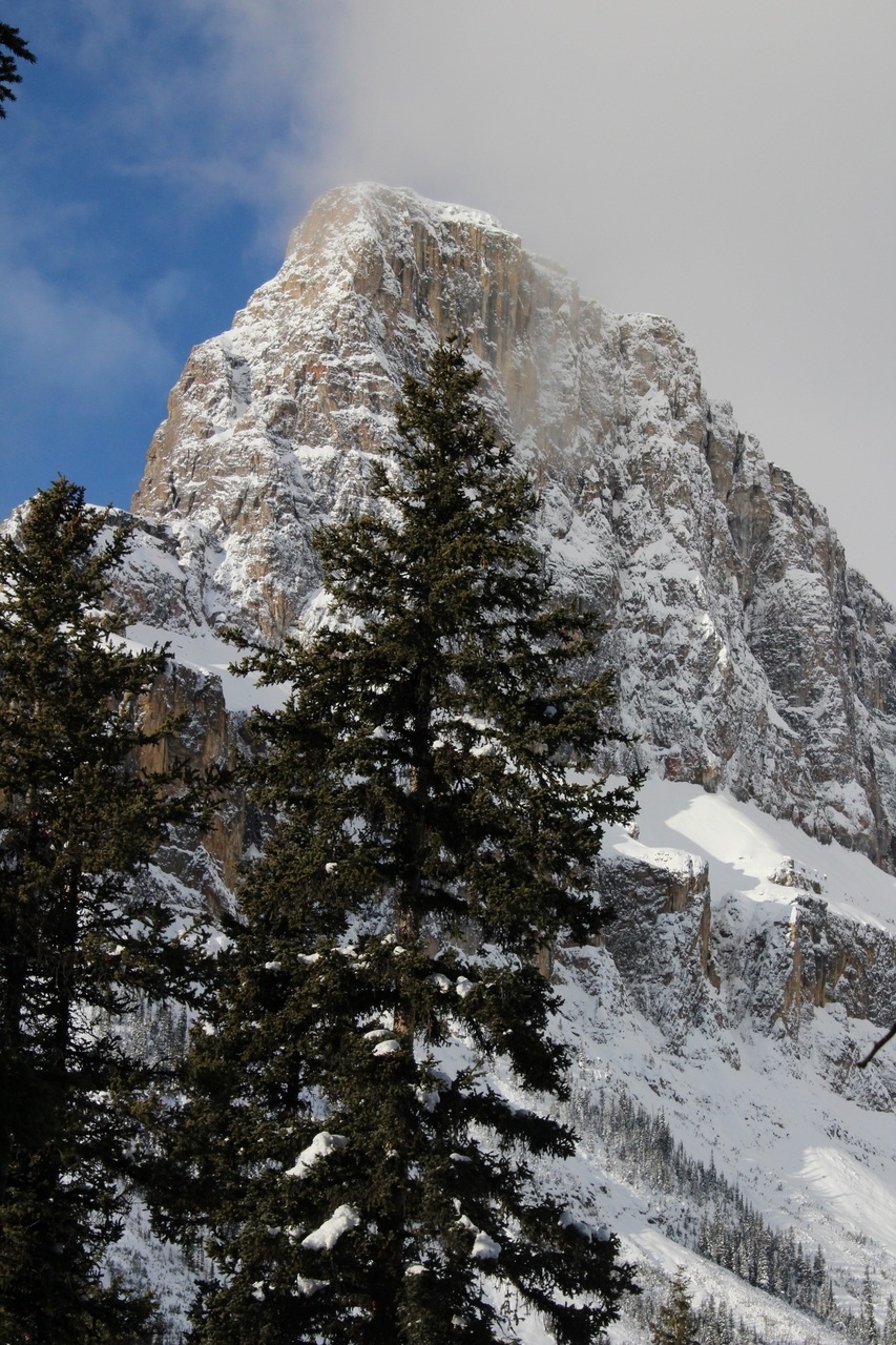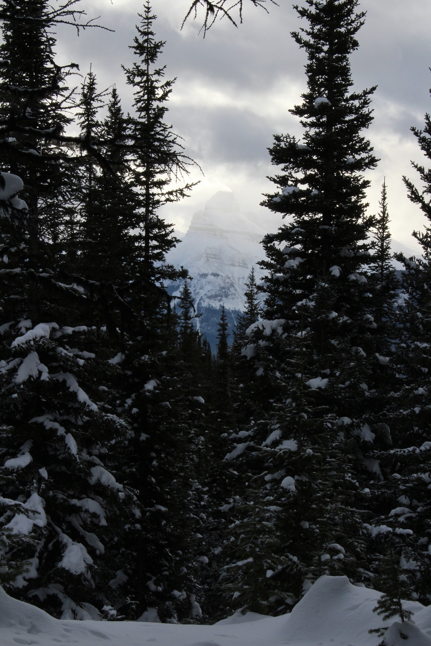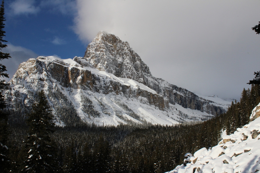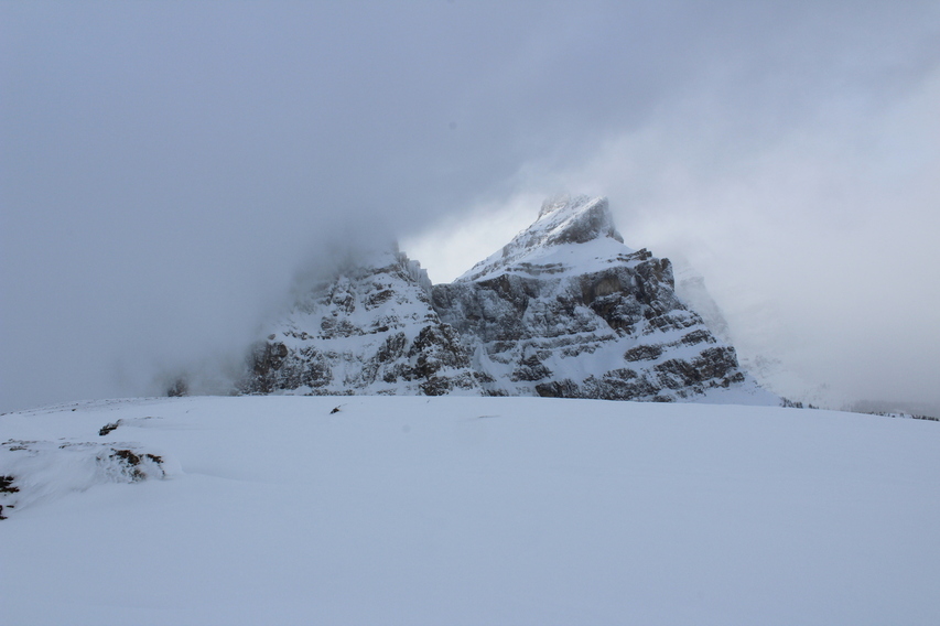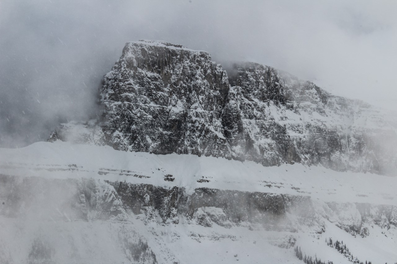 Eisenhower Tower and the summit of Castle Mountain (behind-right) break out of the clouds just for a second, producing this dramatic scene!