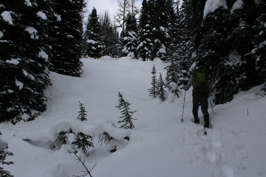 After a long 5(and a bit) km, we reached the point where our map claimed the route up Helena Ridge East Peak began! The pre-broken trail continued (left) towards Rockbound Lake, but we'd be the first of the season for where we were headed!!